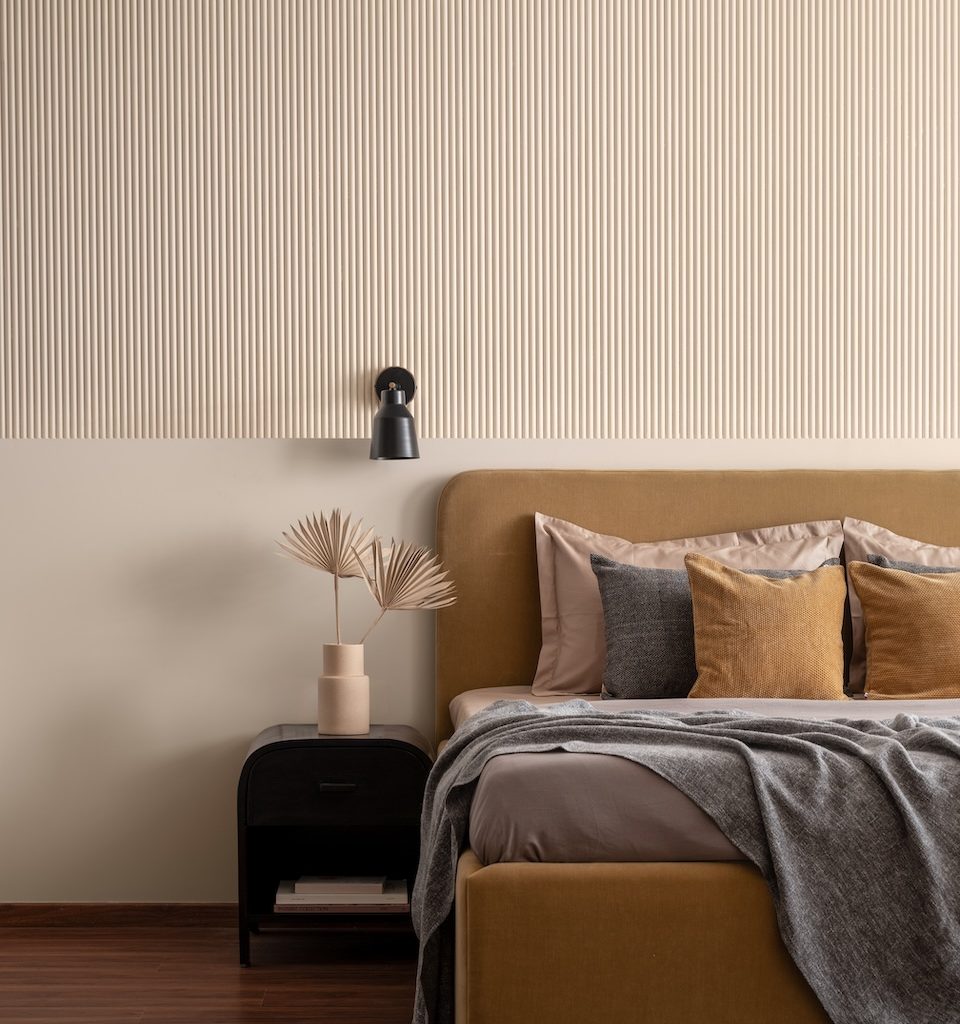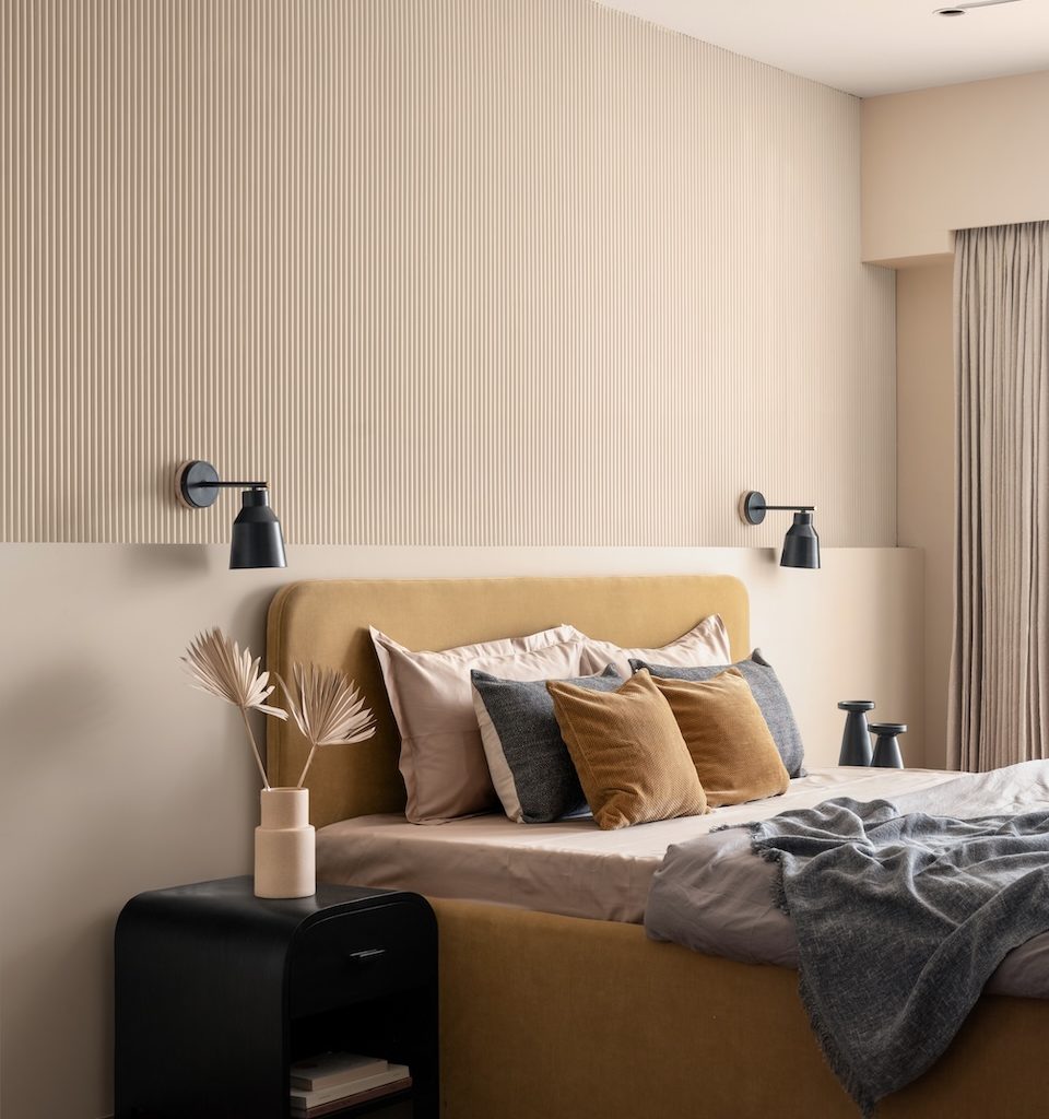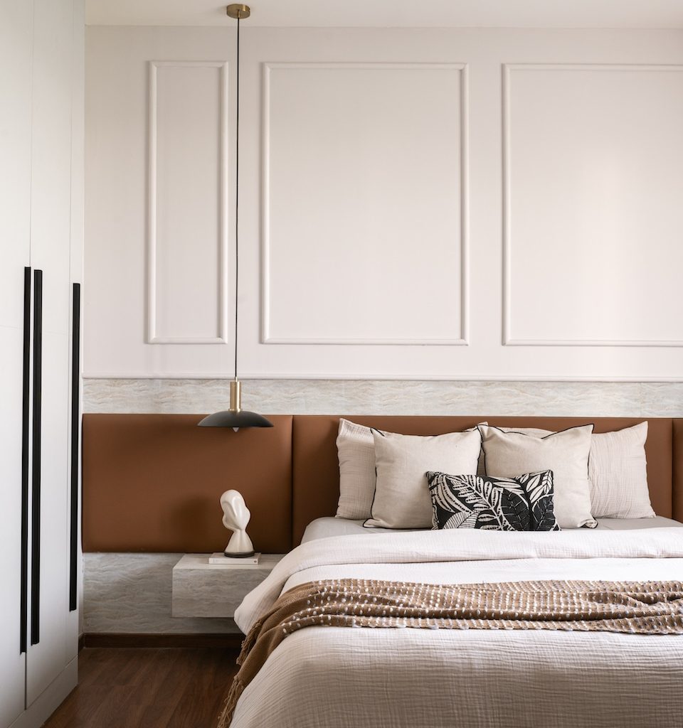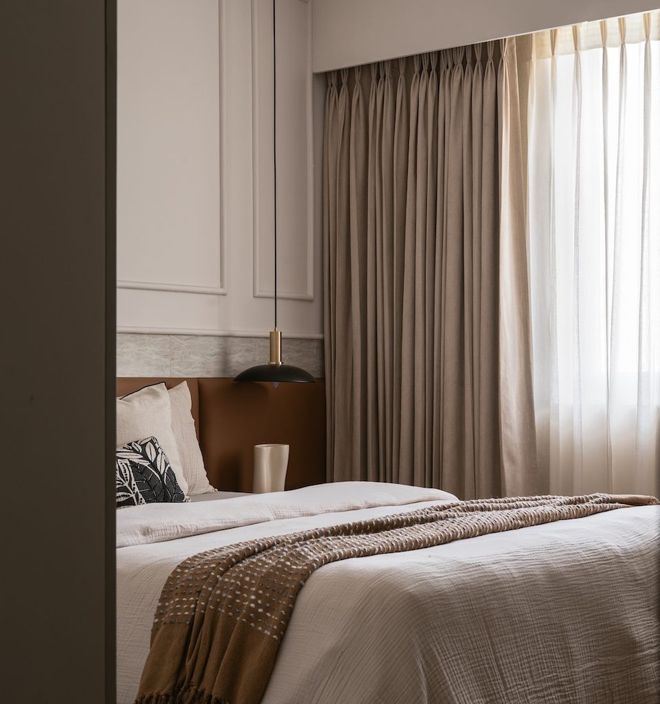 A study-guest room acts as a dual-purpose space, with a bay window that frames serene lake views—a corner for reading, music, or rest. The son’s bedroom is grounded in muted tones and dark wood, while the master bedroom balances sophistication and restraint with its fluted backdrop, tactile fabrics, and muted palette of brown, beige, and black.