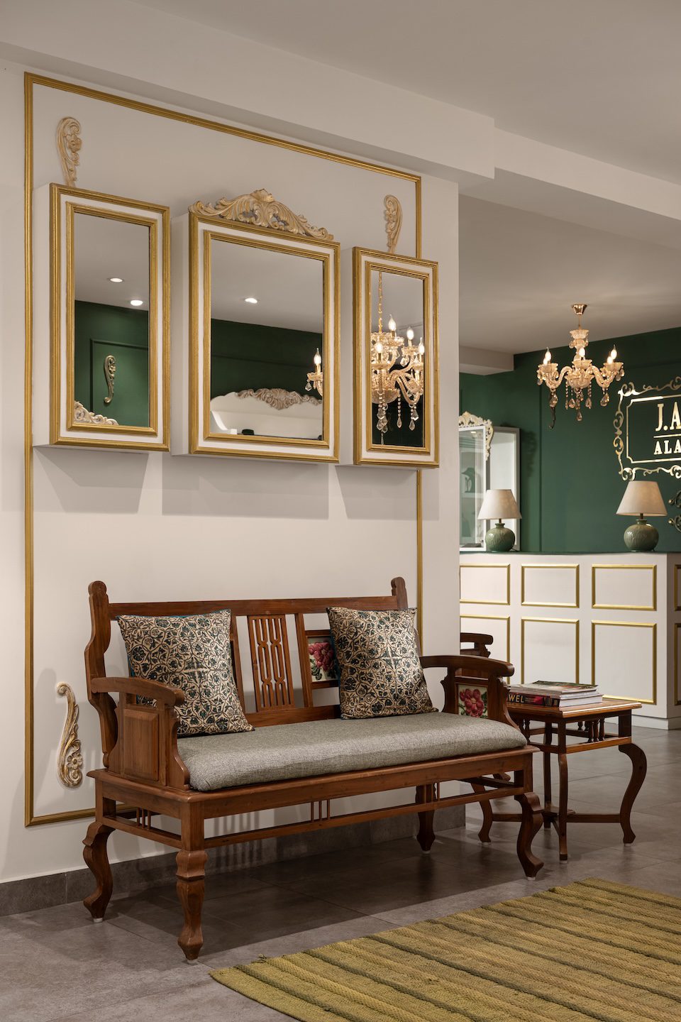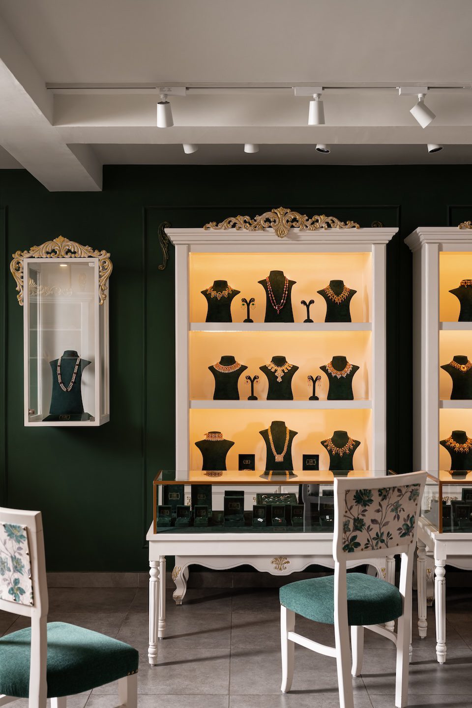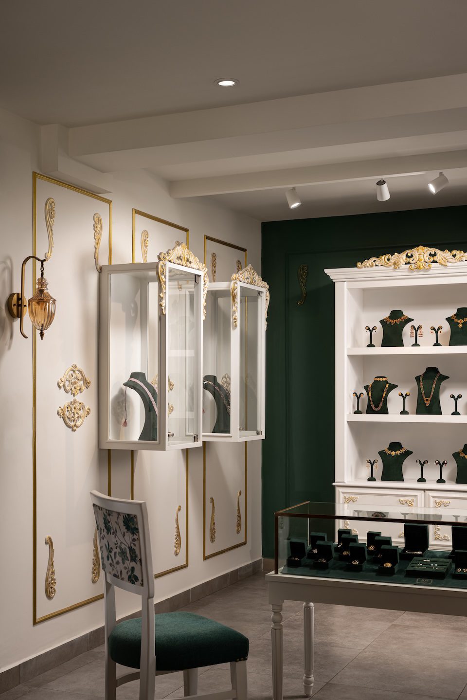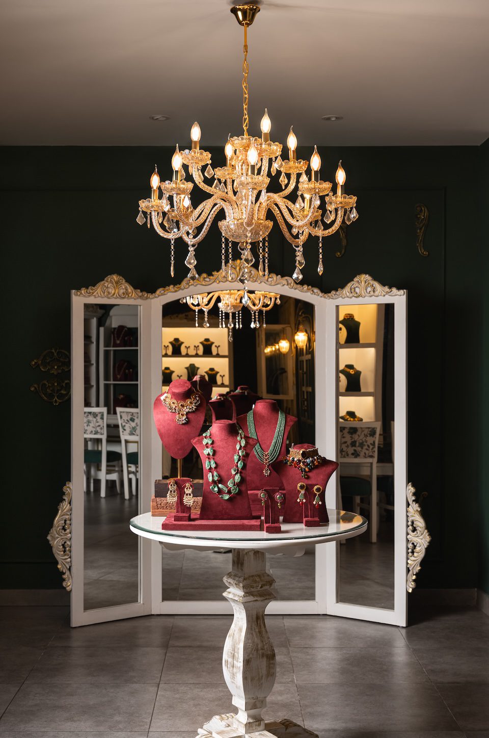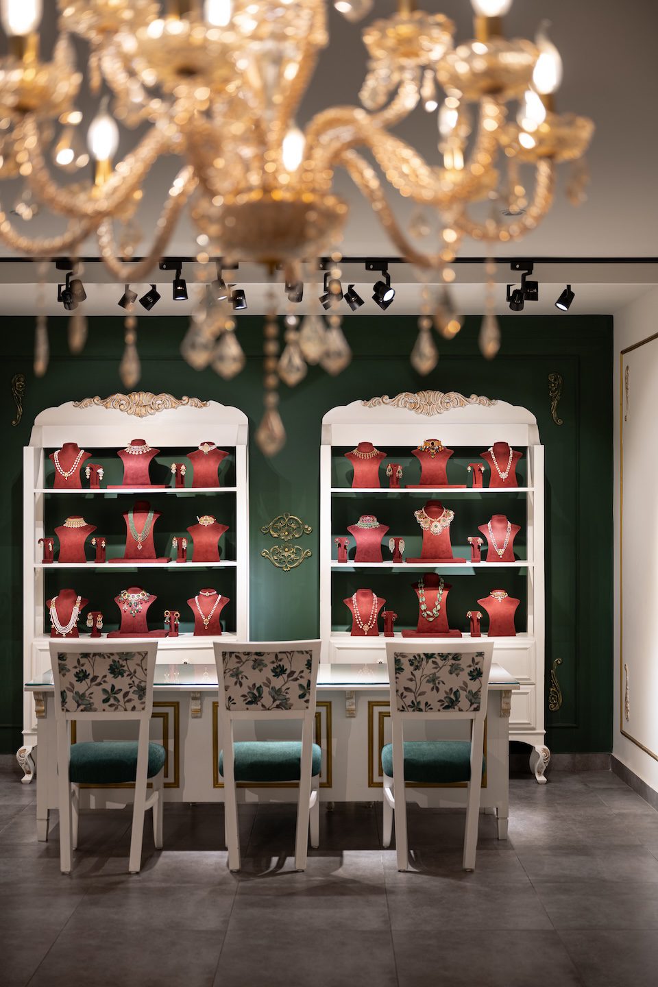 The colour scheme centres on English green paired with soft off white and touches of antique gold. This palette sets a refined backdrop that allows the jewellery to take focus. The flooring is finished in a cement texture, grounding the space and giving the movable display units and tables a clean stage to stand out. The furniture follows the same soft off white tone, with slender tables paired with floral upholstered seating that adds a gentle decorative note. Jewellery display necks in English green and maroon introduce contrast and richness, layered carefully against the walls to highlight each piece. Lighting plays a significant role in shaping the ambience. Multiple chandeliers bring warmth and a sense of occasion, with a statement fixture placed above the central round table. This table, dressed with display necks and backed by a gold accented three-way mirror, anchors the showroom as the primary focal point and expresses the understated luxury that defines the space.