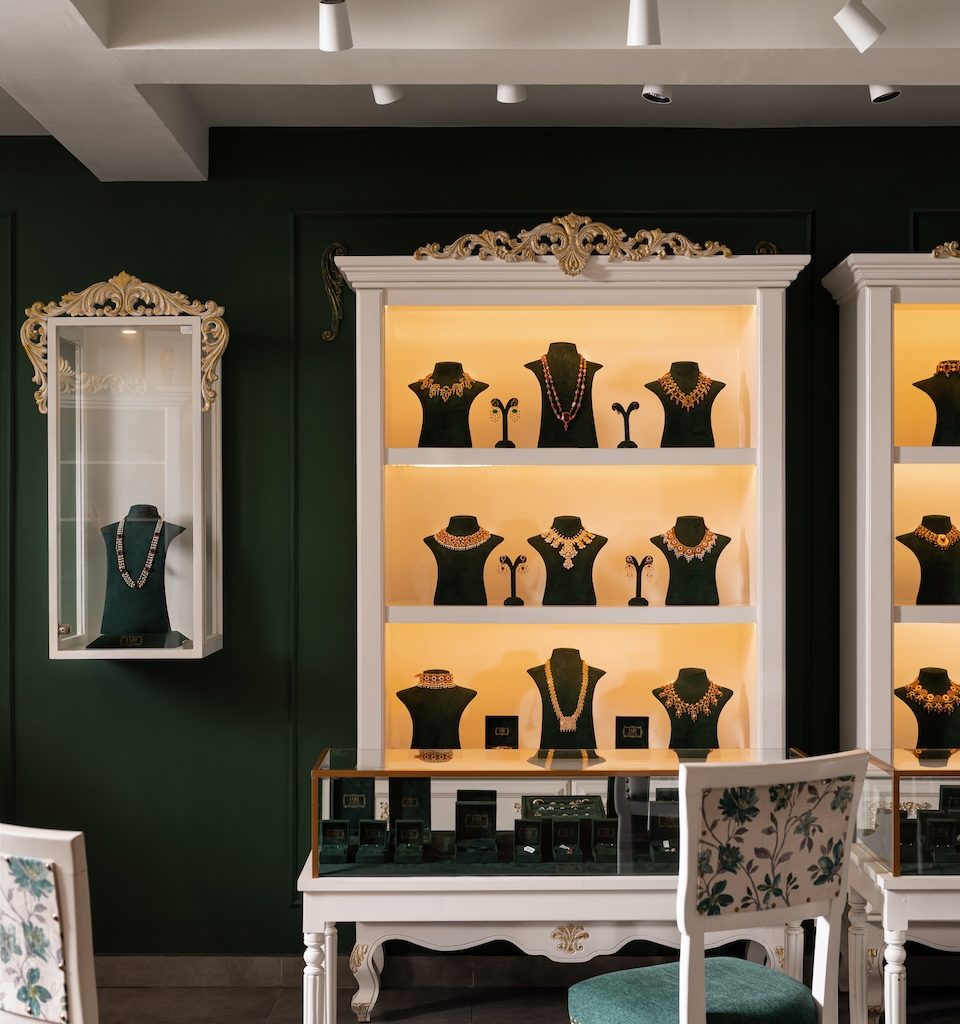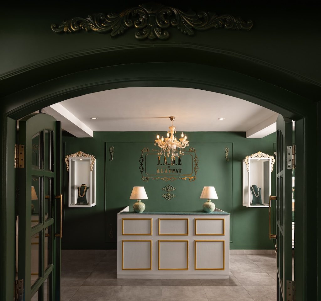 House of Design Architects brings together jewel toned accents and gentle contrasts to shape an elegant, intimate and bespoke setting for J.A.D.E by Alappat, a luxury gold jewellery showroom in Kochi.