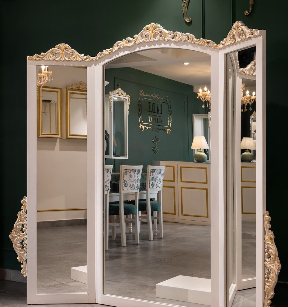 The experience begins at the arched carved entrance, painted in English green, which creates a memorable first impression and sets the tone for the boutique. At the heart of the showroom, the central round display table, chandelier and mirrored backdrop come together to form the most striking moment in the space. This ensemble strengthens the luxury narrative and anchors the visual hierarchy. Throughout the showroom, the contrast between deep English green, off white furniture and delicate gold accents defines the brand’s identity with clarity. The use of movable furniture adds an element of flexibility, allowing the layout to adapt to new collections while maintaining a cohesive and elegant setting.
