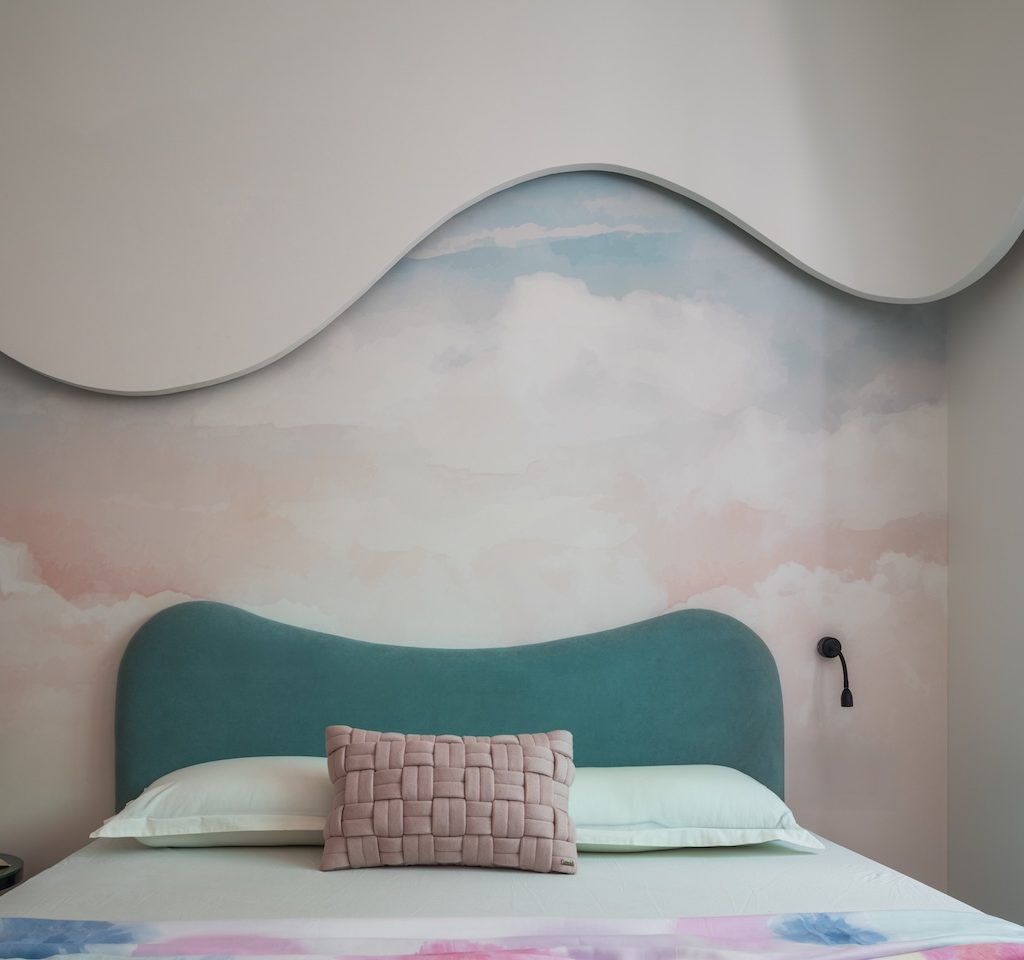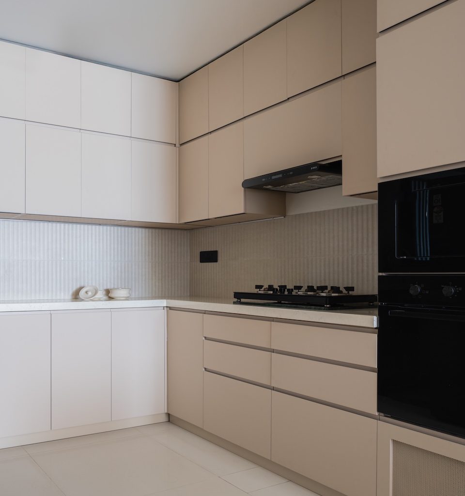 The kitchen continues this visual clarity with clean lines and a warm beige palette. The bedrooms carry forward the organic minimalism through individually calibrated moods. The parents’ room layers beige, brown and white with a curved ceiling and a custom wavy pelmet that ties the elements together. The kids’ room introduces gentle play through pastels and a cloud-patterned wallpaper, while maintaining the home’s visual quietude. The master bedroom adopts a more urbane greige palette, anchored by a sculptural moon panel that becomes its defining gesture. Circulation remains understated and light-led, allowing the home to feel more expansive than its footprint.