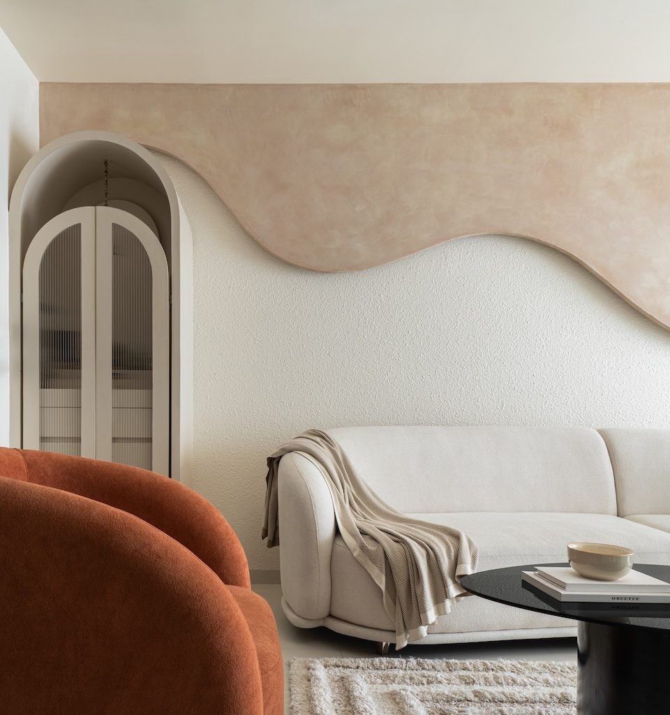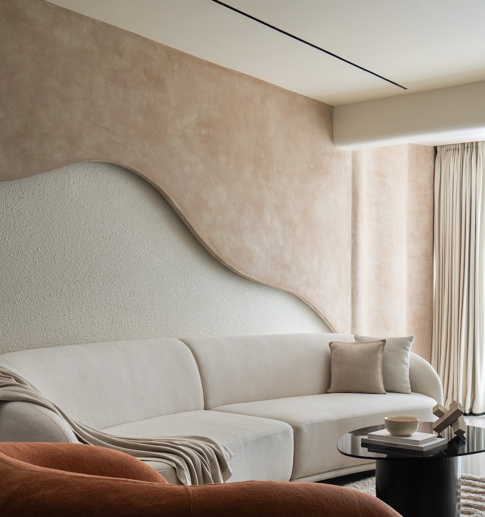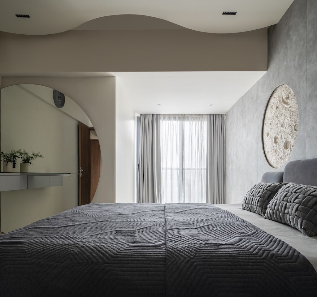 Signature details define the home’s identity: the sculptural moon panel in the master bedroom, the fluid ceiling waves in the kids’ room and the organically wrapped column in the living area. Each element acts as a quiet artwork, enriching the minimal envelope without disturbing its calm.