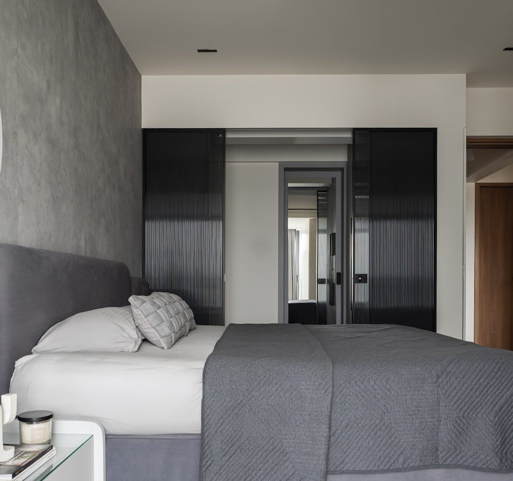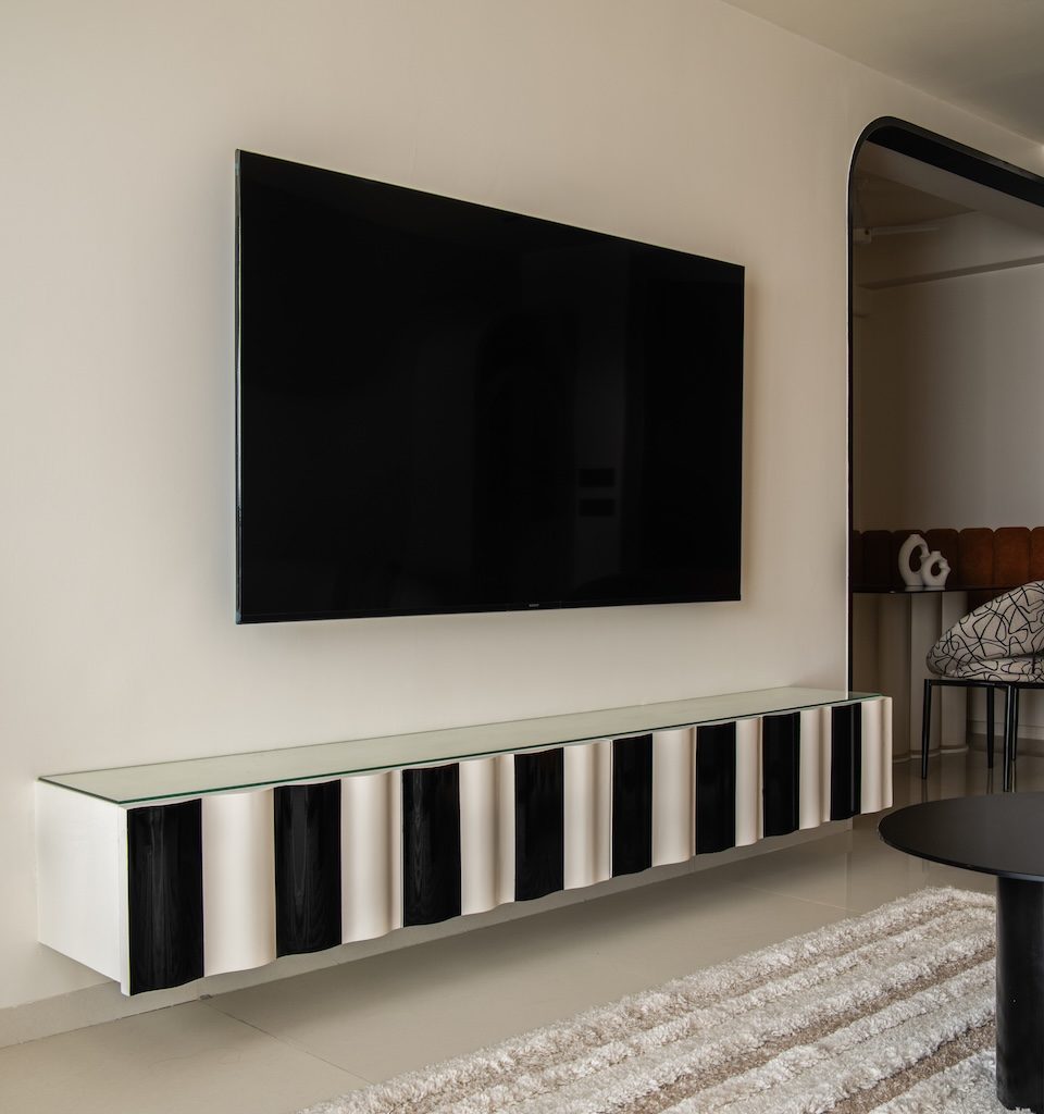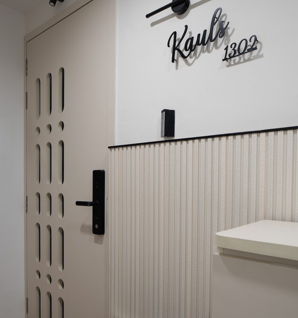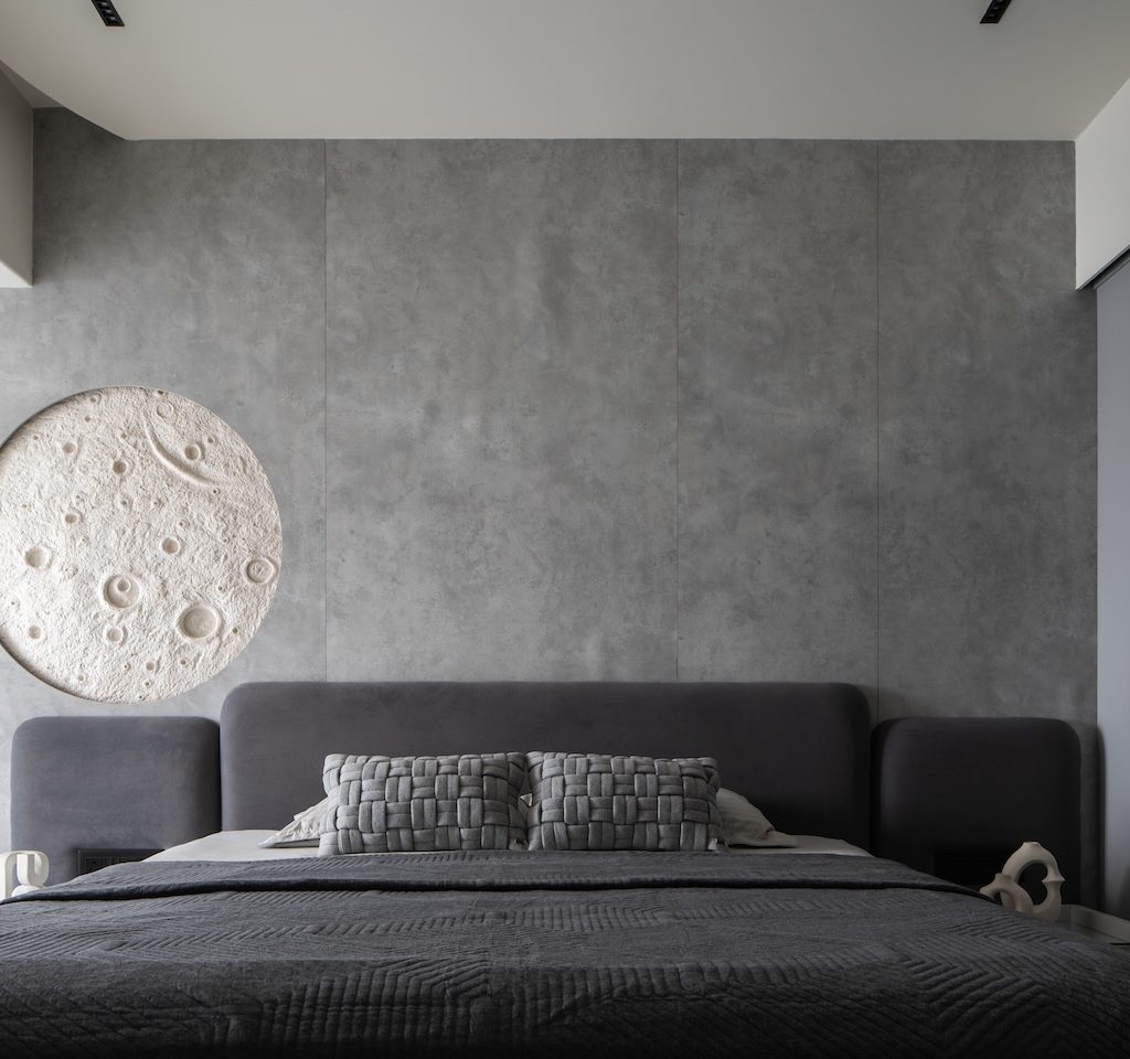 Signature details define the home’s identity: the sculptural moon panel in the master bedroom, the fluid ceiling waves in the kids’ room and the organically wrapped column in the living area. Each element acts as a quiet artwork, enriching the minimal envelope without disturbing its calm.