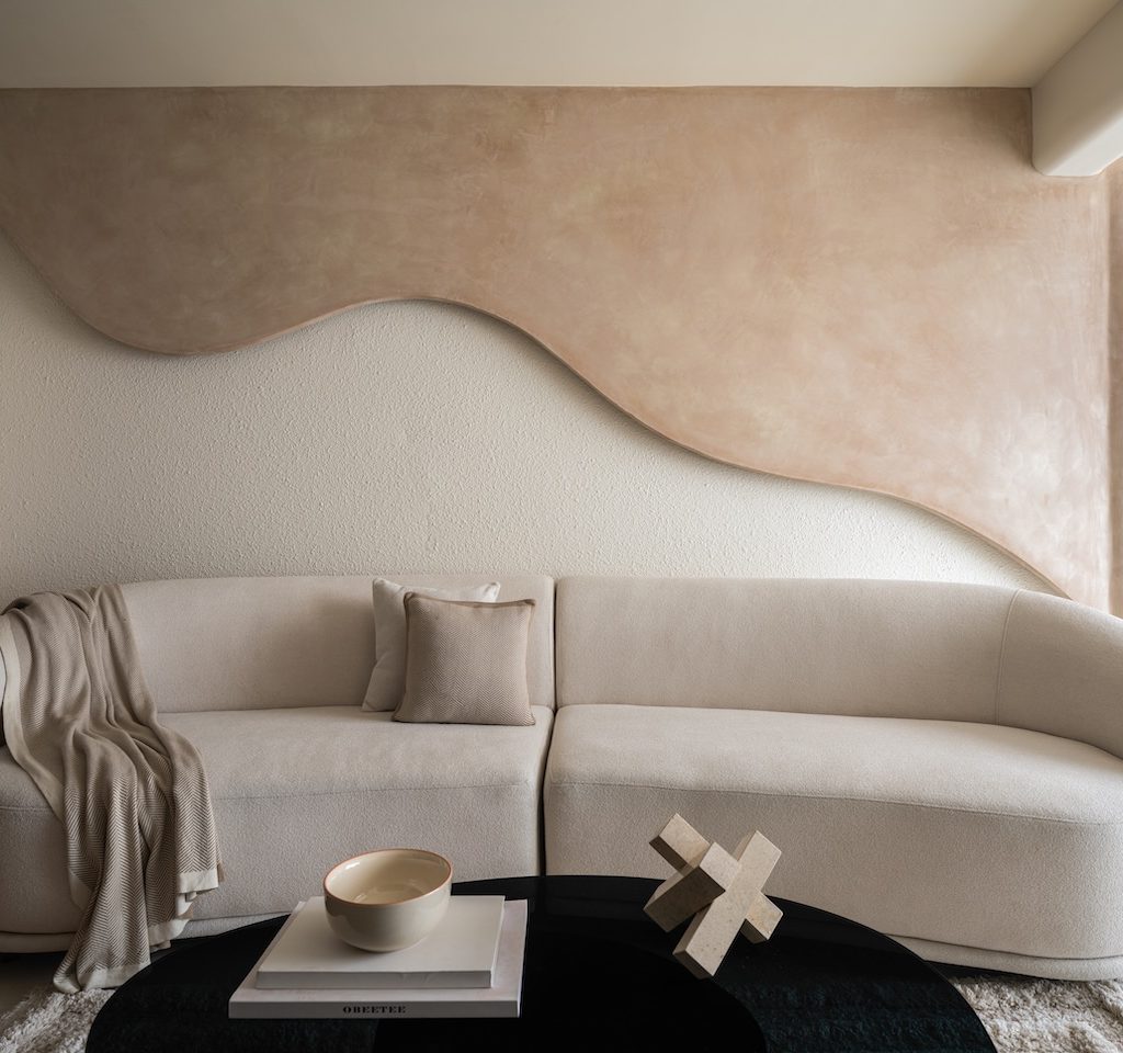 Muted whites, beiges and greys create the home’s foundation, complemented by stone-effect textures, curved plaster forms, metal detailing and solid laminates. Soft furnishings in neutral tones enhance the warmth, while sculptural ceiling waves and textured panels add tactile interest. The palette is intentionally pared back, relying on organic movement and subtle contrast to evoke quiet luxury.
