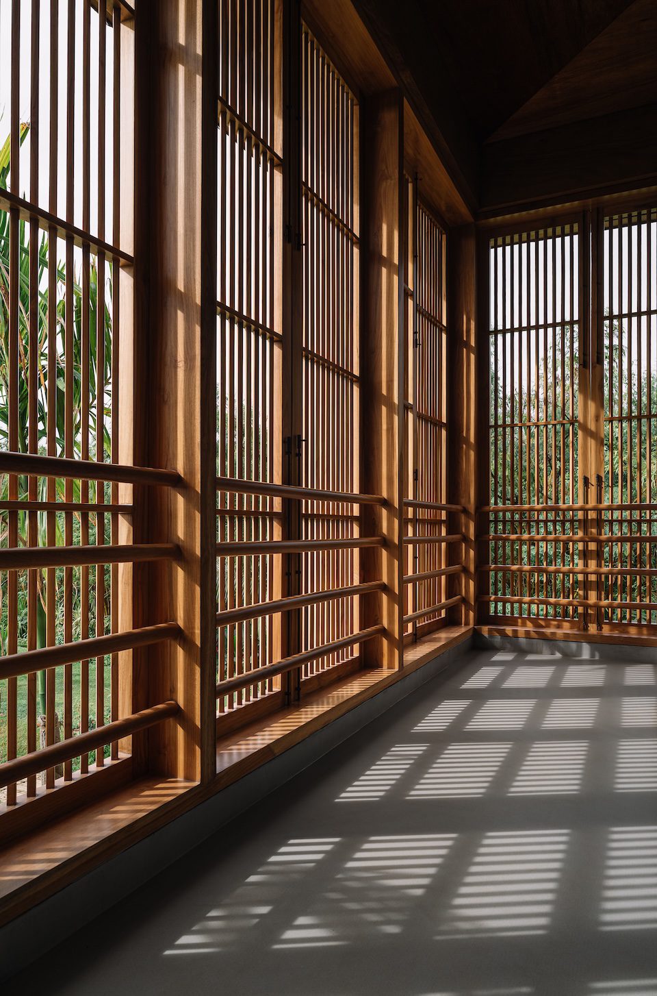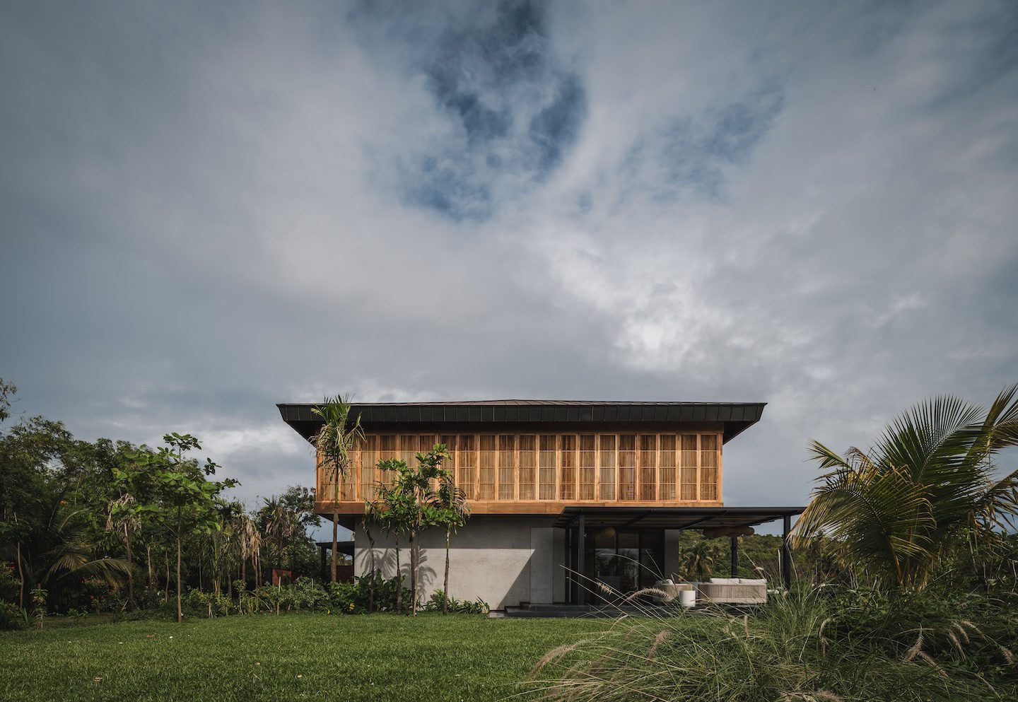A freestanding metal staircase rises through the double-height lobby volume to the first floor. Four bedrooms and a family lounge are arranged along the perimeter of this level, connected by a continuous balcony lined with operable teakwood louvres. These screens soften the tropical sun, filter breezes and create a cohesive circulation loop that feels sheltered yet open. From the pool deck, a discreet stair descends to the lower ground level, where a spa with steam, sauna and changing rooms forms a dedicated zone for wellness.
