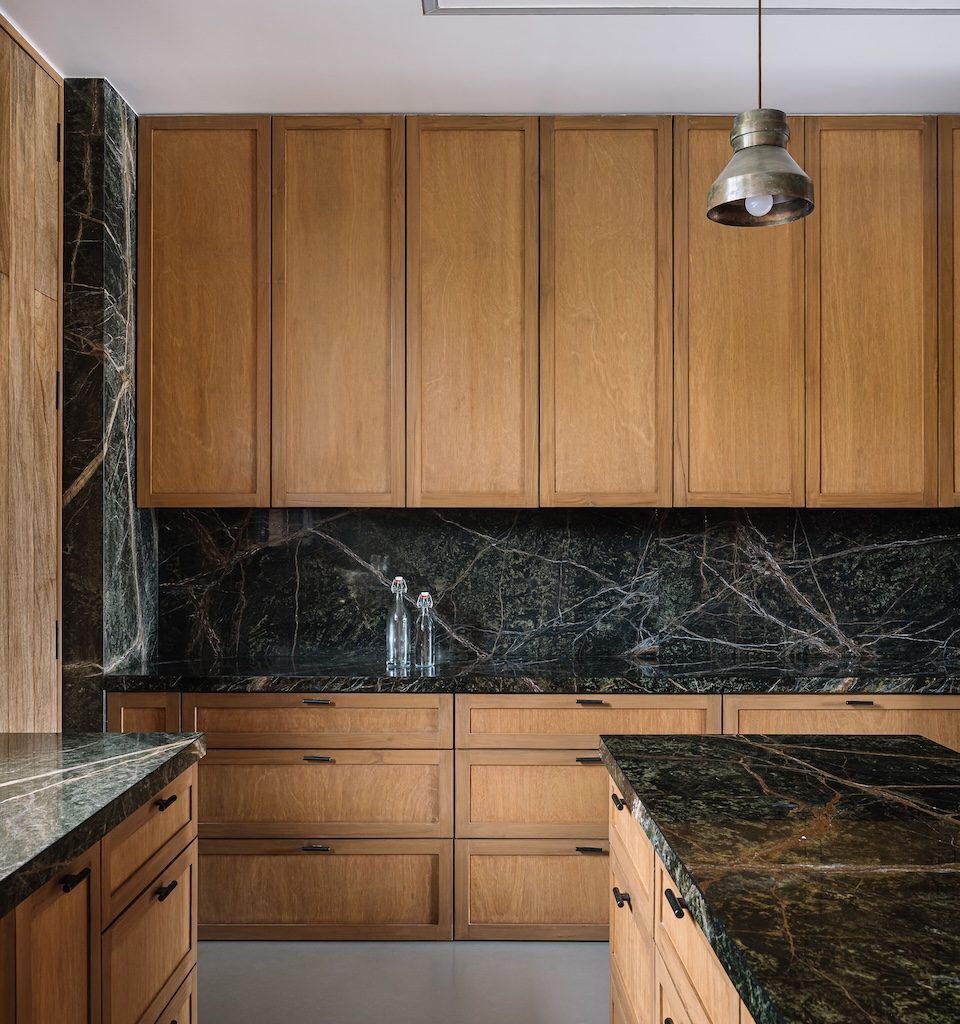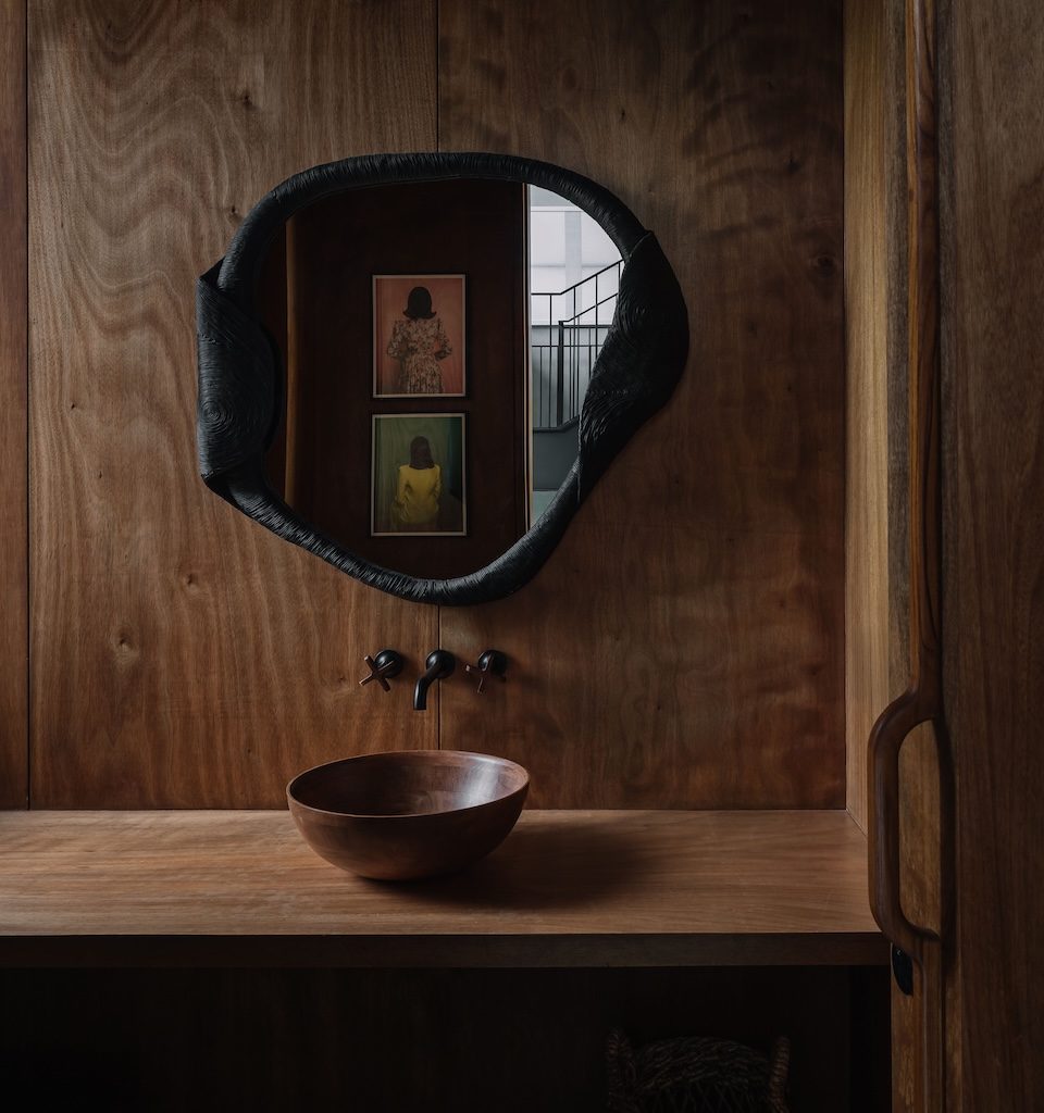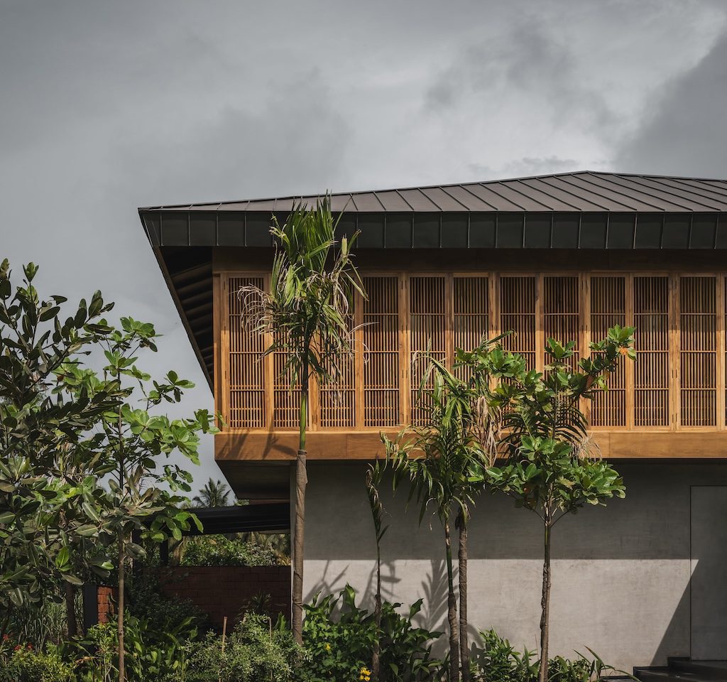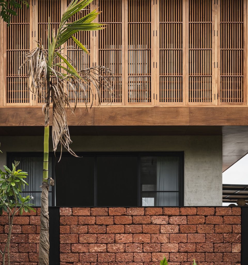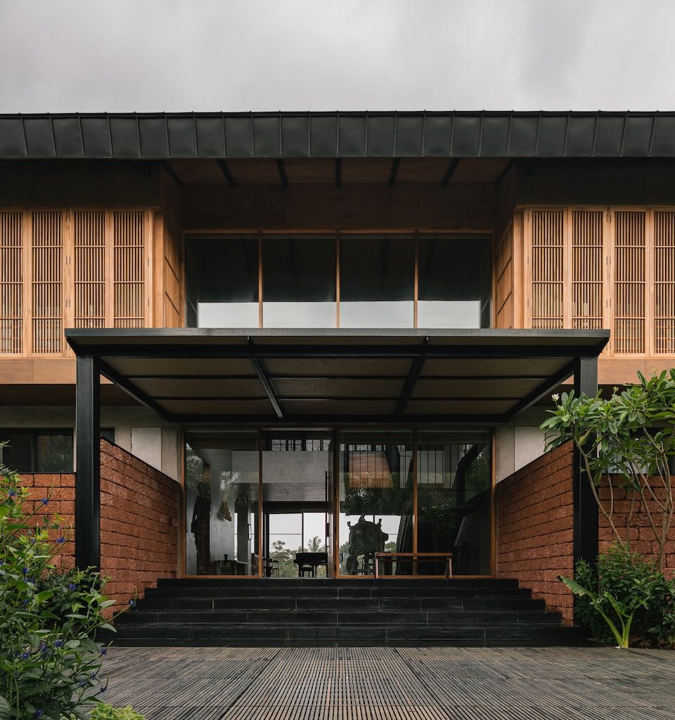 The design language of Salt Pan House is expressed through a three-part architectural composition—a sculpted exposed concrete base supports an upper volume wrapped in teakwood louvres, while a lightweight titanium zinc pitched roof completes the structure with a sense of lift. This palette continues at the entrance, where a steel framed canopy and laterite thresholds lead into a double height lobby finished in polished cement plaster and centred around a freestanding metal staircase.