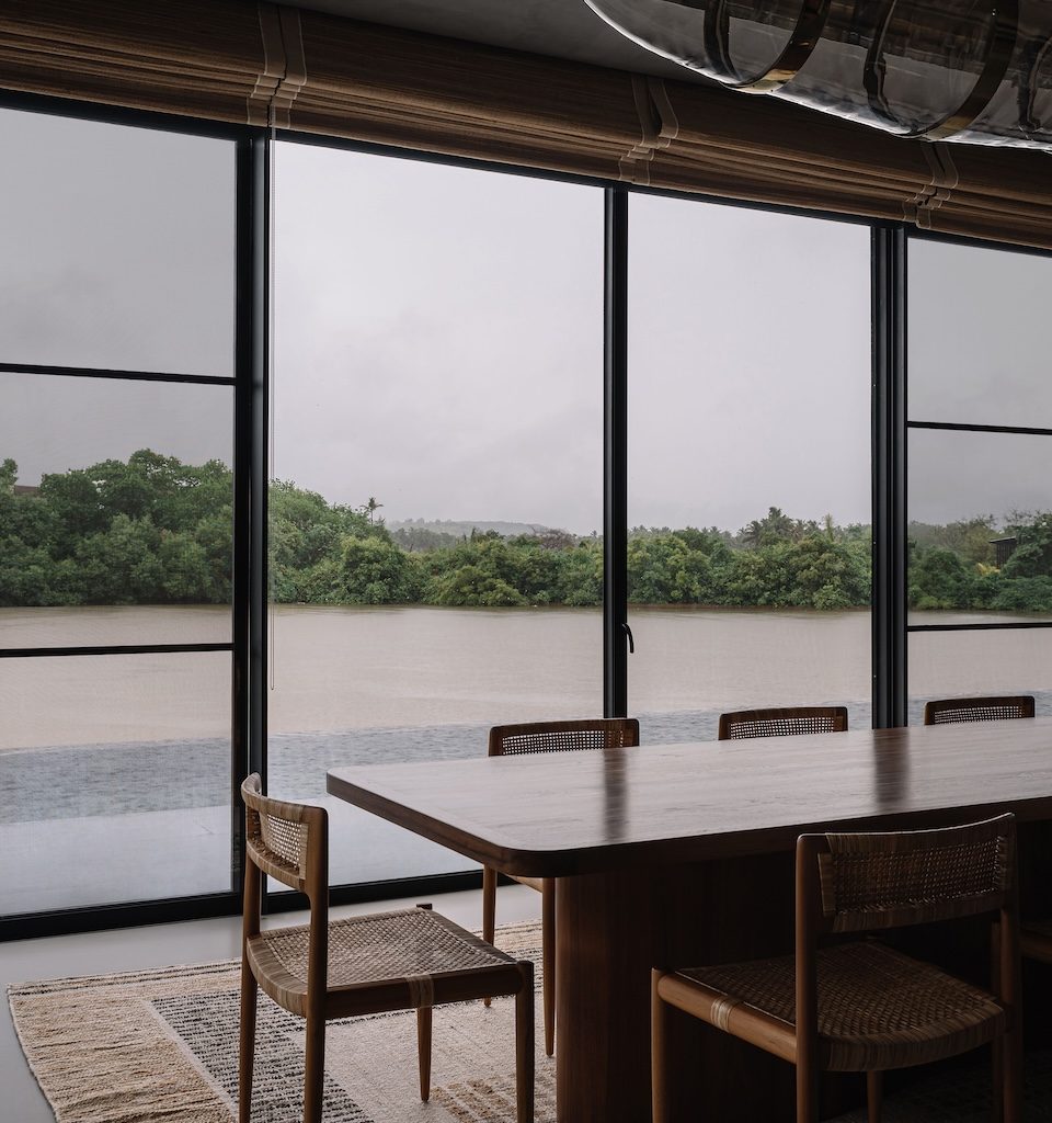 The site sits on a secluded 10-acre property bordered by the river on one side and a dense mangrove belt on the other. Three man-made salt pans define the terrain, creating a reflective landscape that immediately establishes both the mood and the architectural direction. These pans act not only as the conceptual anchor for the home but also as its physical determinant, influencing orientation, proportion and the way the structure reaches outward into the landscape. Positioned along the southern edge of the largest salt pan, the house is able to take in long, uninterrupted views across the shimmering water.