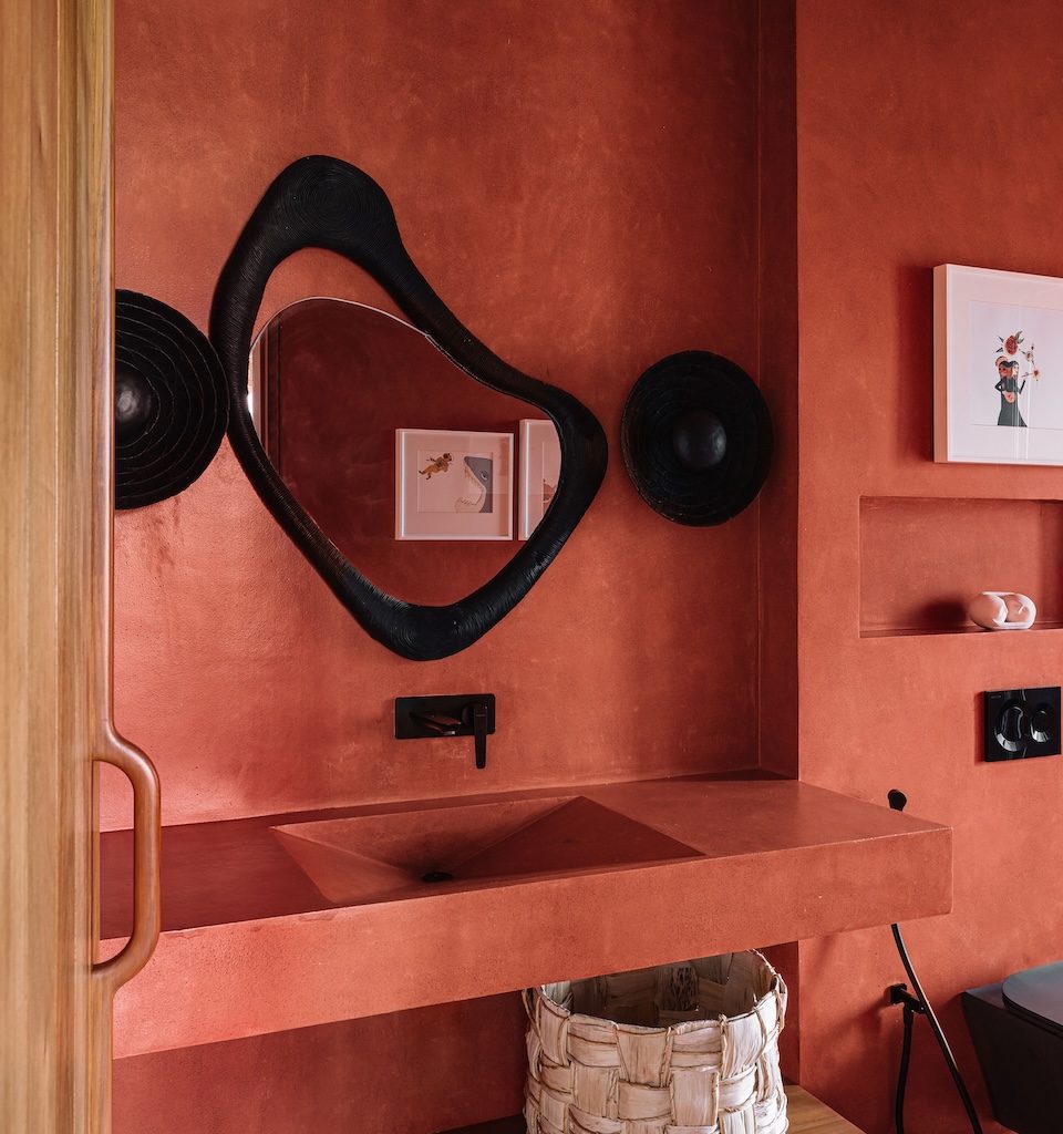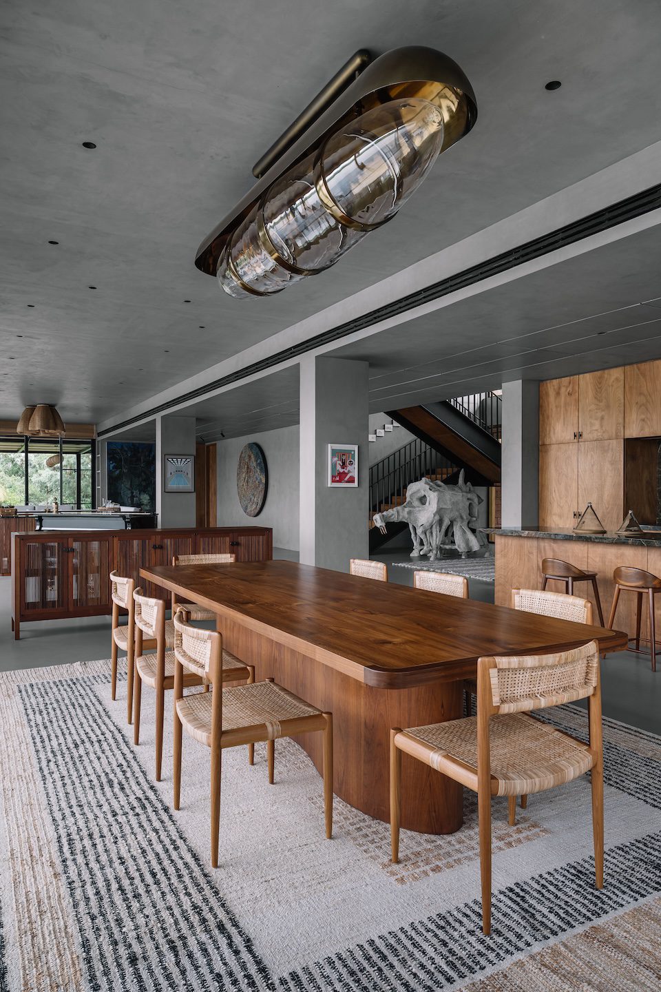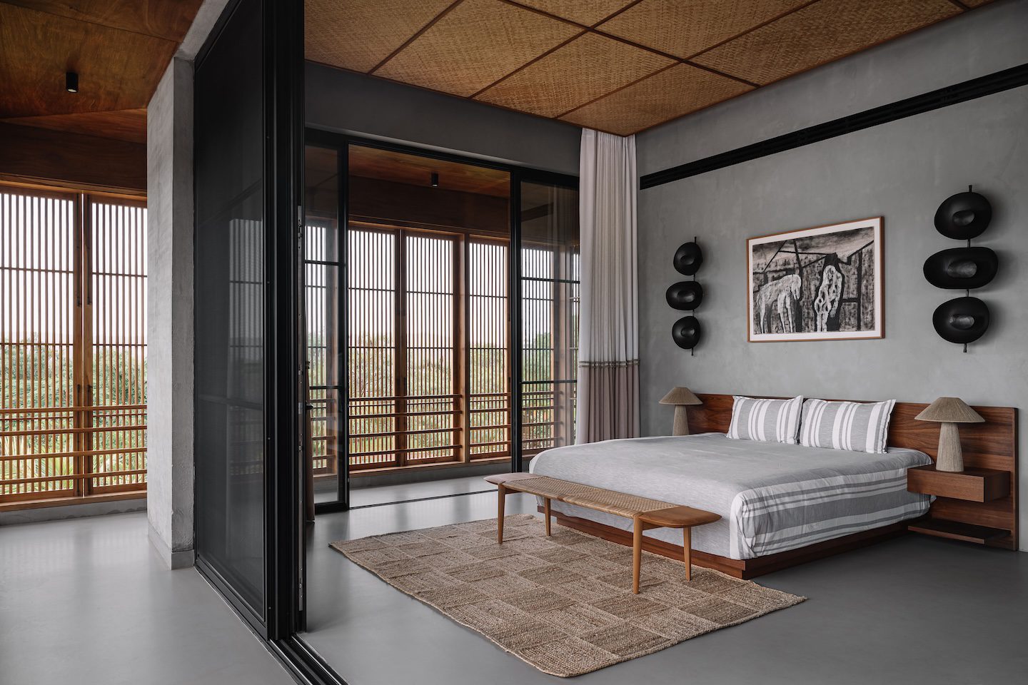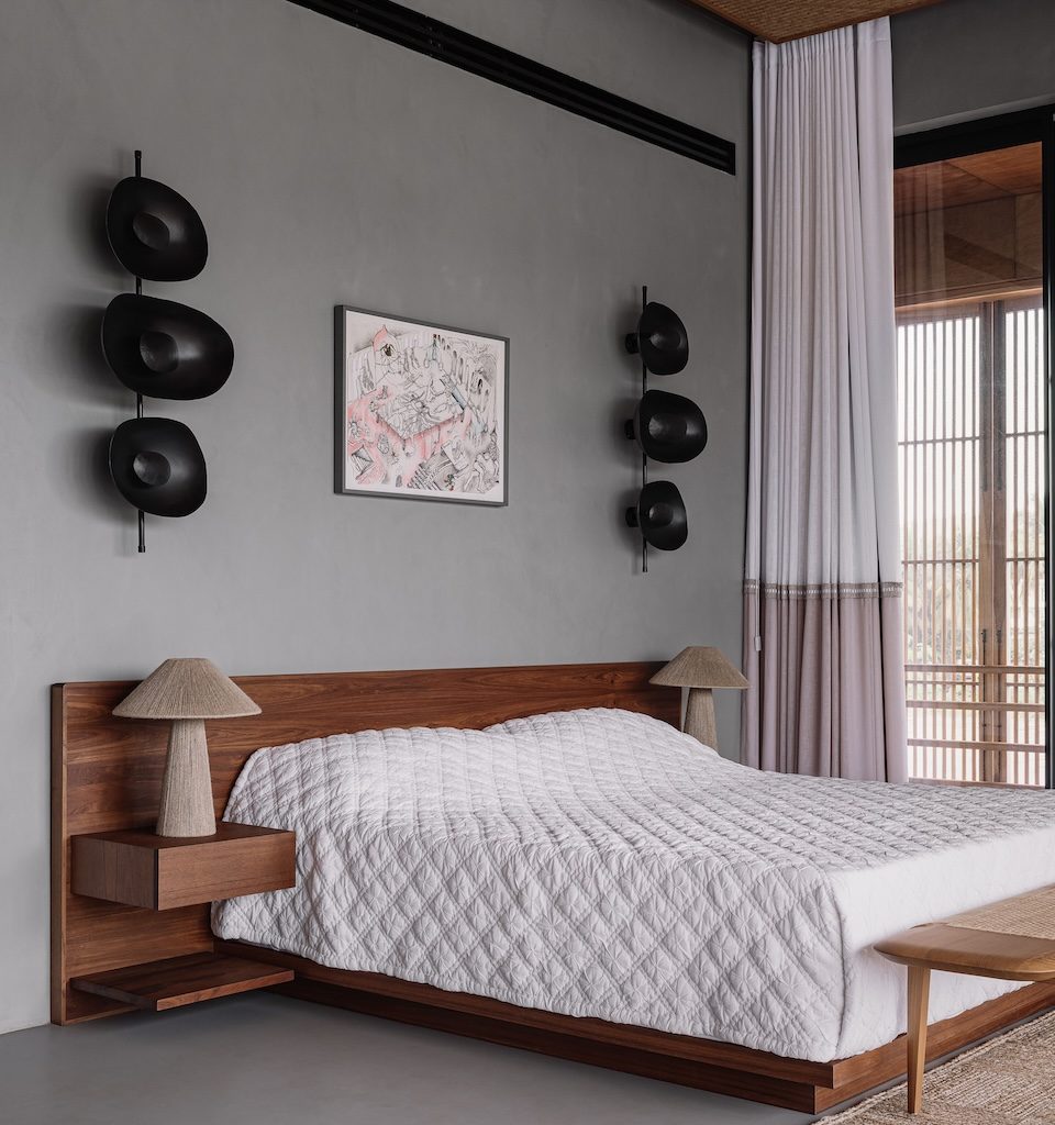 The living, dining and bar areas carry forward this sense of material honesty. Expansive glazing opens the spaces to the landscape, while cement plastered walls in earthy colours sit alongside cane and exposed plywood accents. Furniture crafted from Indian wood and richly veined granite adds depth, and contemporary artworks from the client’s collection introduce moments of colour and culture. Positioned to look into a lush garden pocket, the ground floor guest bedroom echoes this warmth through concrete surfaces, timber details and textiles in muted tones.