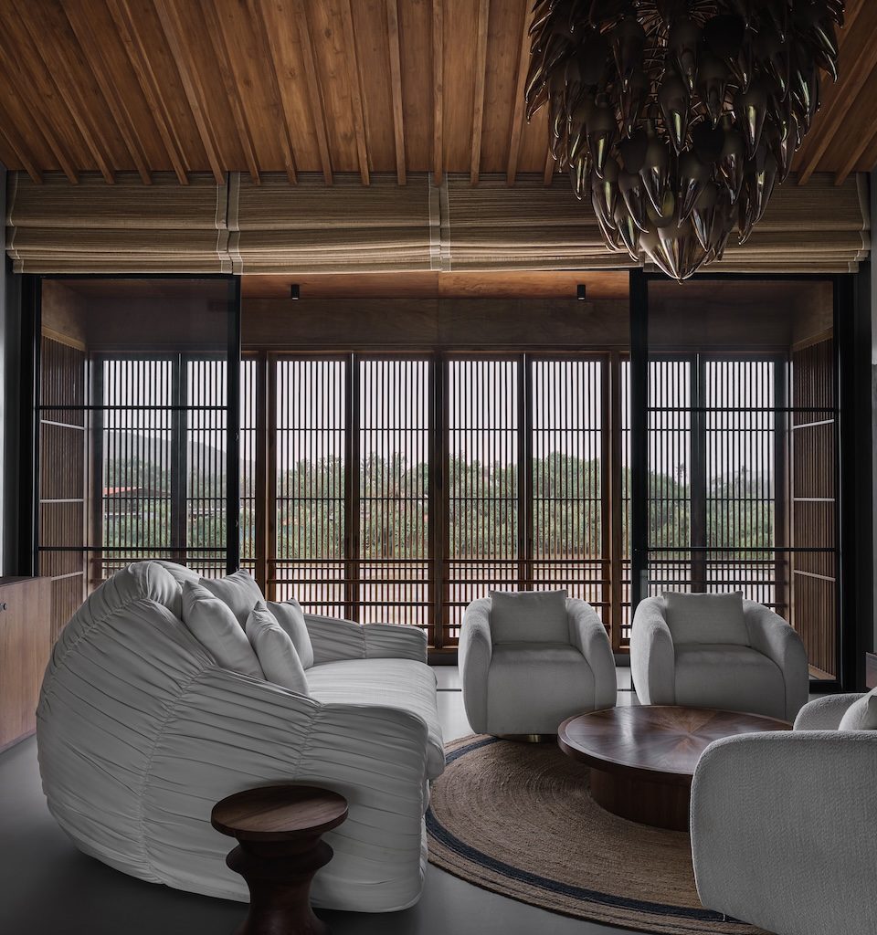 The first highlight of the Salt Pan House is expressed in its architecture, where a three-part vertical composition brings clarity to the built form. A grounded concrete base supports a teakwood louvred volume, which is then sheltered by a pitched zinc alloy roof, creating a layered structure that feels measured and composed. This architectural language extends effortlessly into the landscape. The long swimming pool reaches toward the salt pan, its infinity edge dissolving into the reflective waters beyond and deepening the home’s connection to its setting.