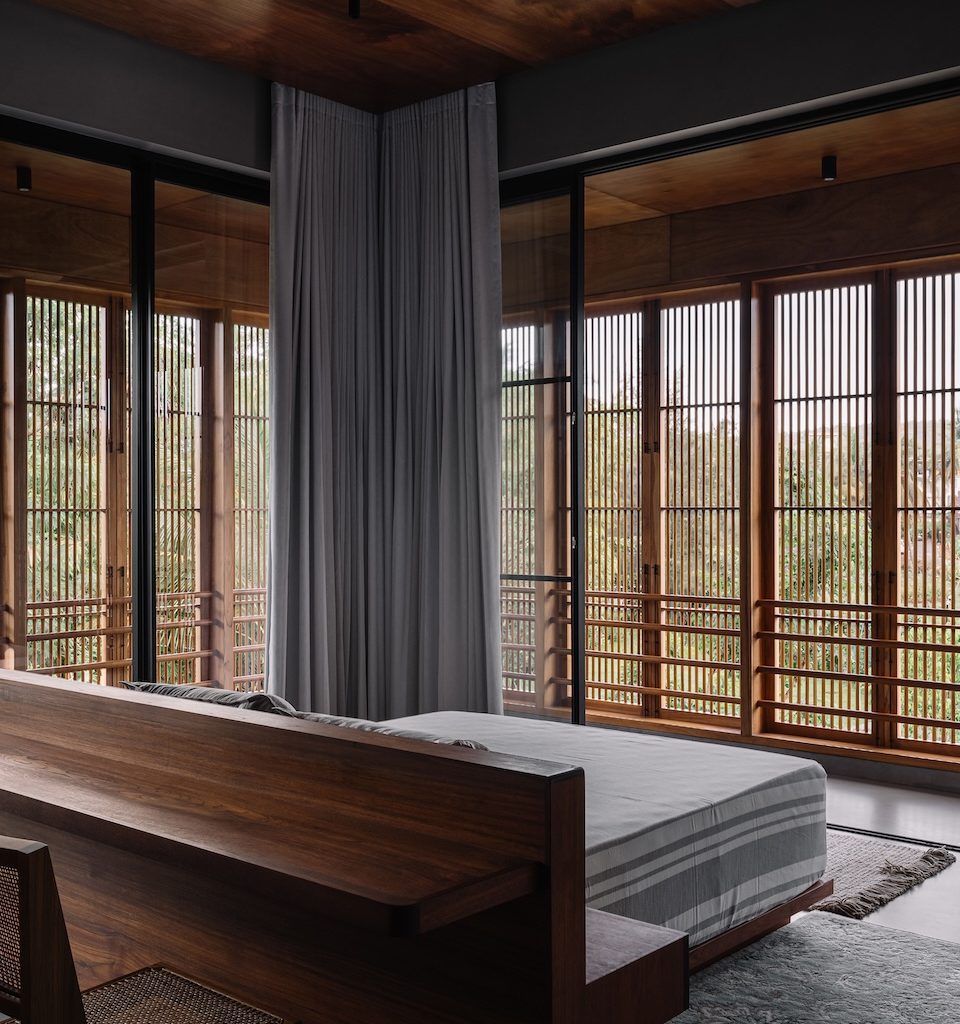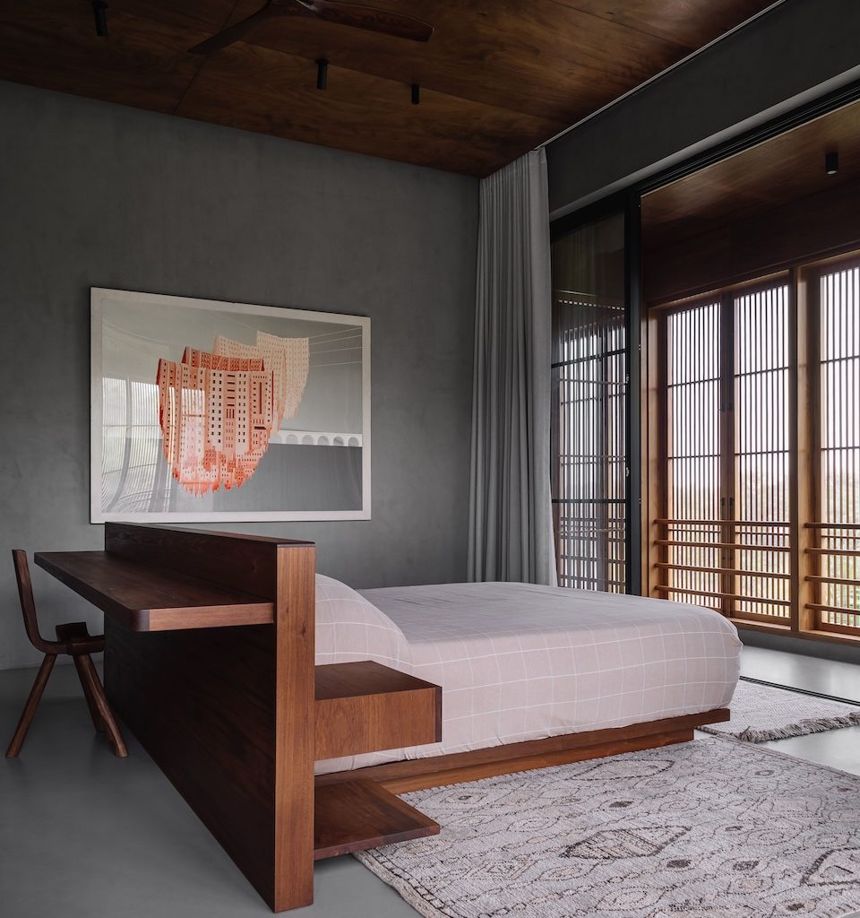 The design rests on a philosophy of elemental architecture, where climate, context and material purity guided every decision. The home was not imagined as something to be adorned, but as something to be uncovered slowly, allowing its form and experience to emerge through light, proportion and material. “The intent was to craft a vertical triptych of materials: a raw concrete base; a teakwood louvered middle volume; and a lightweight titanium-zinc alloy roof. This layered approach balances mass and lightness, opacity and permeability, creating a home that sits quietly in the landscape yet carries a powerful presence,” explains Sahil.