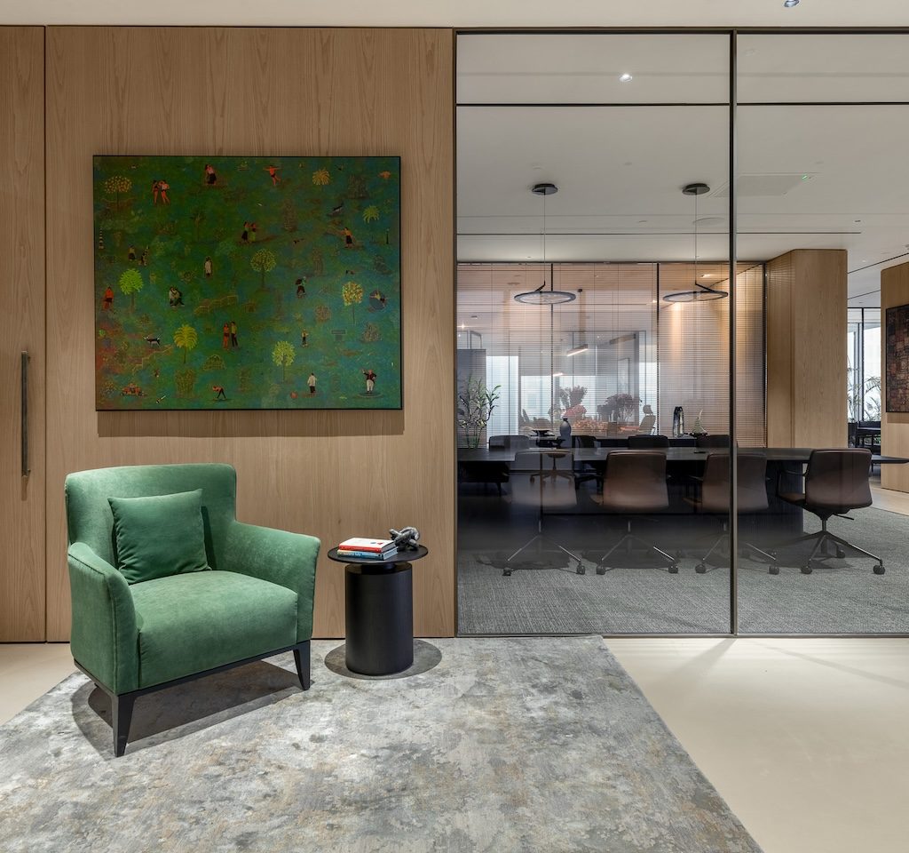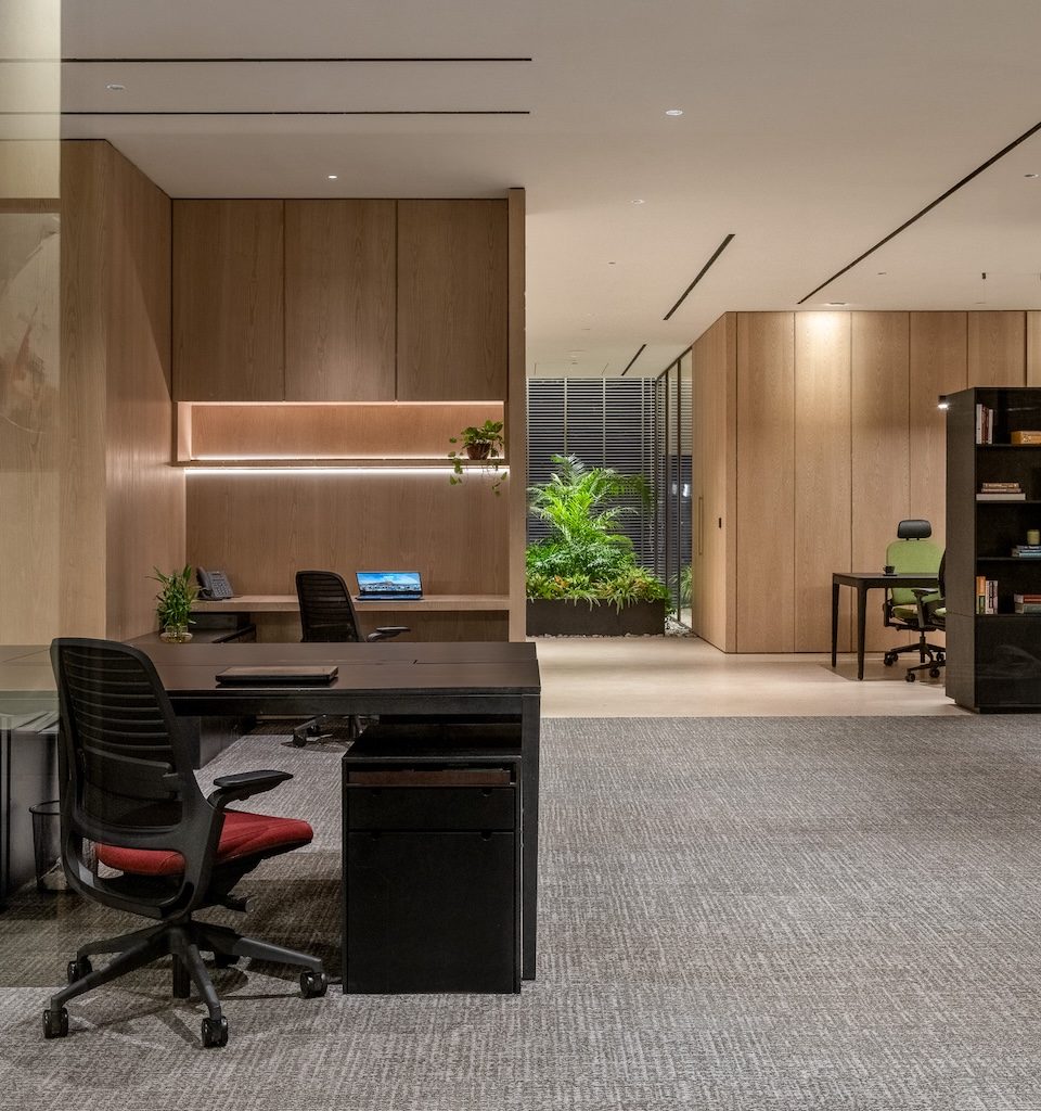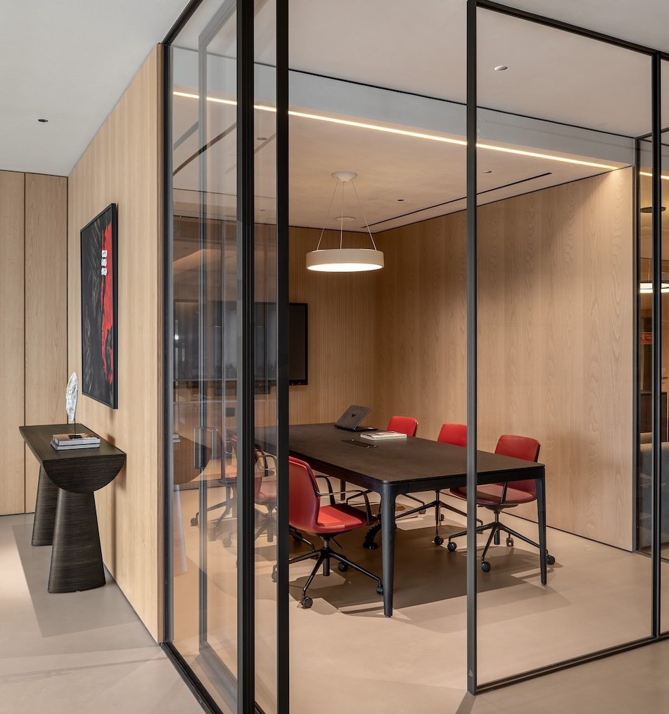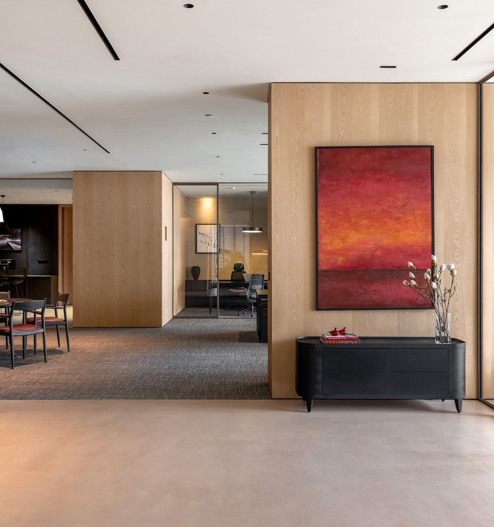 The interiors rely on a triad of materials: natural veneer, glass and lime plaster. This restrained palette creates a serene, monotone backdrop that highlights the quality of light and the clarity of the layout. Slot diffusers replace conventional AC grills for a seamless ceiling plane, while slender, custom-detailed furniture keeps the environment visually light. Art, vibrant upholstery and layered planting introduce finely measured colour inspired by the brands’ red and green identities.