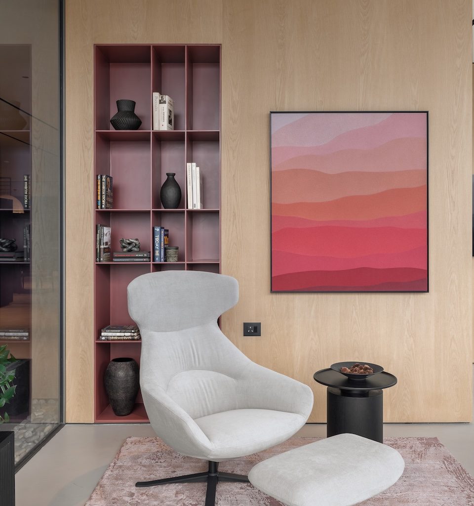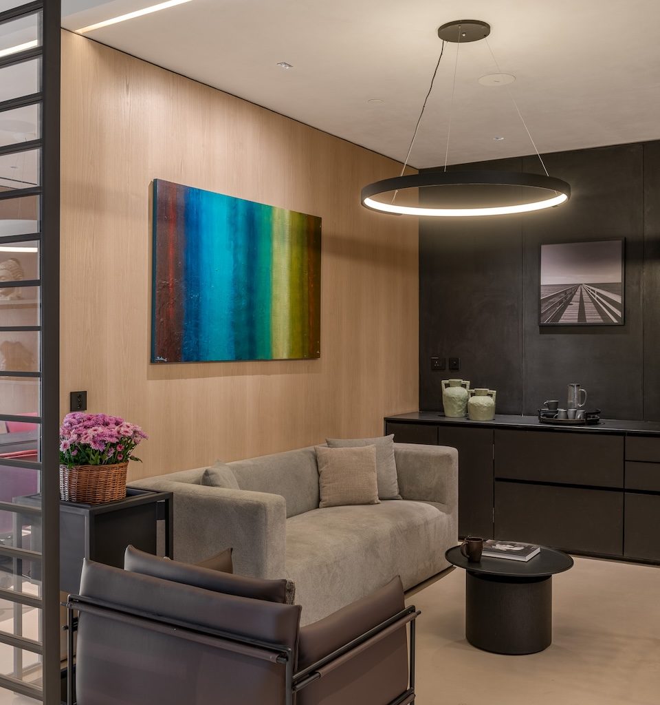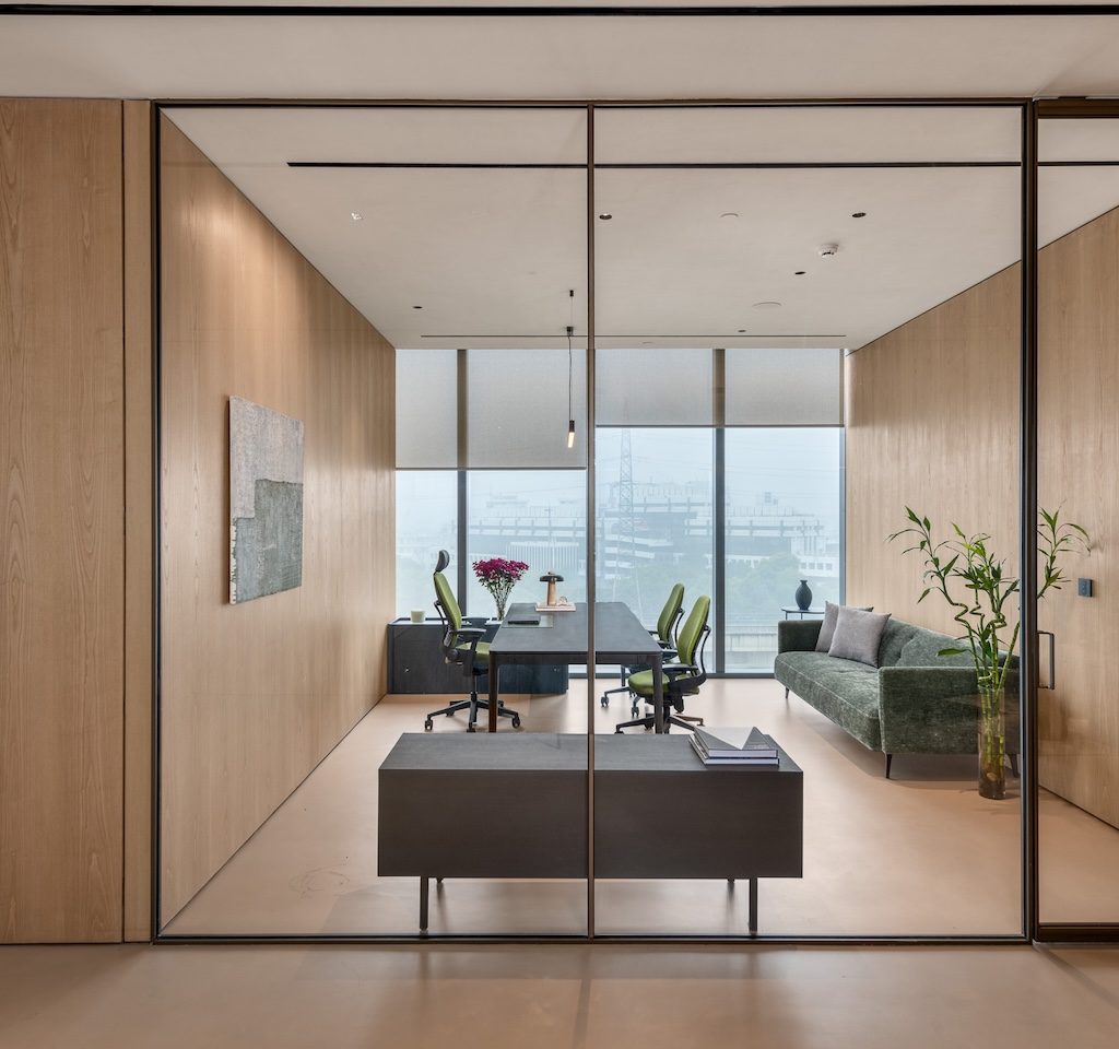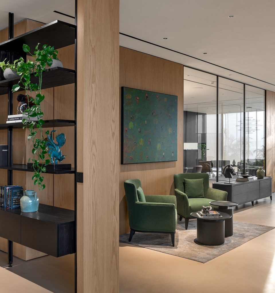 The interiors rely on a triad of materials: natural veneer, glass and lime plaster. This restrained palette creates a serene, monotone backdrop that highlights the quality of light and the clarity of the layout. Slot diffusers replace conventional AC grills for a seamless ceiling plane, while slender, custom-detailed furniture keeps the environment visually light. Art, vibrant upholstery and layered planting introduce finely measured colour inspired by the brands’ red and green identities.