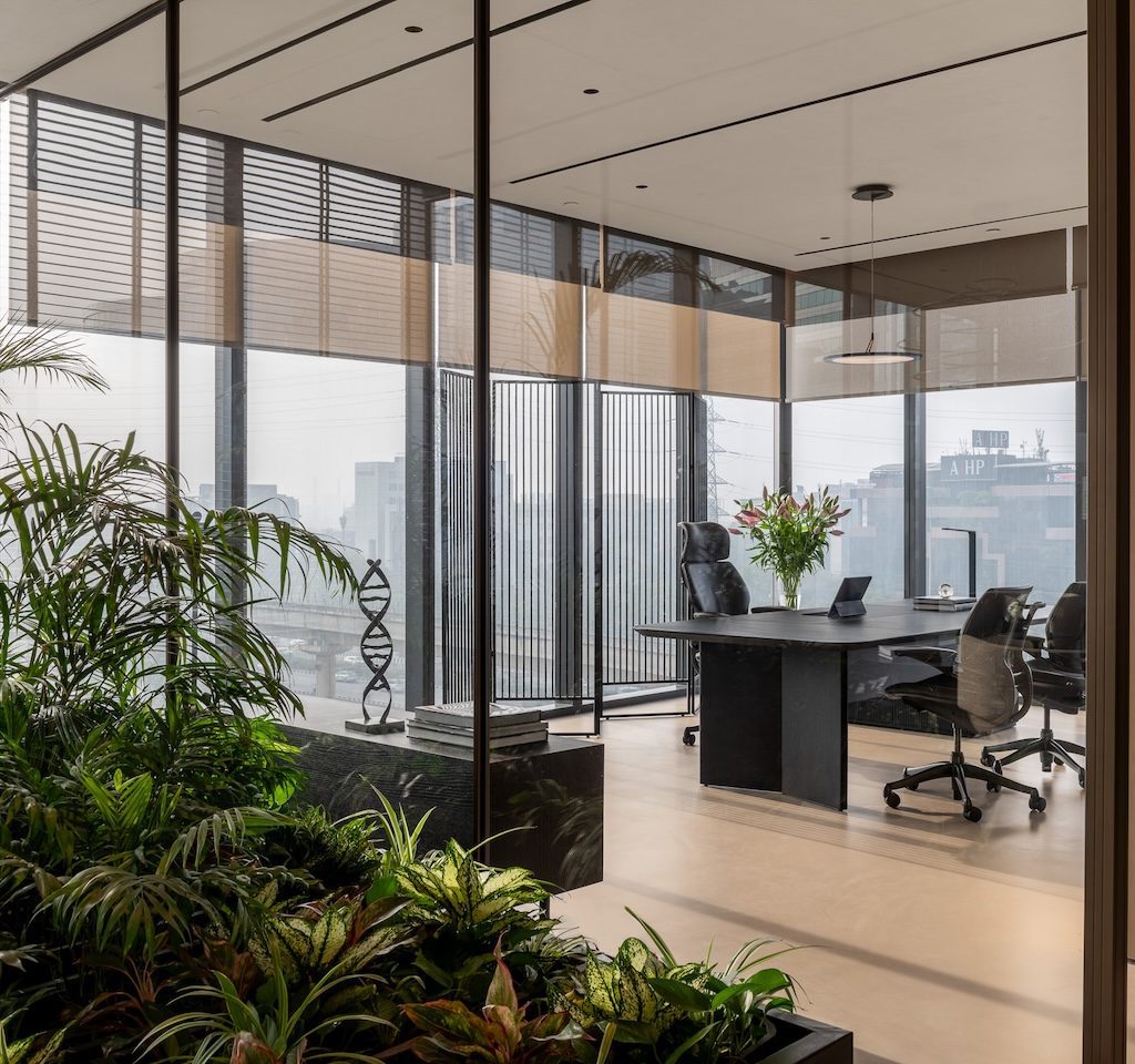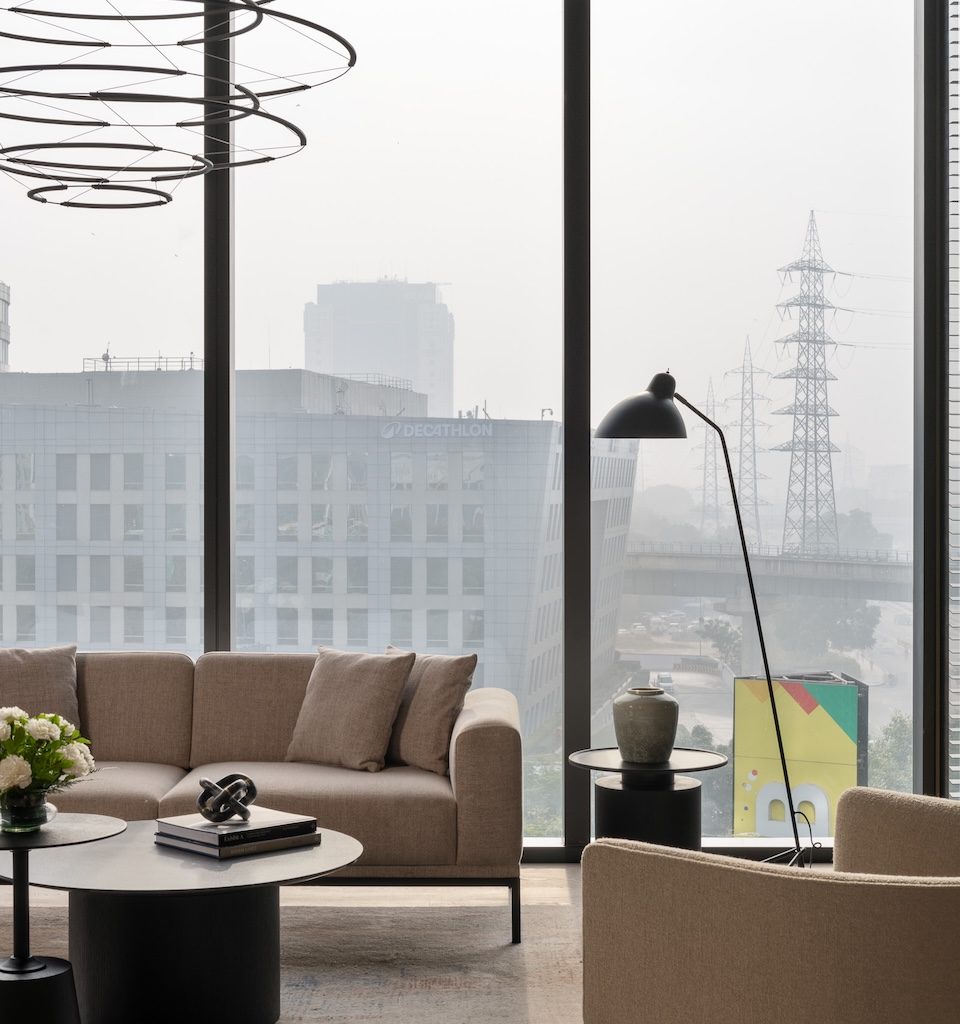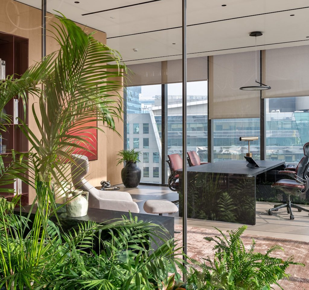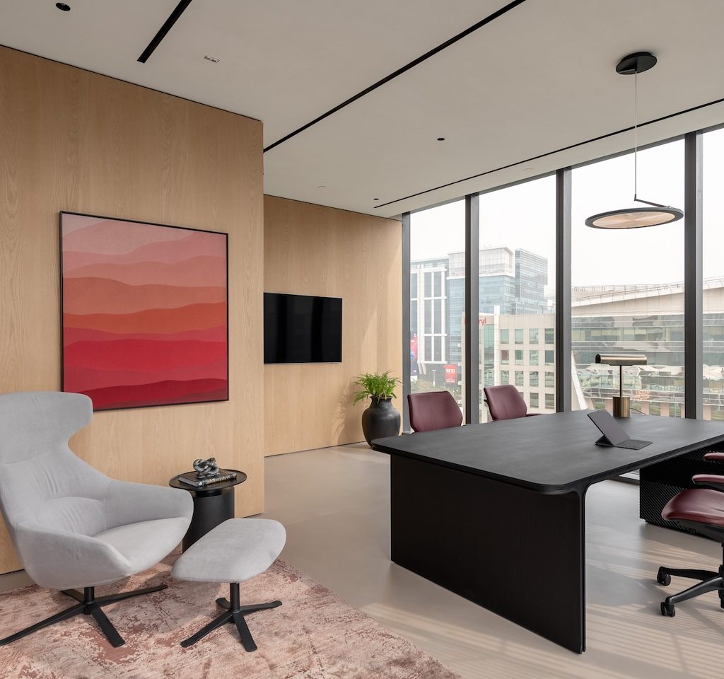 The office occupies a three-sided glazed floor plate overlooking DLF Cyber City. The full-height glazing floods the workspace with daylight and frames panoramic views, offering an unusually bright, flexible shell that served as a clean foundation for a carefully calibrated interior.