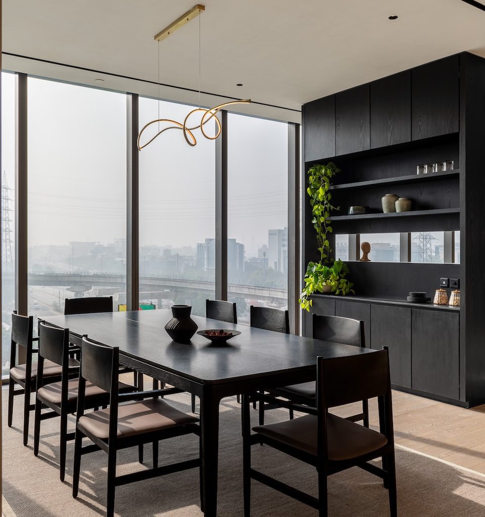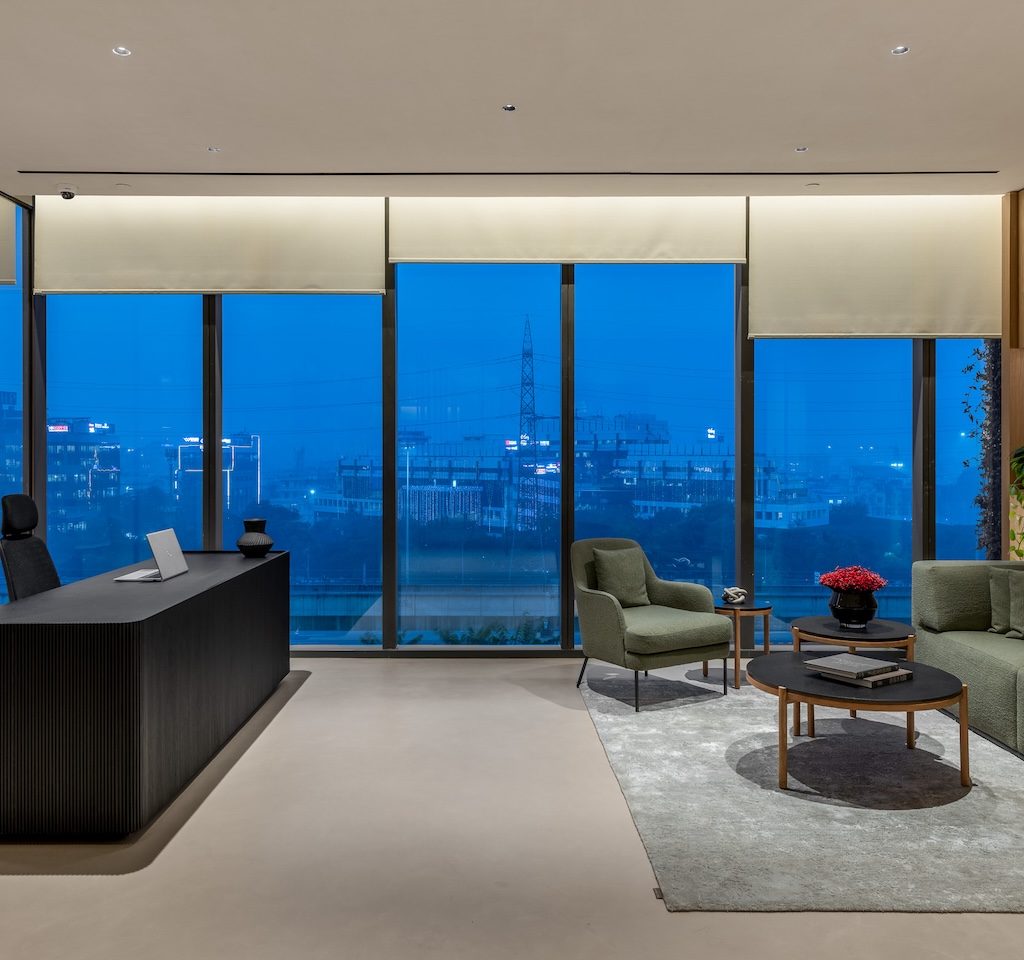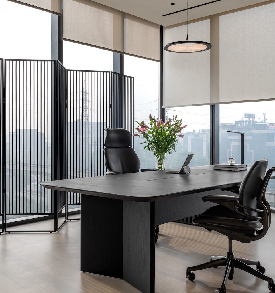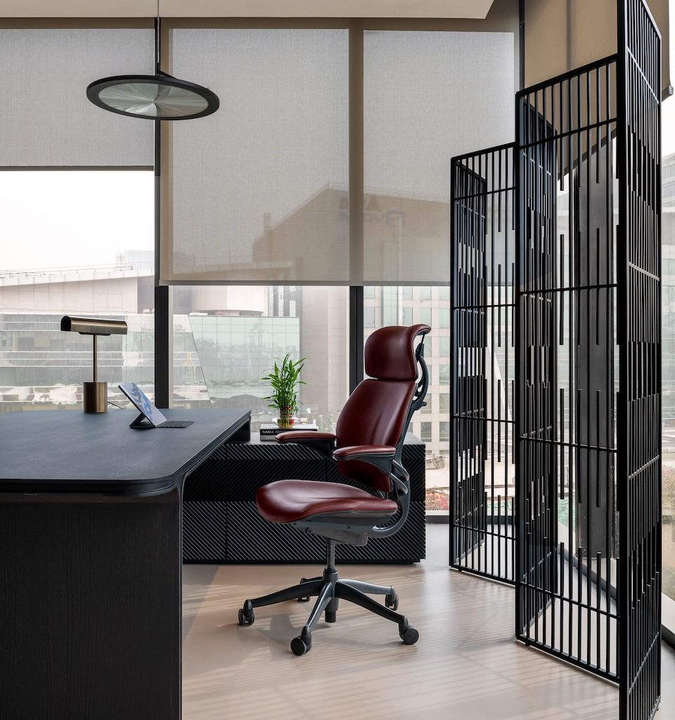 The office occupies a three-sided glazed floor plate overlooking DLF Cyber City. The full-height glazing floods the workspace with daylight and frames panoramic views, offering an unusually bright, flexible shell that served as a clean foundation for a carefully calibrated interior.