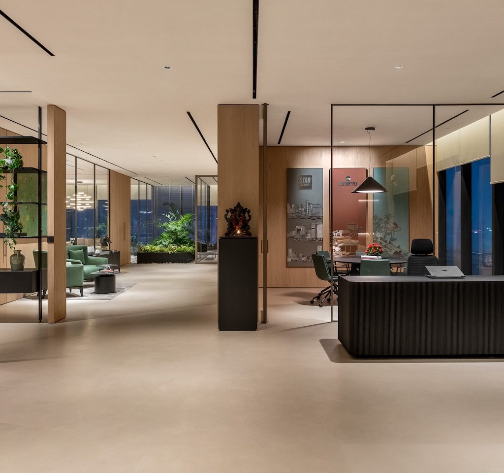 Star Cement’s new 6,000 sq ft headquarters in Oberoi Tower is envisioned as a workspace that brings together Star Cement, Century Ply and Namchic Tea Estate under one roof. Designed by Design Work Group, the office reflects the client’s deep appreciation for sophisticated, timeless design. With only sixteen primary occupants, the space is shaped as an open, refined environment that celebrates natural light, visual transparency and understated luxury.