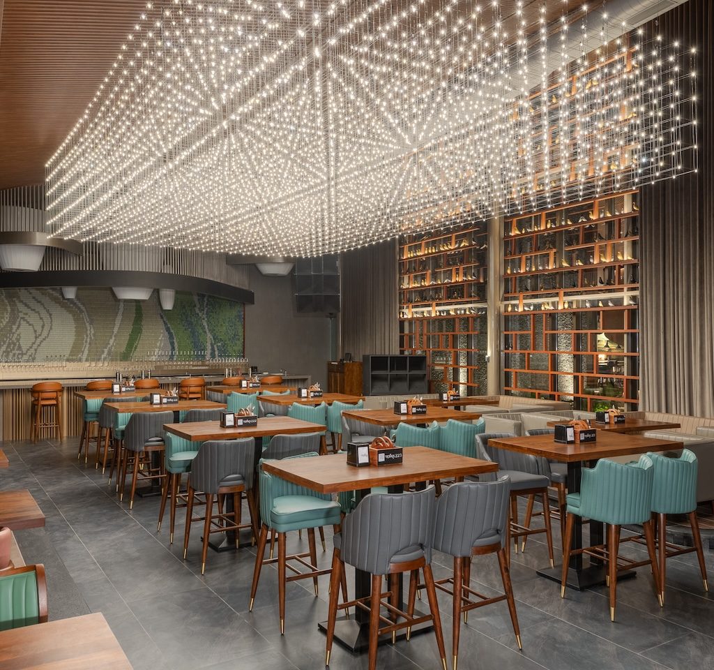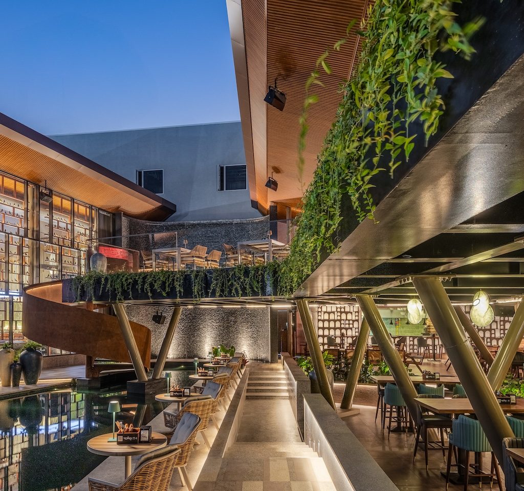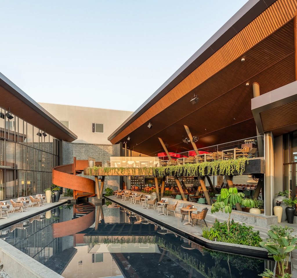 Aesthetically, the ambition was to create a destination that expressed modern luxury softened by nature. Bold roof profiles, water features, lush pockets of green and warm materiality were essential to shaping an identity that shifts gracefully from day to night — tranquil in daylight, atmospheric after dusk.