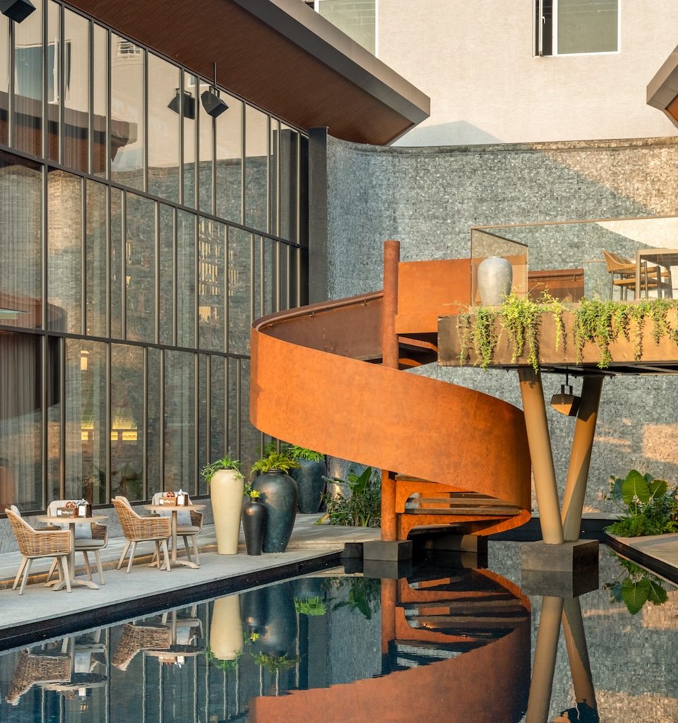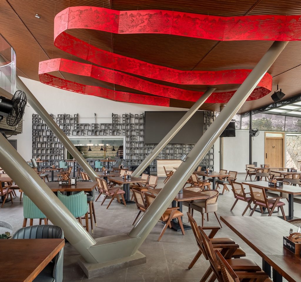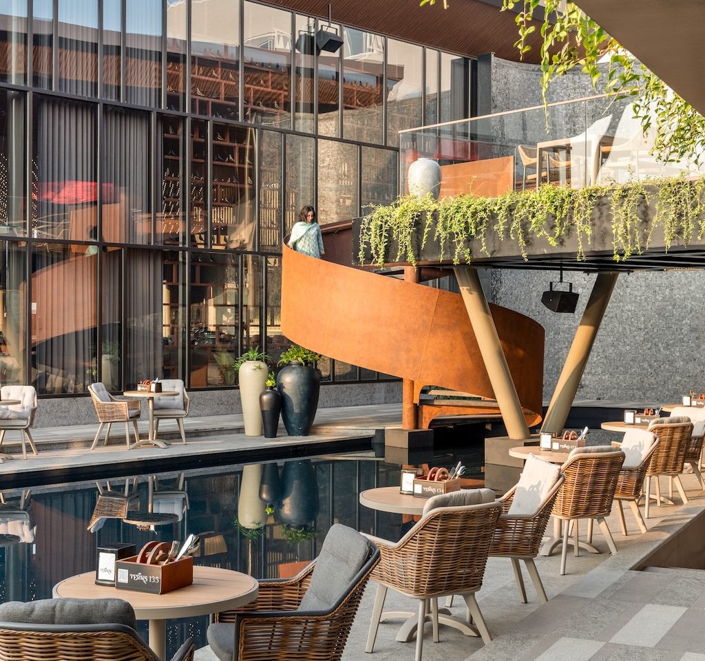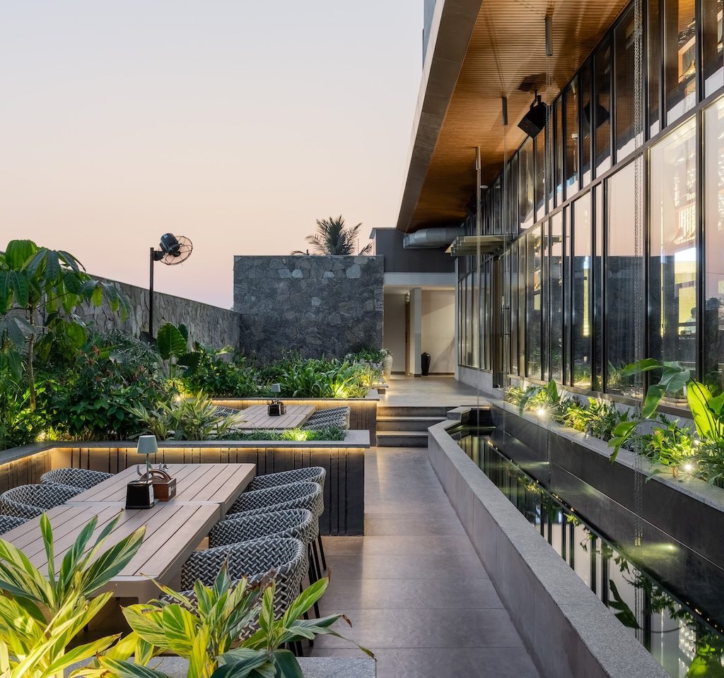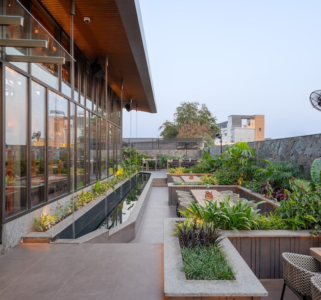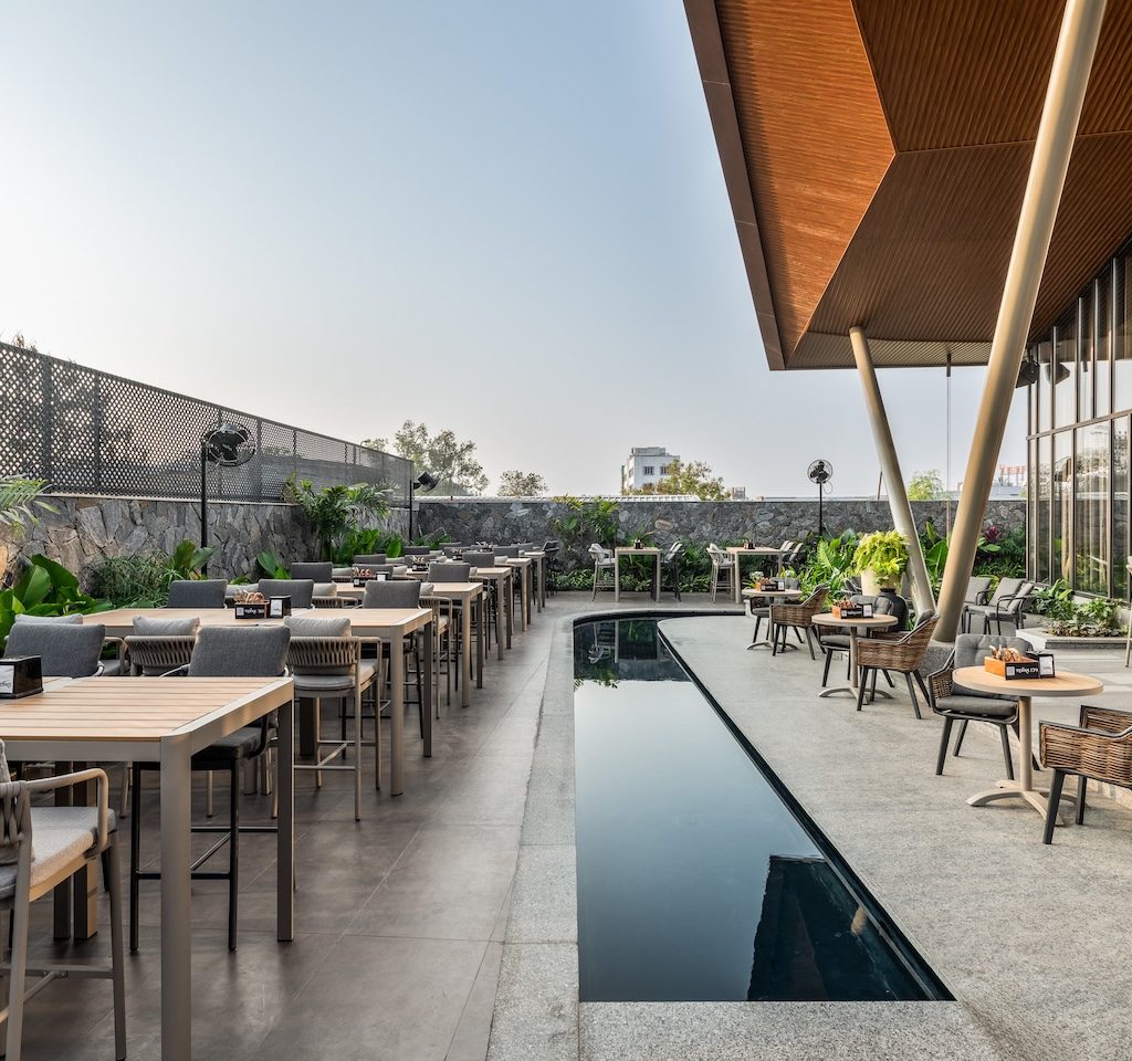 For principal architect Krishna Kishore, the restobar was an opportunity to fuse hospitality and architecture into a single, fluid experience. “Our aim was to let architecture set the mood. The roof forms, water and landscape were all designed to work together so the experience would feel fluid, calm and connected at every level,” he says. The design prioritises openness, visual continuity and the interplay of natural elements. Roof planes float over water and landscape, while inside and outside merge through transparency and level transitions. The intent was to create a place where form, function and ambience reinforce one another — an elevated dining environment rooted in calm, light and spatial generosity.