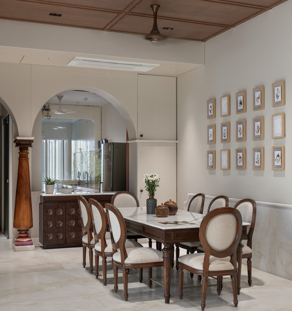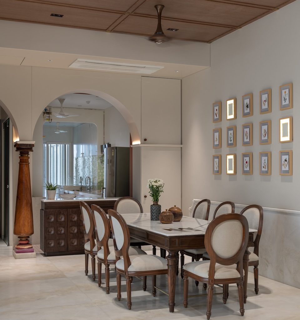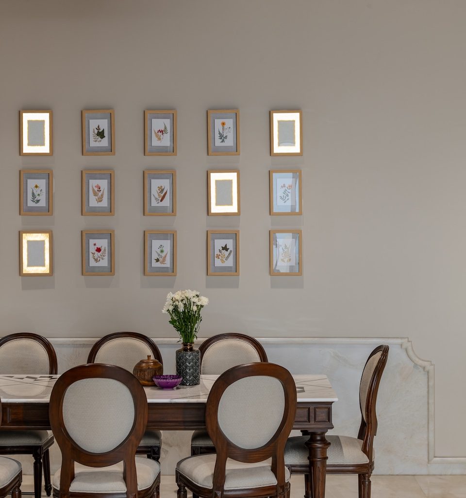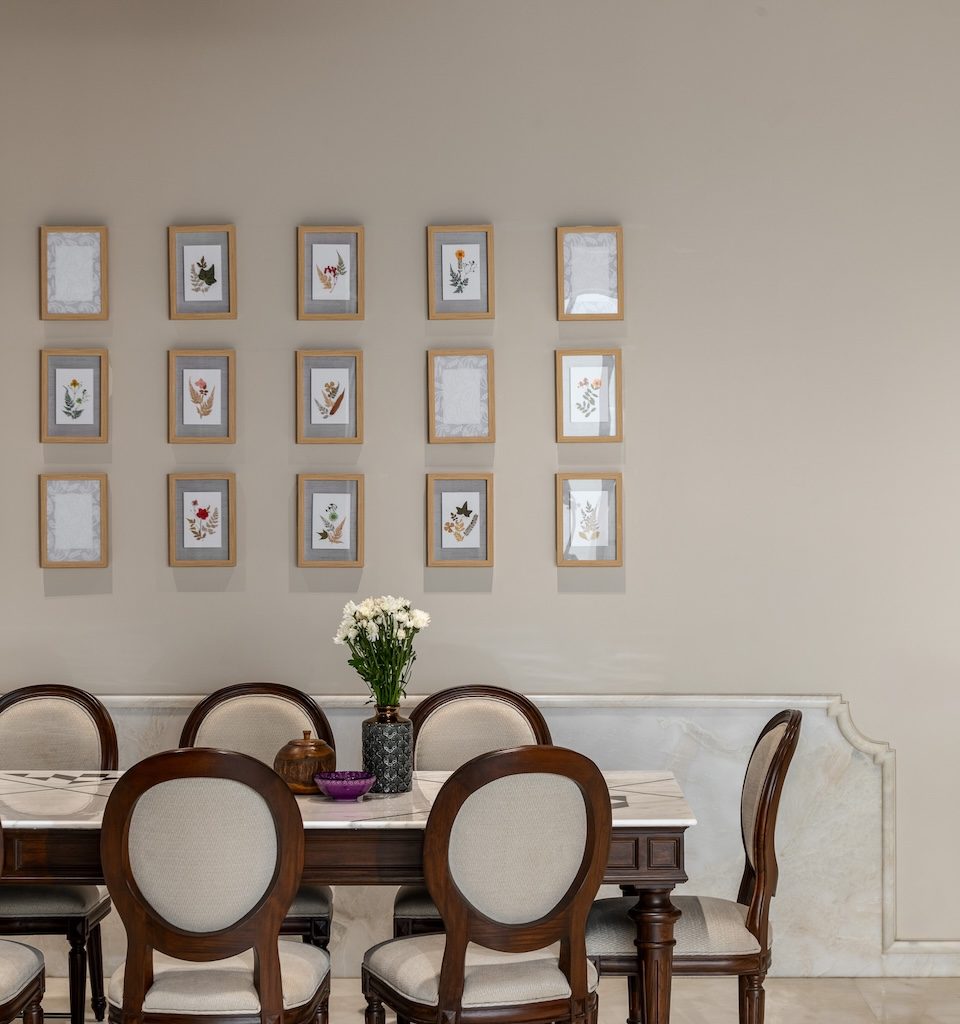 Materiality is used as a storytelling device rather than a display of finishes. Muted greys and creamy taupes form a calm base, punctuated by moments of crafted detail. A carved wooden column in the dining area becomes a tactile focal point, anchoring the space in artisanal tradition. Botanical illustrations line the walls, accompanied by wall lights that echo their presence, adding a layered play of light and shadow.