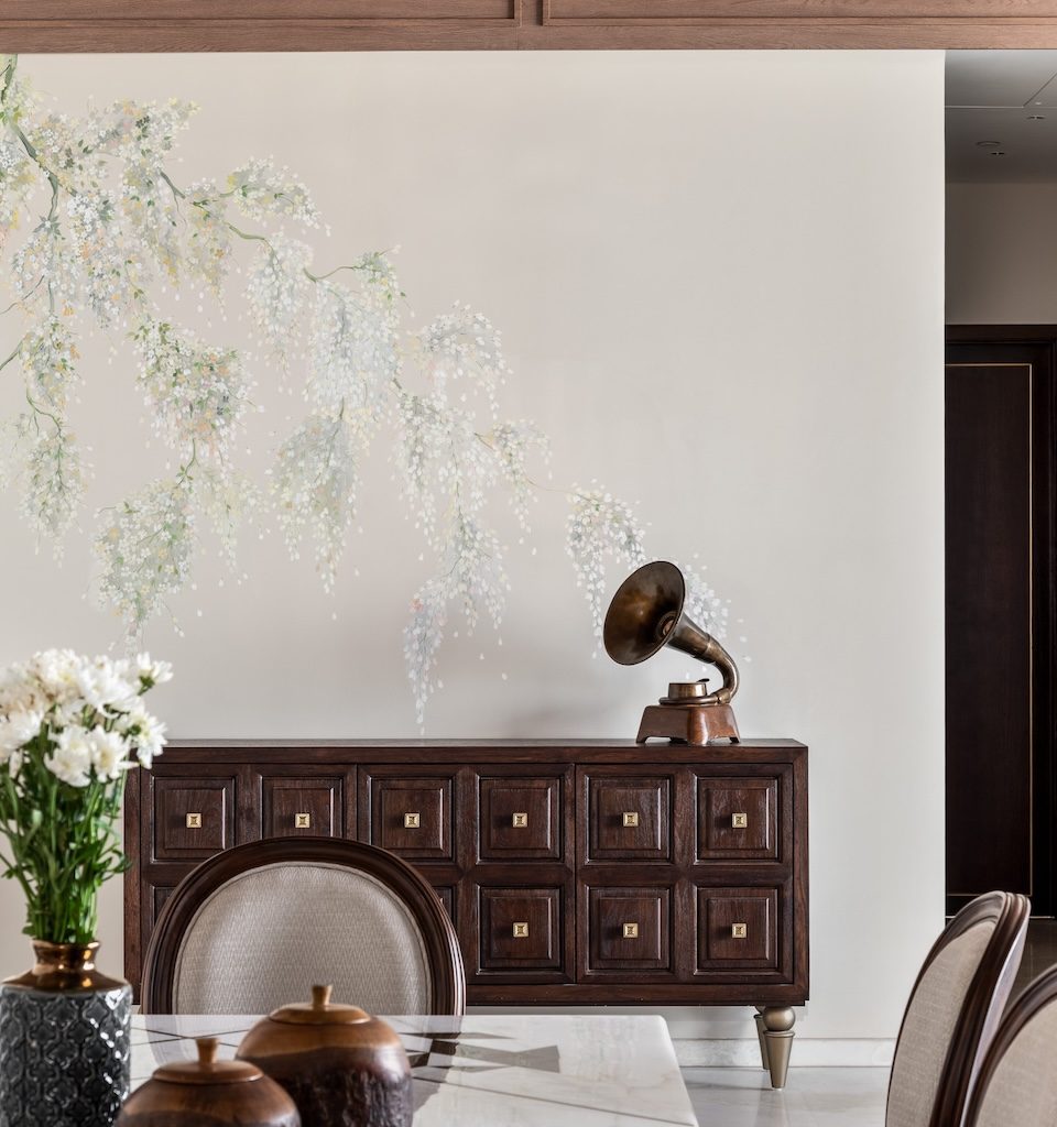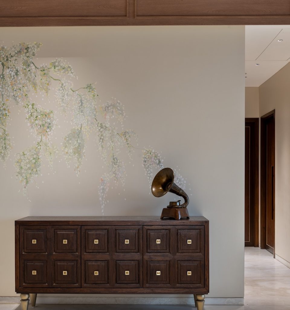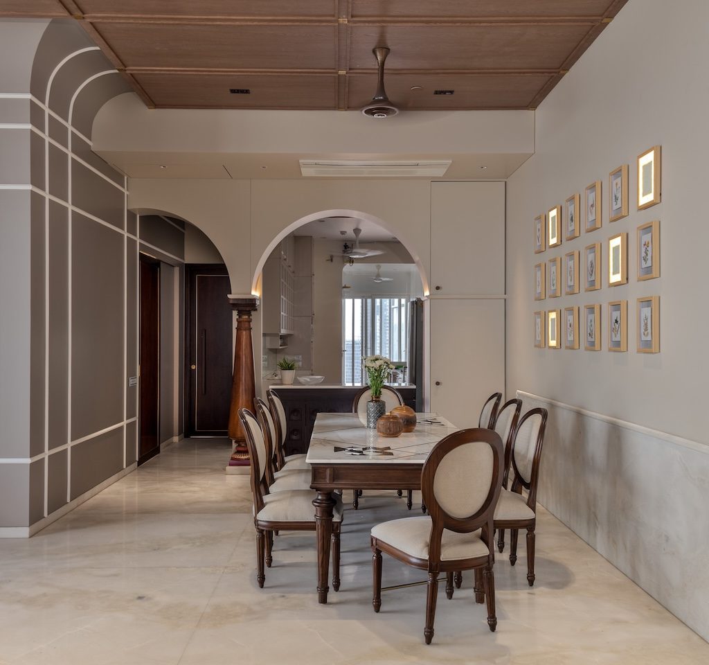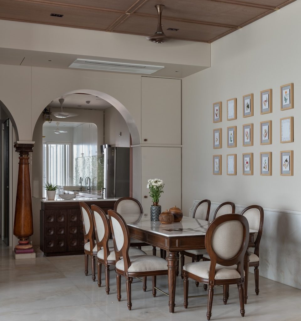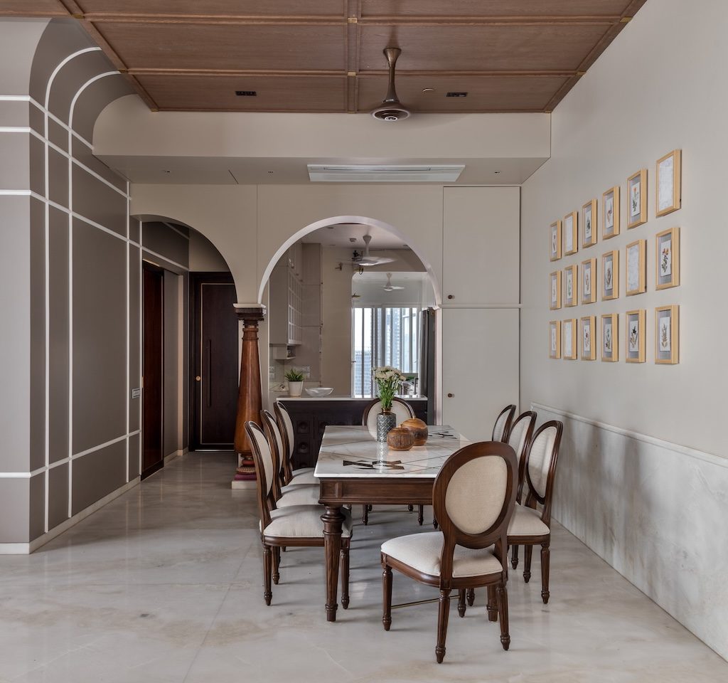 Materiality is used as a storytelling device rather than a display of finishes. Muted greys and creamy taupes form a calm base, punctuated by moments of crafted detail. A carved wooden column in the dining area becomes a tactile focal point, anchoring the space in artisanal tradition. Botanical illustrations line the walls, accompanied by wall lights that echo their presence, adding a layered play of light and shadow.