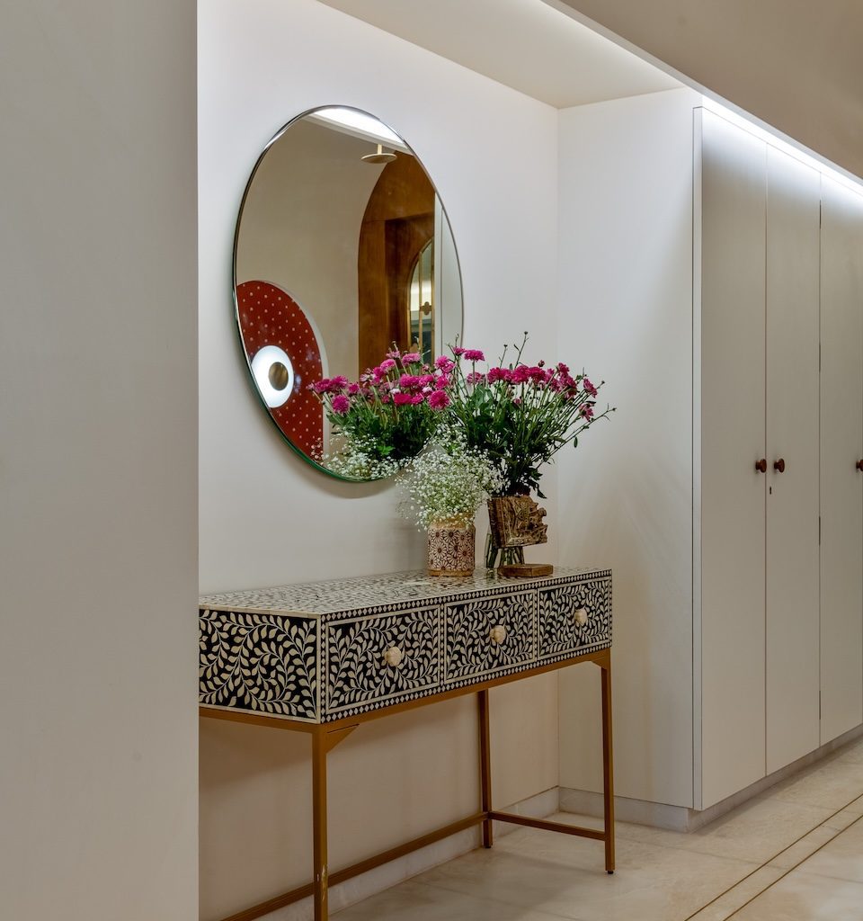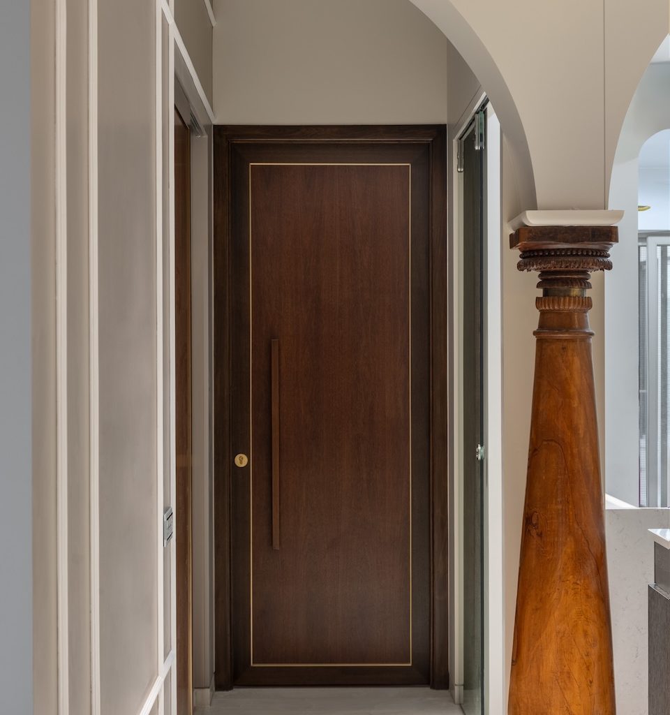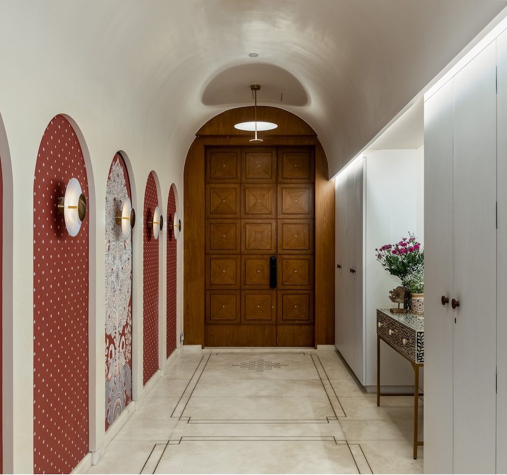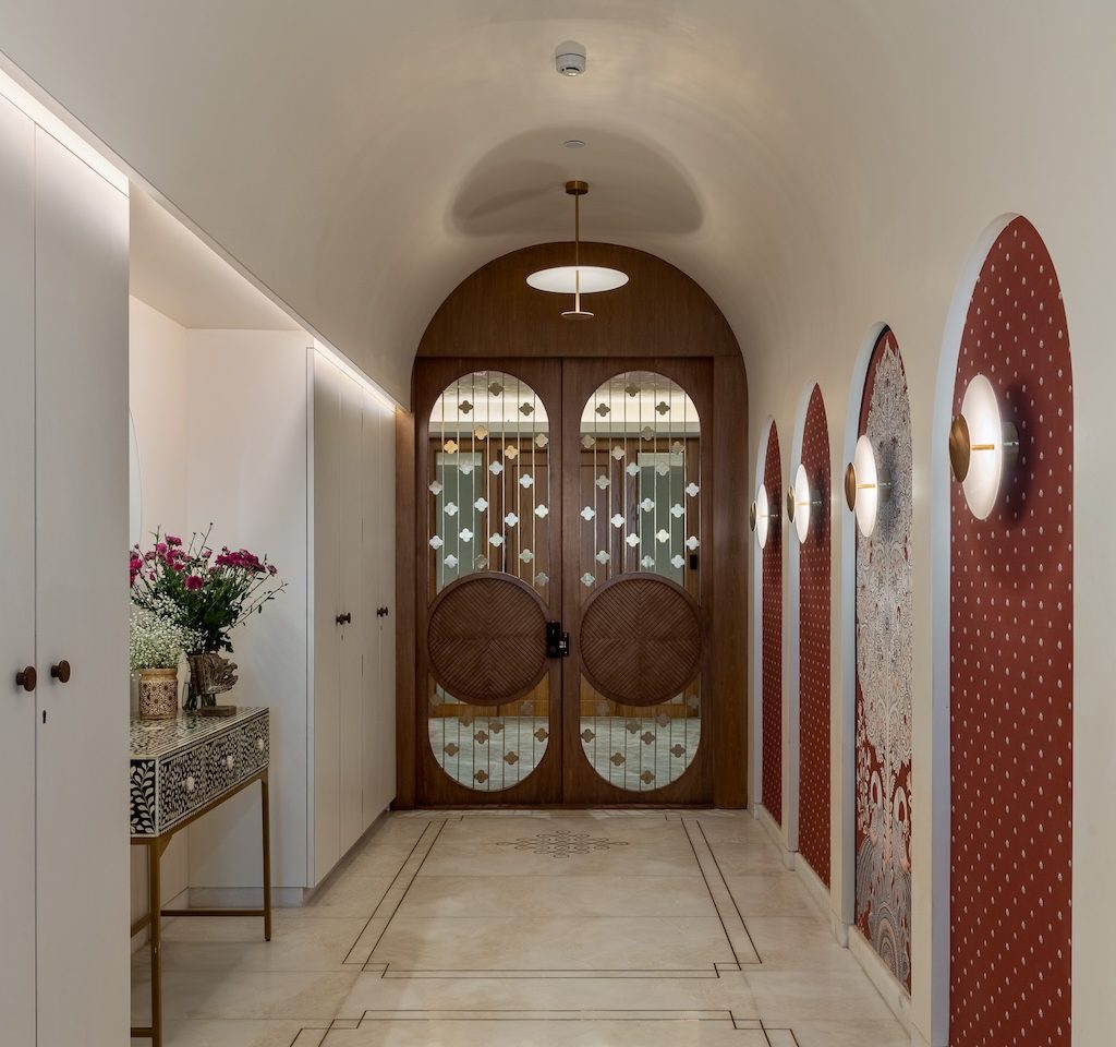 The apartment unfolds through a series of carefully calibrated moments. The entryway sets the tone with an arched ceiling and curated lighting that creates a sense of arrival, leading towards a striking wooden front door whose inset grid panels reinterpret classical Indian craftsmanship in a contemporary language. Embedded into the flooring nearby is a permanent rangoli motif—an understated yet powerful gesture of welcome and cultural continuity. “We wanted to preserve the idea of rangoli not as decoration, but as hospitality and memory,” shares the designer. “Making it part of the floor allowed it to become a silent, lasting blessing.”