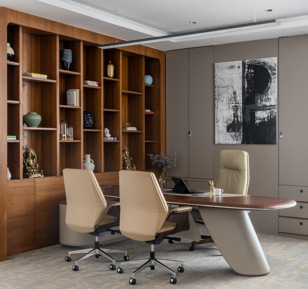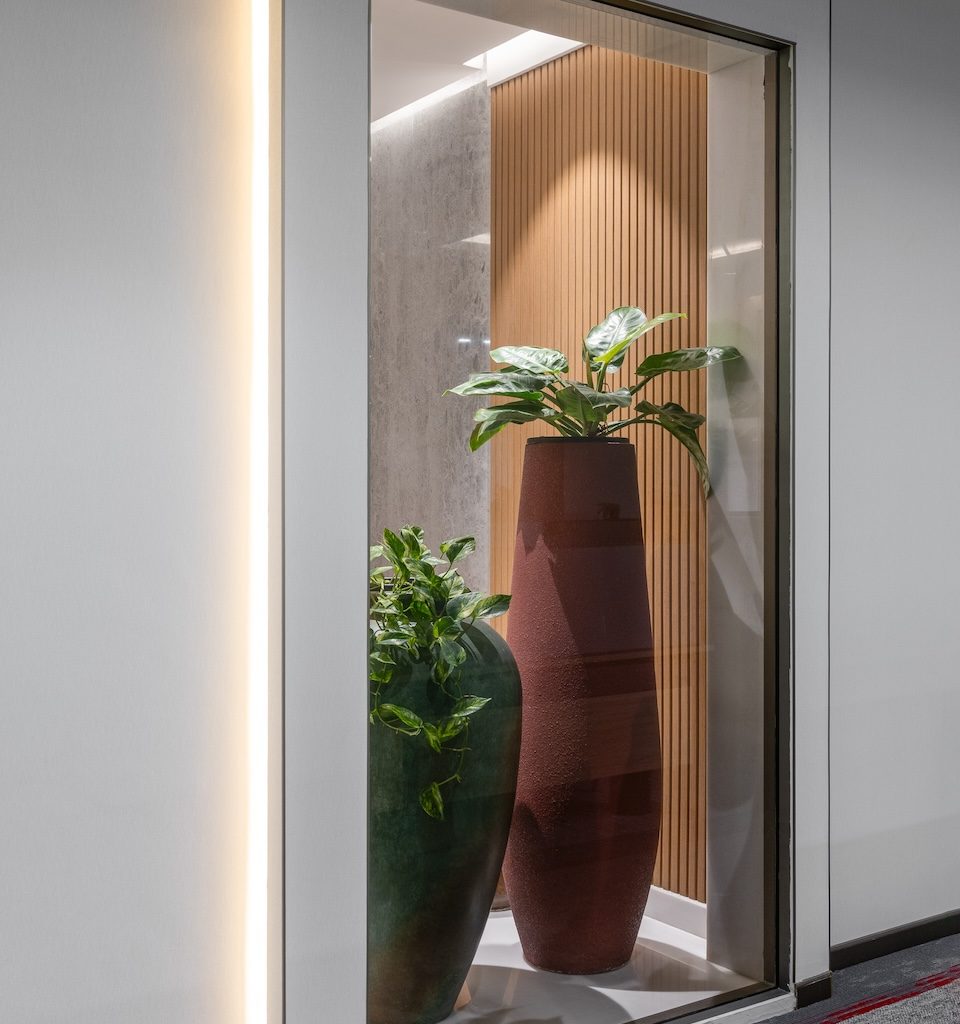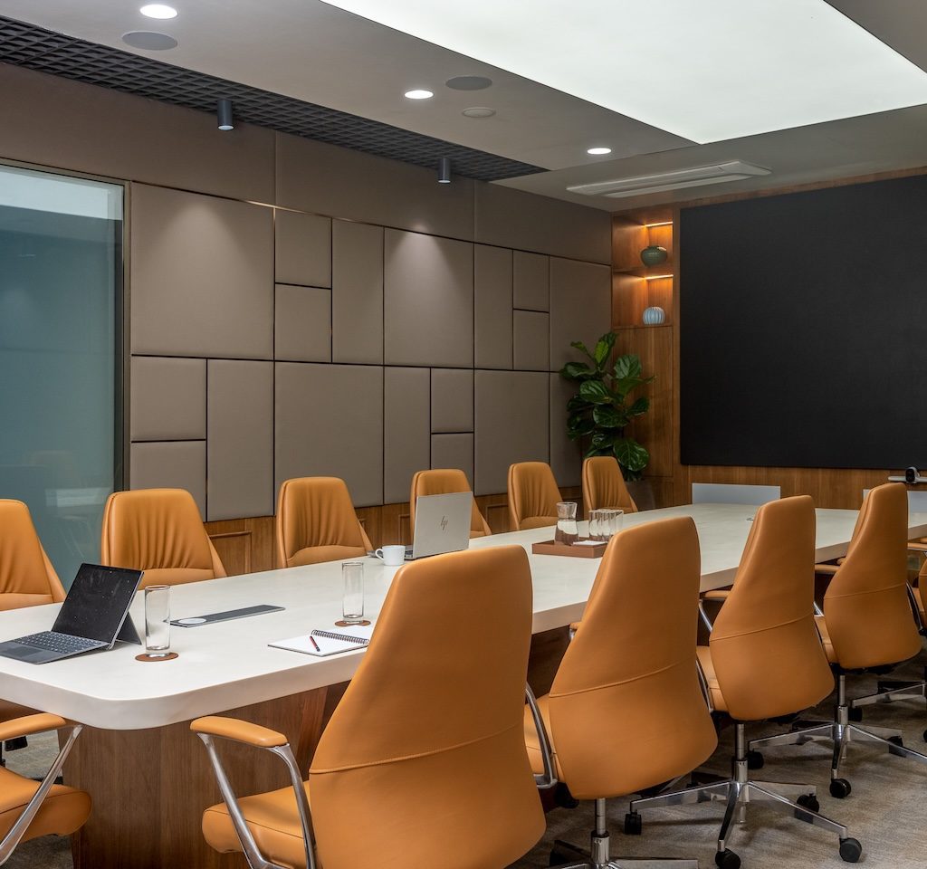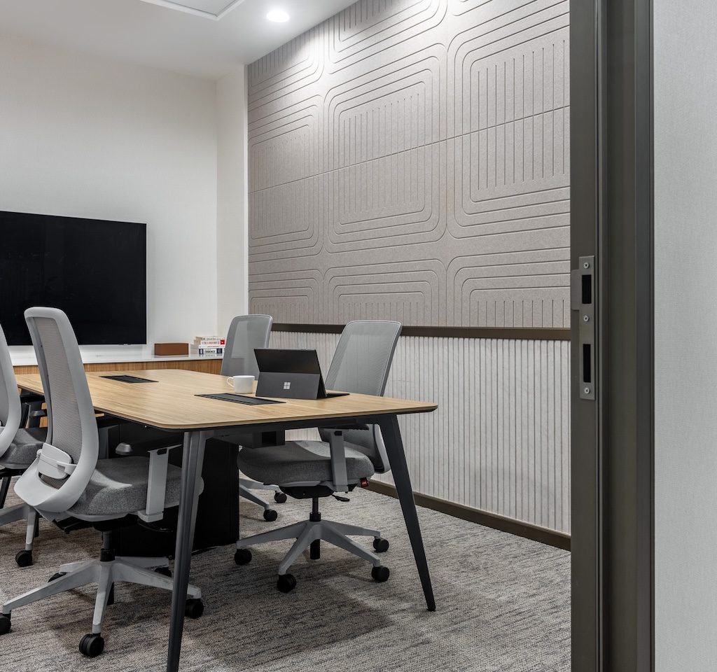 The material language is subdued and cohesive, supporting both visual calm and acoustic comfort. Wood tones are used extensively to introduce warmth and soften the minimal aesthetic, while matte finishes and neutral wall colours create a glare-free environment suited to extended working hours. Textured wall and ceiling panels perform a dual role, adding subtle depth while absorbing sound, ensuring that collaboration and focused work can coexist without interference. Select metal accents bring refinement without drawing attention away from the overall restraint of the space.