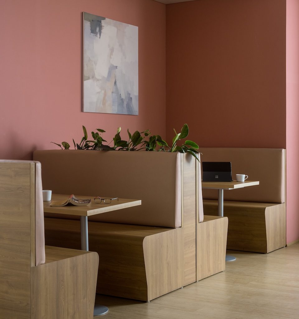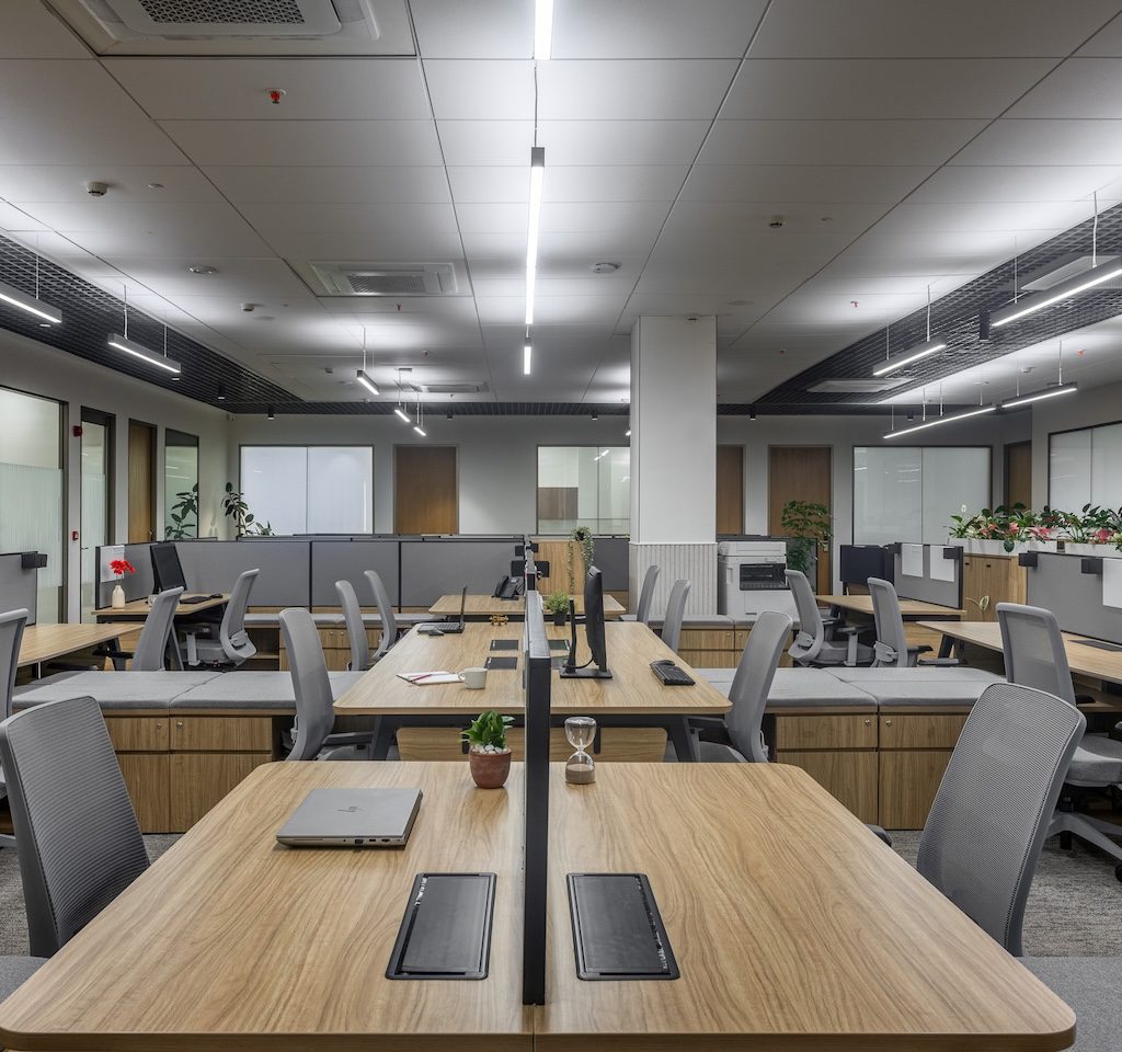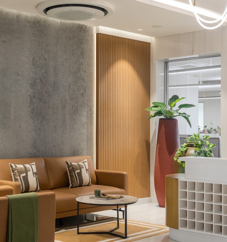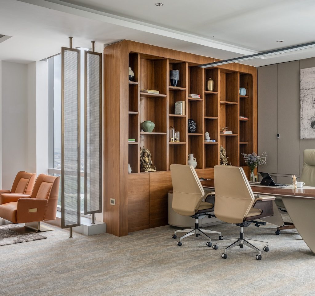 The material language is subdued and cohesive, supporting both visual calm and acoustic comfort. Wood tones are used extensively to introduce warmth and soften the minimal aesthetic, while matte finishes and neutral wall colours create a glare-free environment suited to extended working hours. Textured wall and ceiling panels perform a dual role, adding subtle depth while absorbing sound, ensuring that collaboration and focused work can coexist without interference. Select metal accents bring refinement without drawing attention away from the overall restraint of the space.