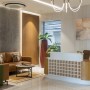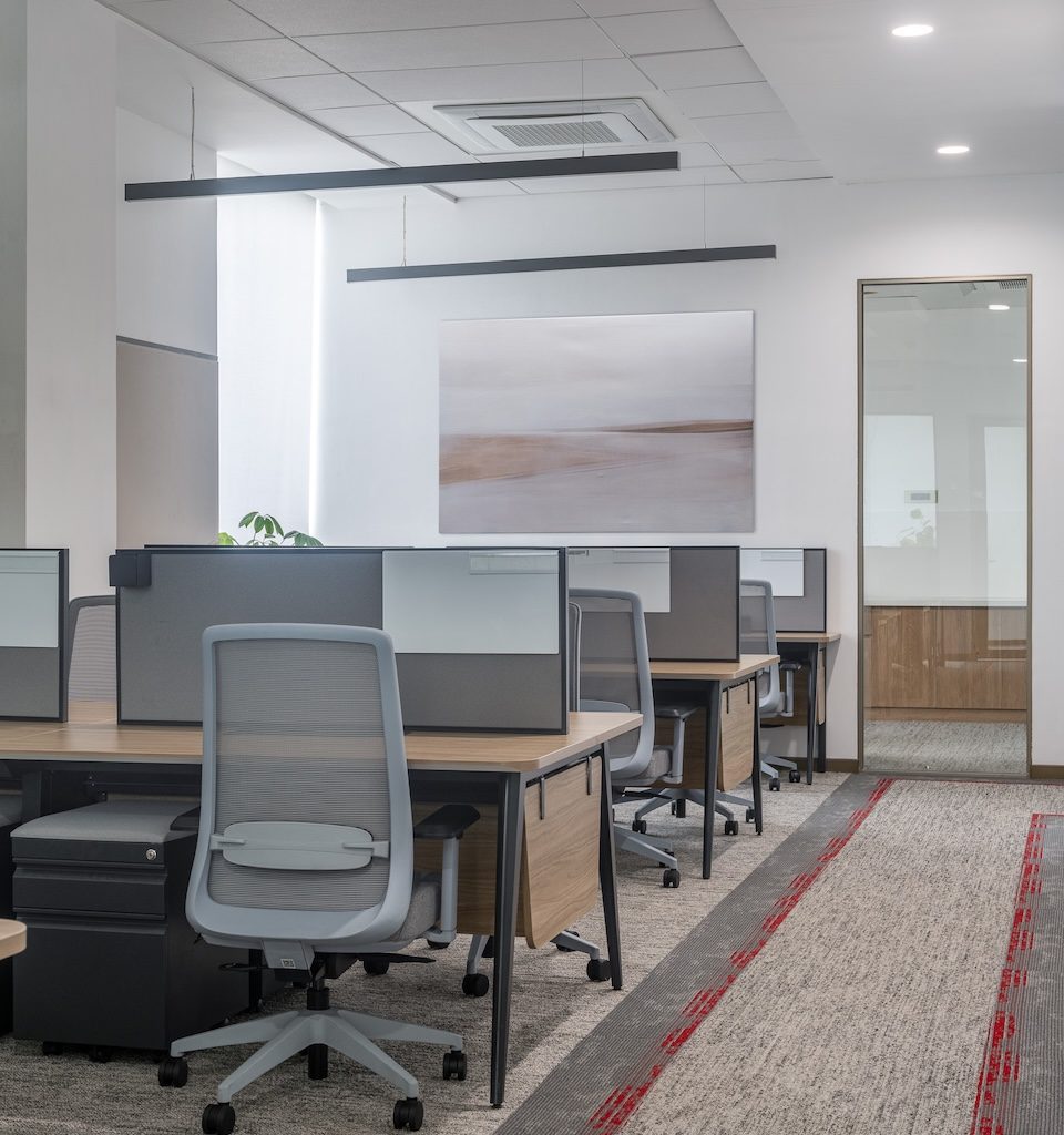 The office unfolds through an intuitive sequence calibrated for varied modes of work. Visitors enter into a composed reception zone before moving into a clearly structured layout where executive cabins, meeting rooms, and collaborative areas are carefully zoned for privacy and focus. Editing suites and screen-intensive workspaces are positioned to minimise both visual and acoustic disturbance, allowing multiple workflows to operate simultaneously. Lighting is deliberately calibrated across the floor plate—balanced to support long hours of screen-based work while maintaining a warm ambient quality. Natural light is maximised wherever possible, reinforcing a sense of openness within the high-rise setting.