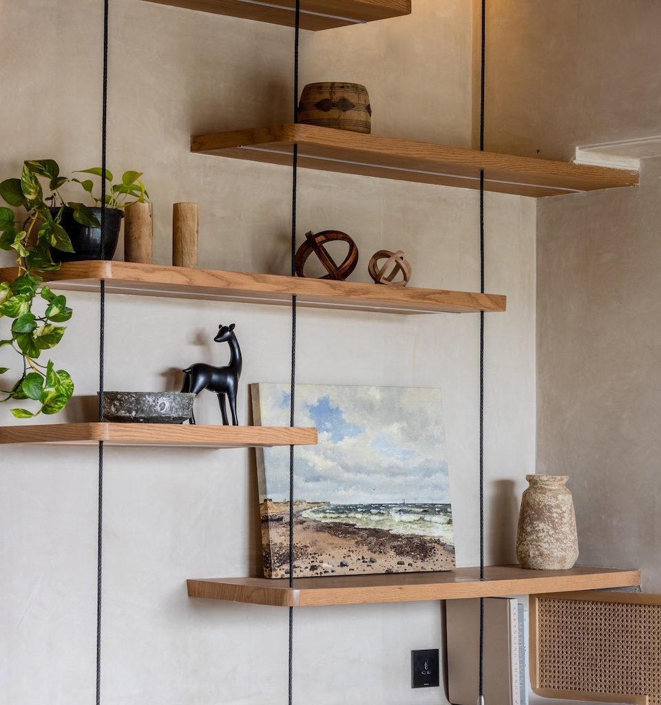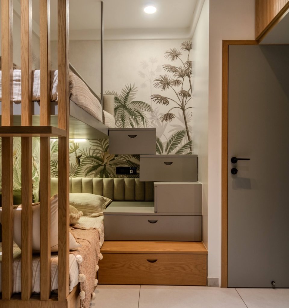 The lime plaster finish stands out as the defining feature of the home, particularly around the seating area, TV wall, and dining nook, where its soft tonal variation becomes most apparent. Initially uncertain about this unconventional choice, the clients now value its tactile quality and calming presence, enjoying the flexibility of working, relaxing, and spending time together across different corners of the home. Custom-designed elements such as the sliding door system, the TV unit with integrated seating and planter pocket, the Murphy bed, and the children’s bunk bed with storage embedded into the staircase further reflect the project’s focus on thoughtful, space-efficient design.