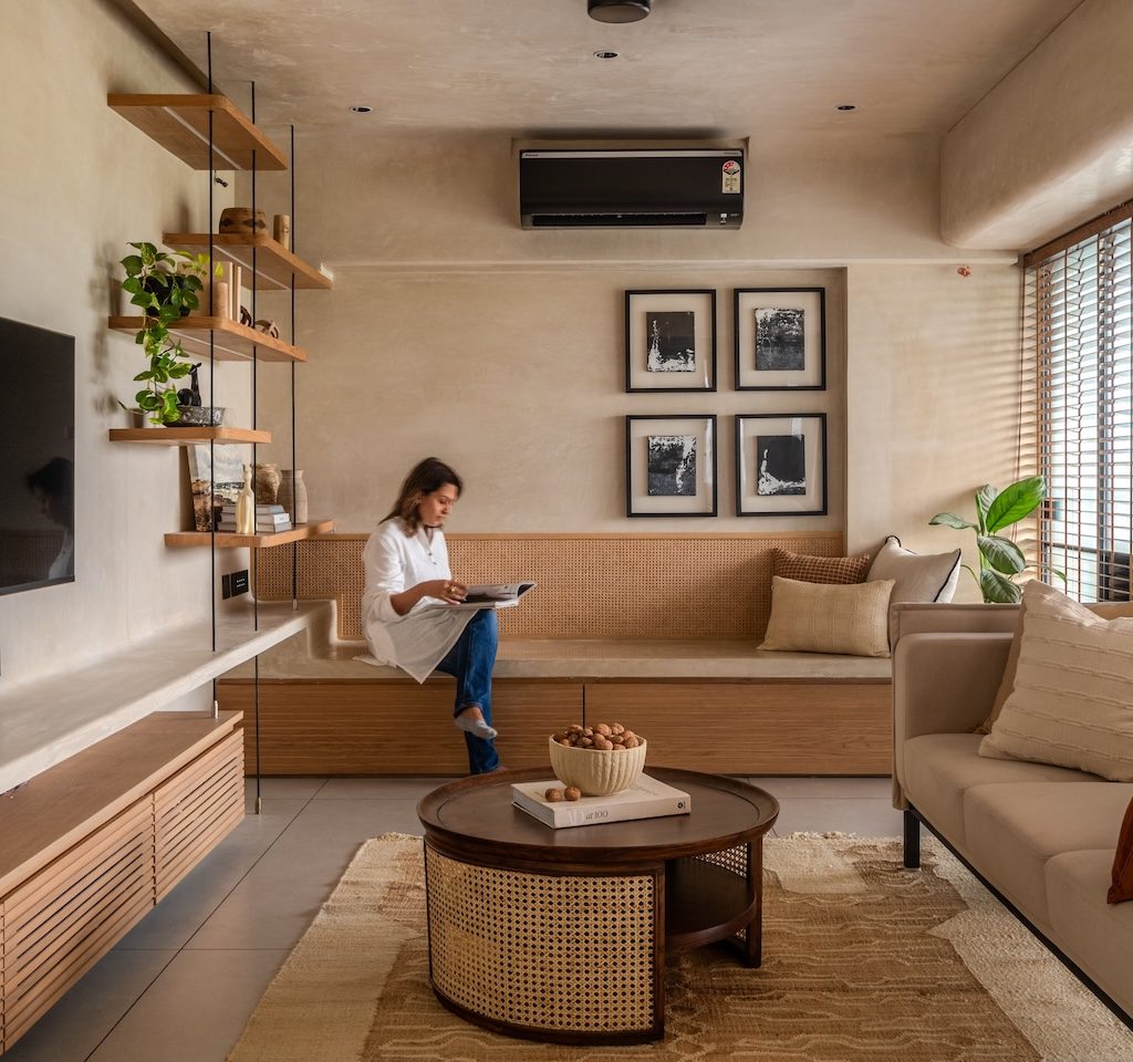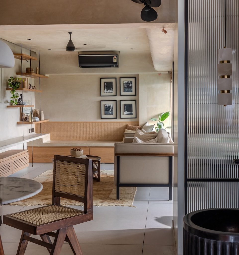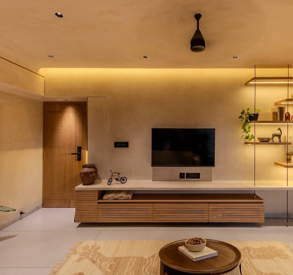 The design intent was rooted in the clients’ simple, working-class lifestyle and their natural inclination towards understated living. The designers sought to create a home that feels grounded and closely connected to nature, drawing from the apartment’s verdant surroundings. As principal architect and designer Chinmay Huddar and Vrunda Satarkar explain, “The idea was to create a calm, earthy home where materials and spaces feel honest, natural, and deeply comfortable rather than decorative.” This philosophy guided the choice of finishes and the overall spatial language of the home.