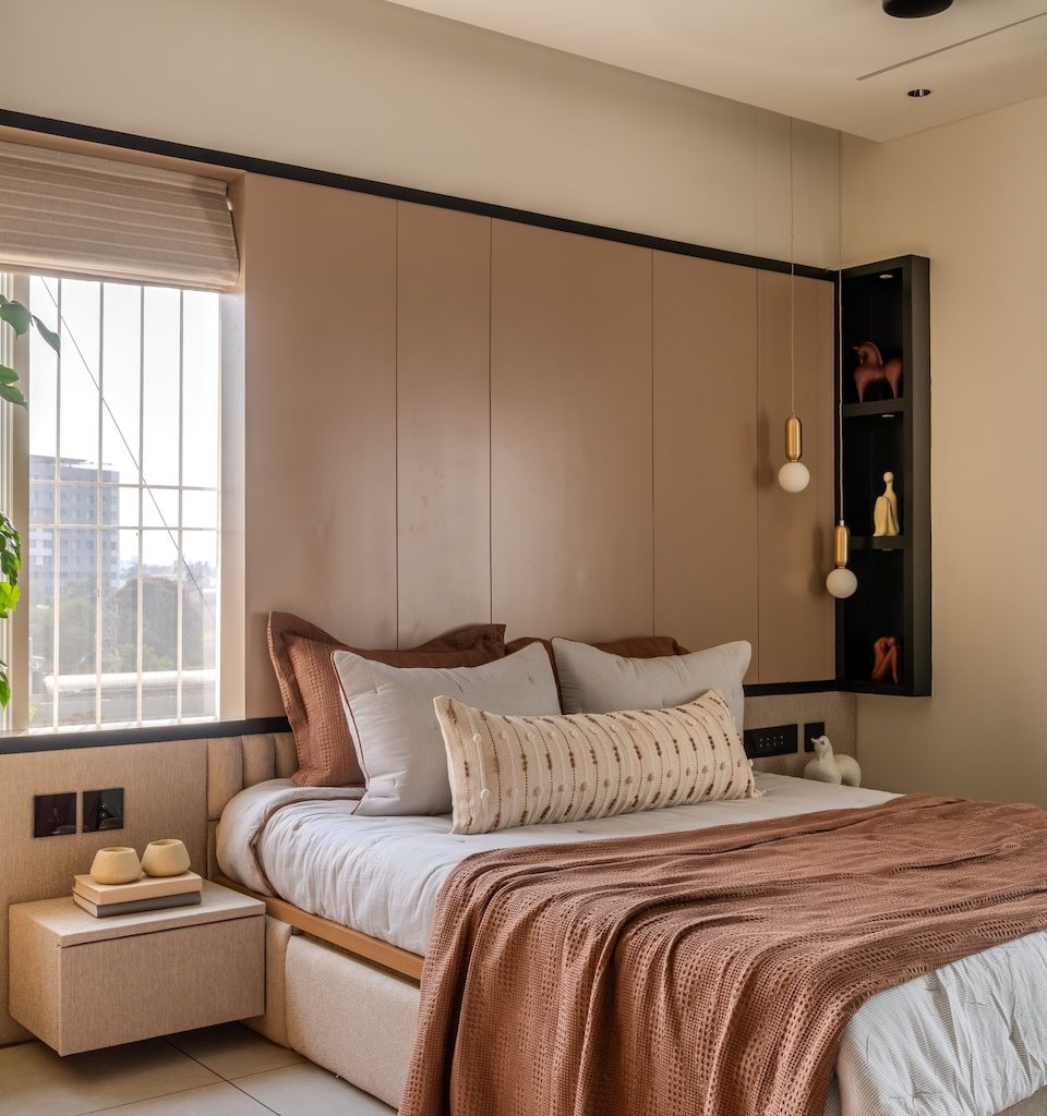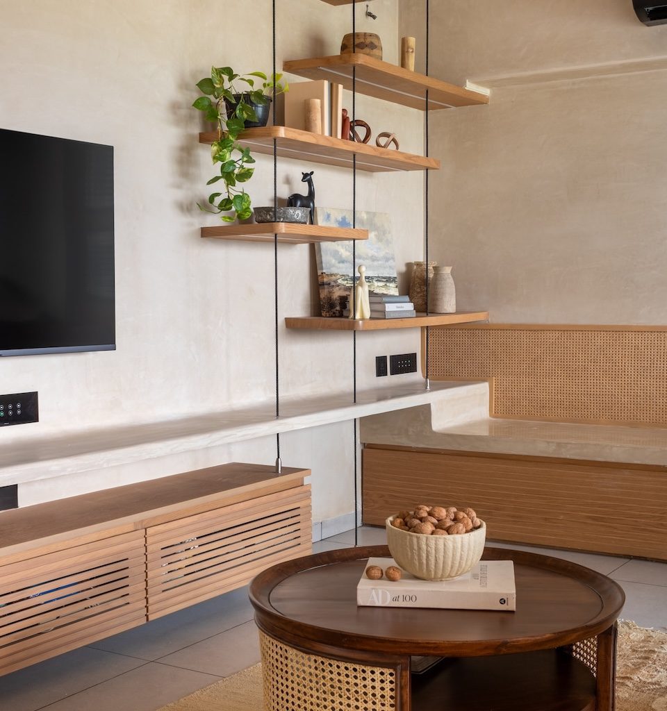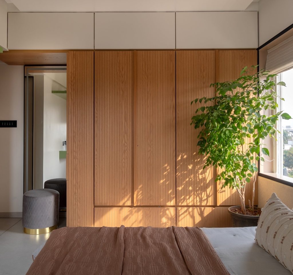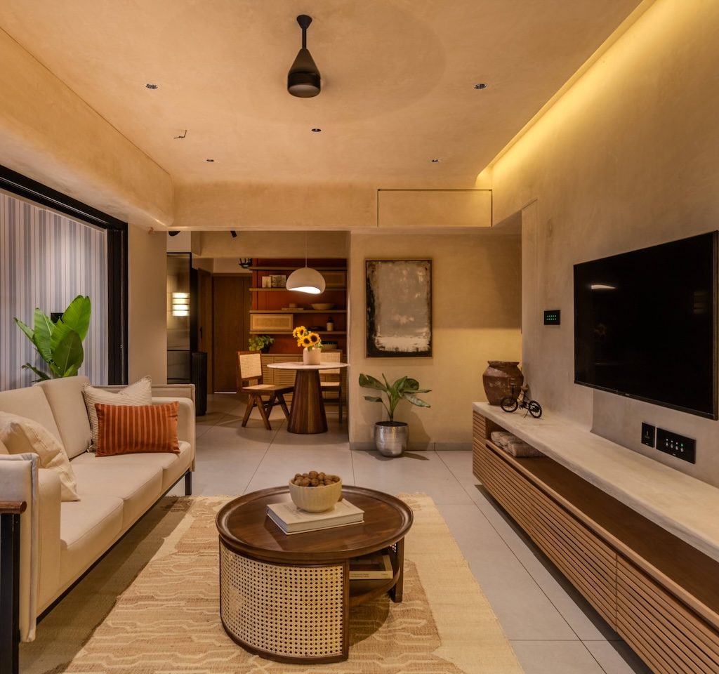 The design intent was rooted in the clients’ simple, working-class lifestyle and their natural inclination towards understated living. The designers sought to create a home that feels grounded and closely connected to nature, drawing from the apartment’s verdant surroundings. As principal architect and designer Chinmay Huddar and Vrunda Satarkar explain, “The idea was to create a calm, earthy home where materials and spaces feel honest, natural, and deeply comfortable rather than decorative.” This philosophy guided the choice of finishes and the overall spatial language of the home.