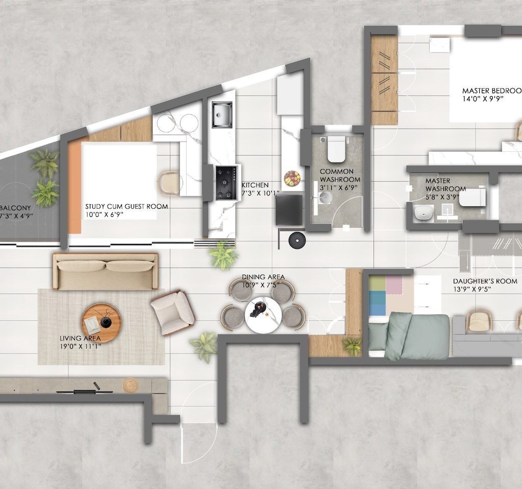 The apartment’s limited area posed an immediate challenge, especially given the family’s need for multiple functional zones. Received as a conventional residential flat, the space required careful rethinking to accommodate private rooms, shared areas, and work-friendly corners without feeling congested. The surrounding greenery and expansive views became important contextual cues, encouraging a design approach that prioritised openness, light, and visual continuity.