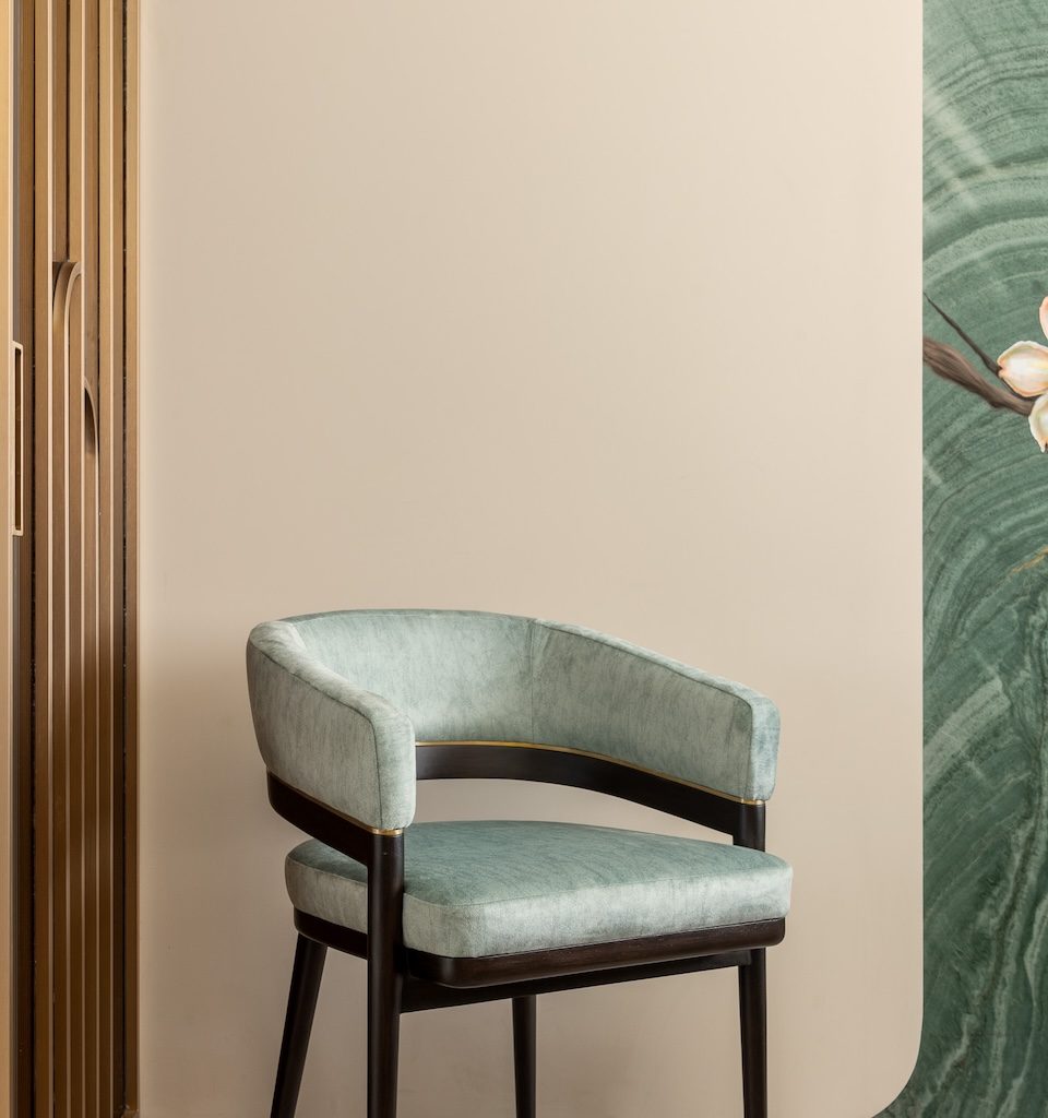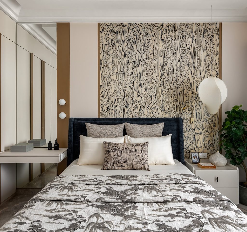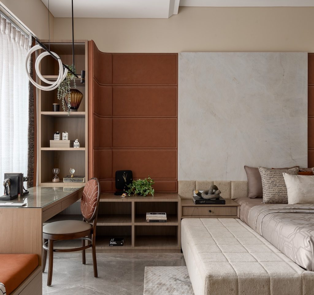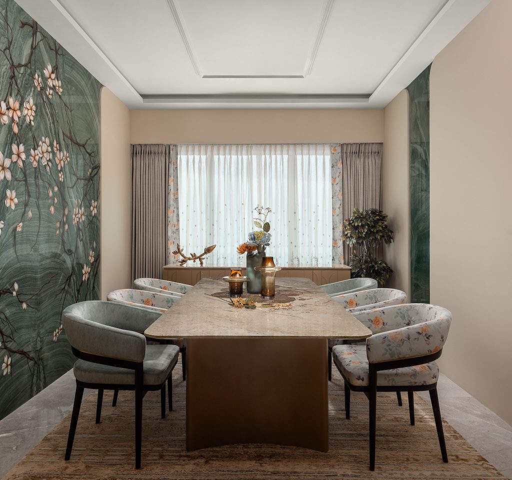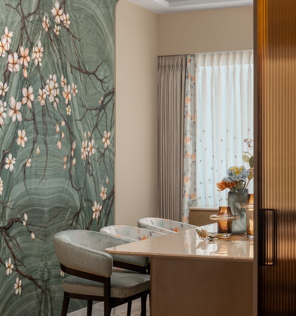 The dining room is carved out as a snug yet elegant extension of the living space, anchored by Havana Green quartzite enhanced with custom hand-painted artwork. Bedrooms are conceived as distinct narratives. The master bedroom draws from a memory of a frangipani tree in full bloom, translated through an embroidered bed back, fluid wardrobe shutters, and a tranquil palette accented with teal and blush. The son’s bedroom adopts a bolder, more contemporary language through backlit stone, dyed veneer, leather, and black accents, while the guest bedroom introduces contrast through high-veneer finishes and Prussian blue tones. The kitchen remains contemporary and efficient, connected through fluted glass doors that allow openness or separation as required.