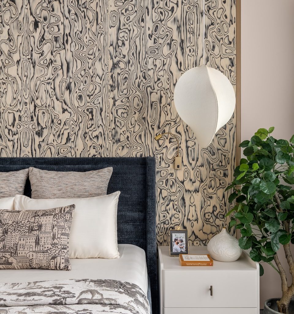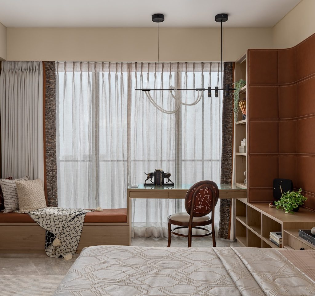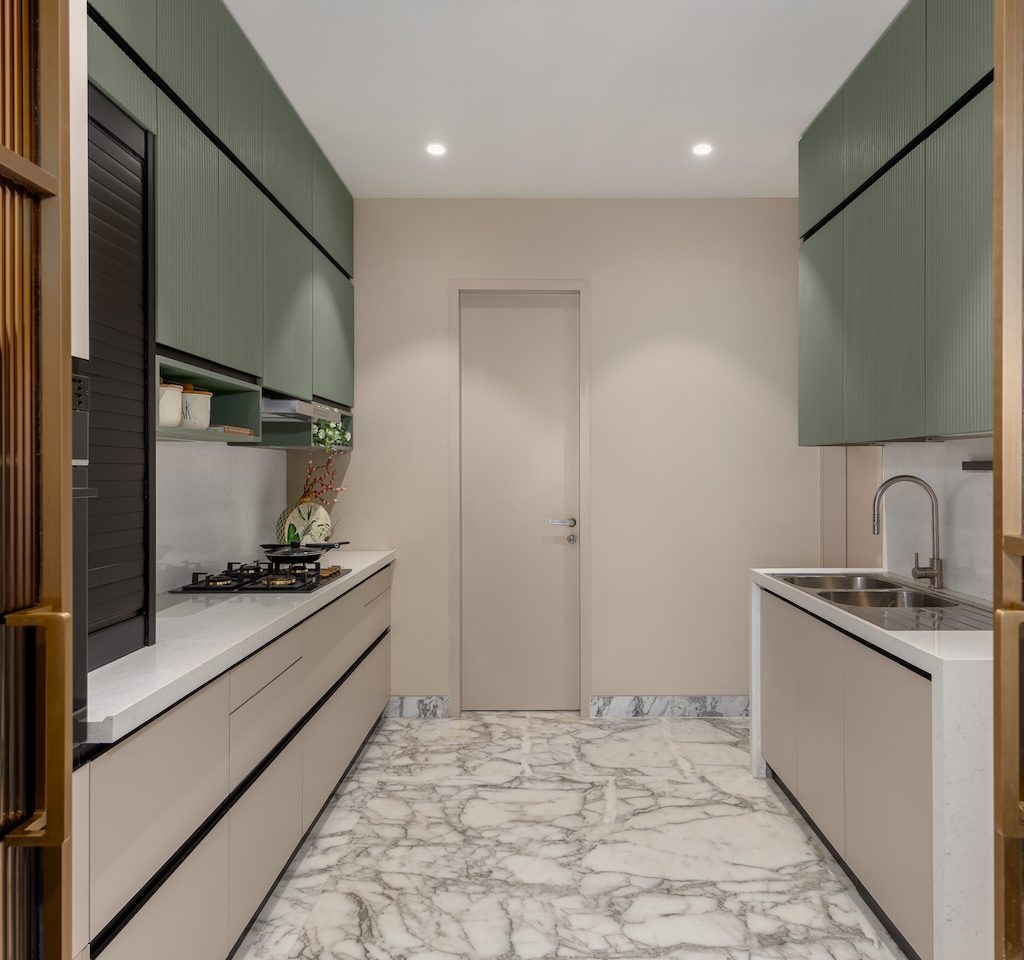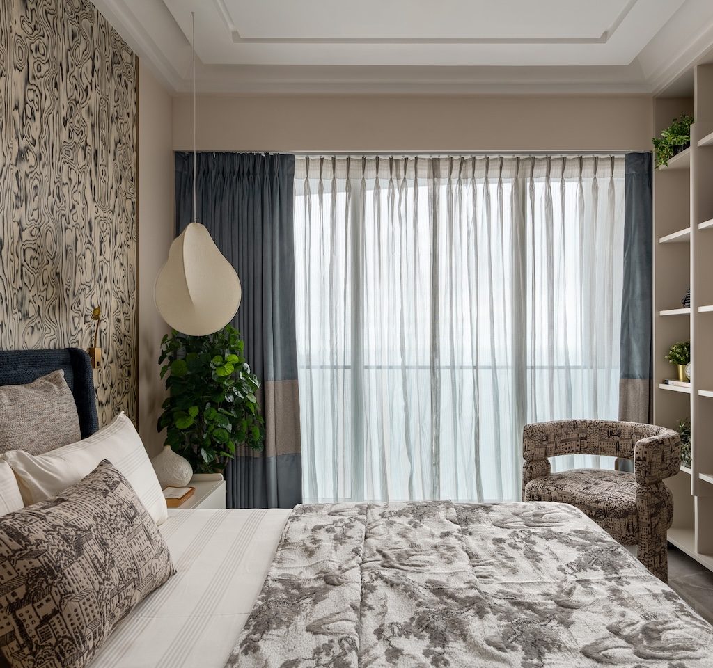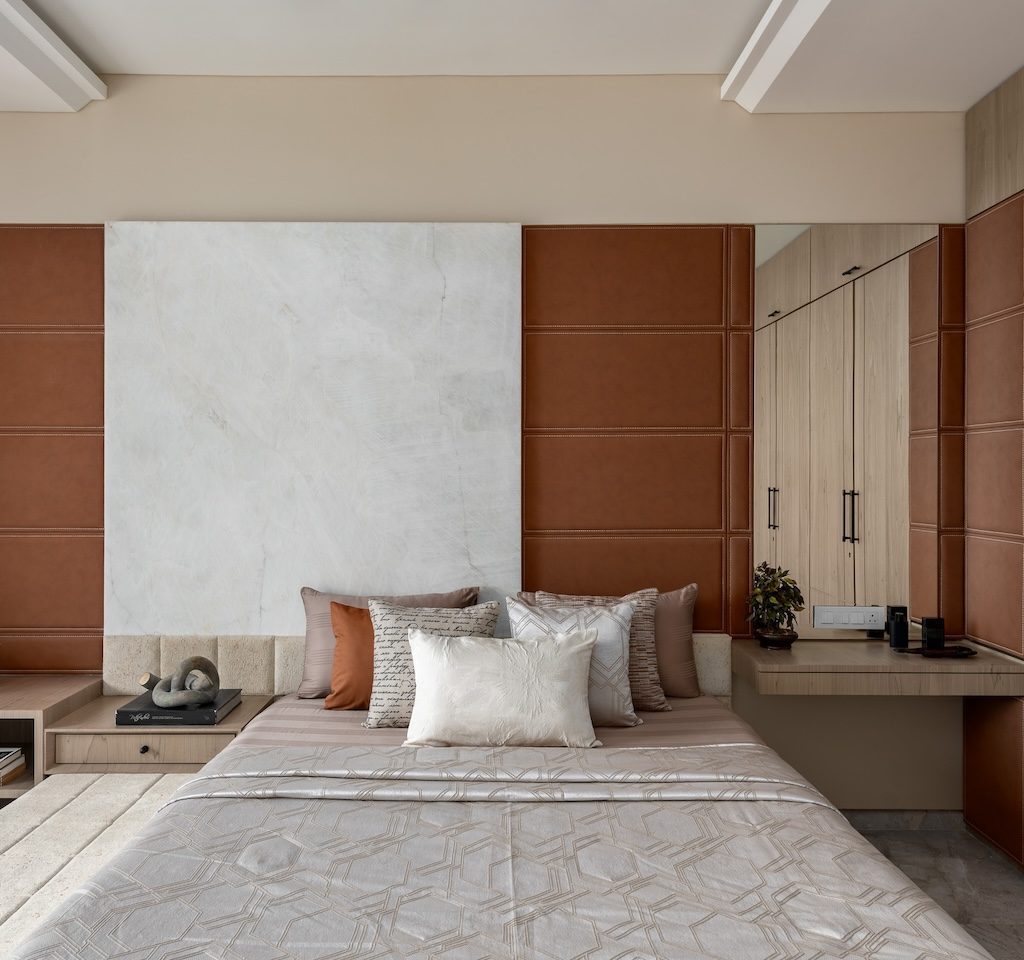 The dining room is carved out as a snug yet elegant extension of the living space, anchored by Havana Green quartzite enhanced with custom hand-painted artwork. Bedrooms are conceived as distinct narratives. The master bedroom draws from a memory of a frangipani tree in full bloom, translated through an embroidered bed back, fluid wardrobe shutters, and a tranquil palette accented with teal and blush. The son’s bedroom adopts a bolder, more contemporary language through backlit stone, dyed veneer, leather, and black accents, while the guest bedroom introduces contrast through high-veneer finishes and Prussian blue tones. The kitchen remains contemporary and efficient, connected through fluted glass doors that allow openness or separation as required.