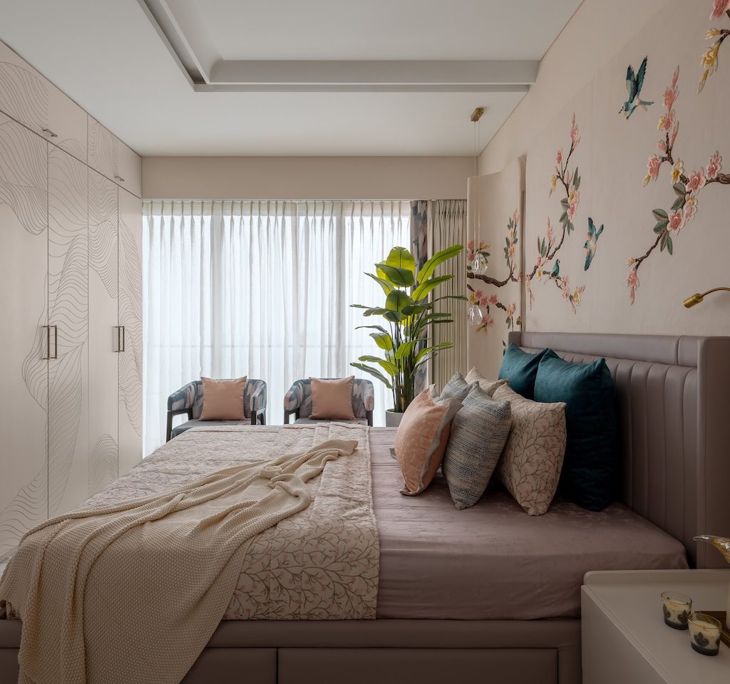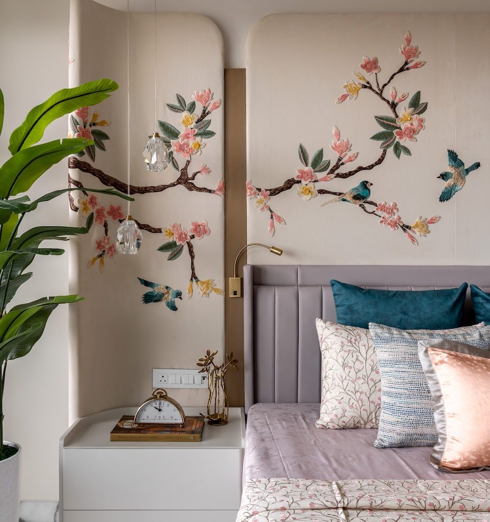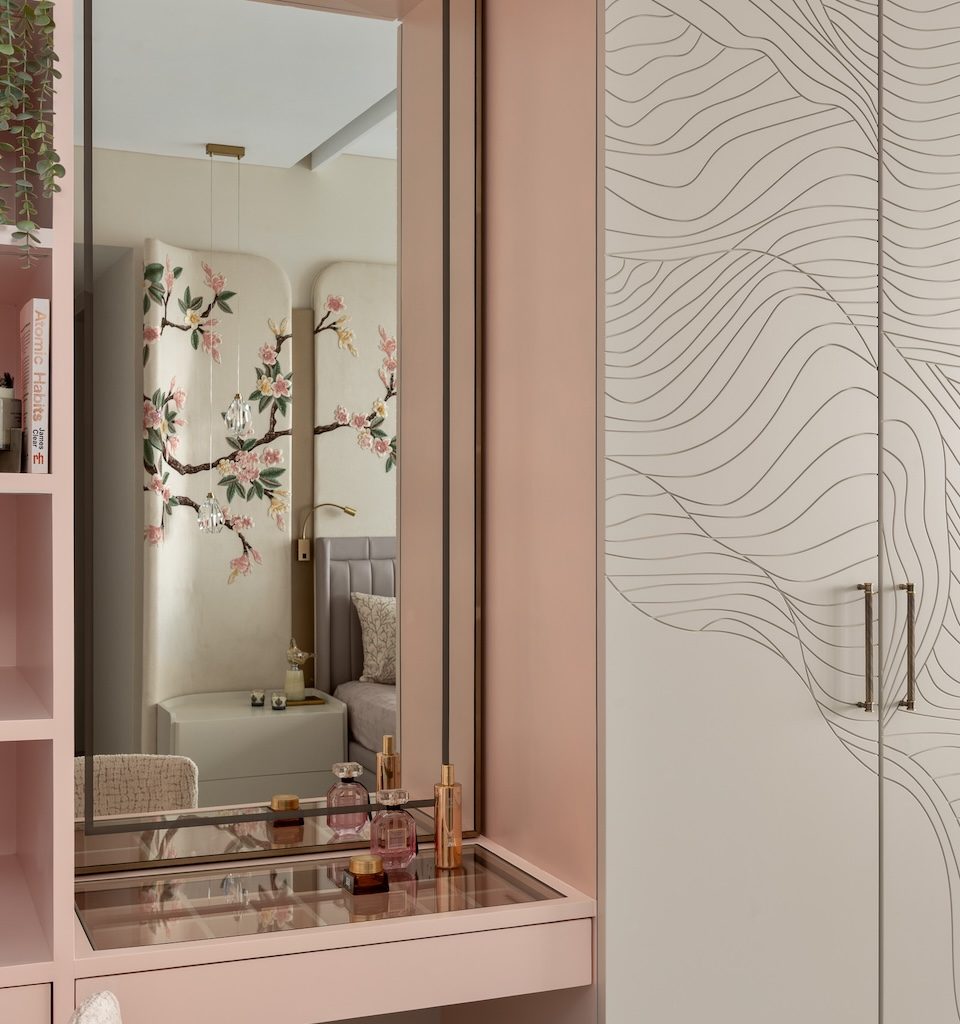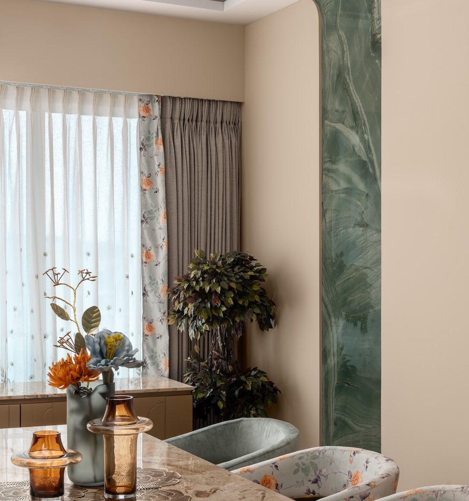 Bespoke artistic interventions stand out as defining moments across the home—from the hand-painted ceiling artwork in the living room to the embroidered master bed back and the customised quartzite dining surface. The fluted glass partition emerges as both a functional and visual anchor, seamlessly integrating storage, circulation, and spatial continuity.
