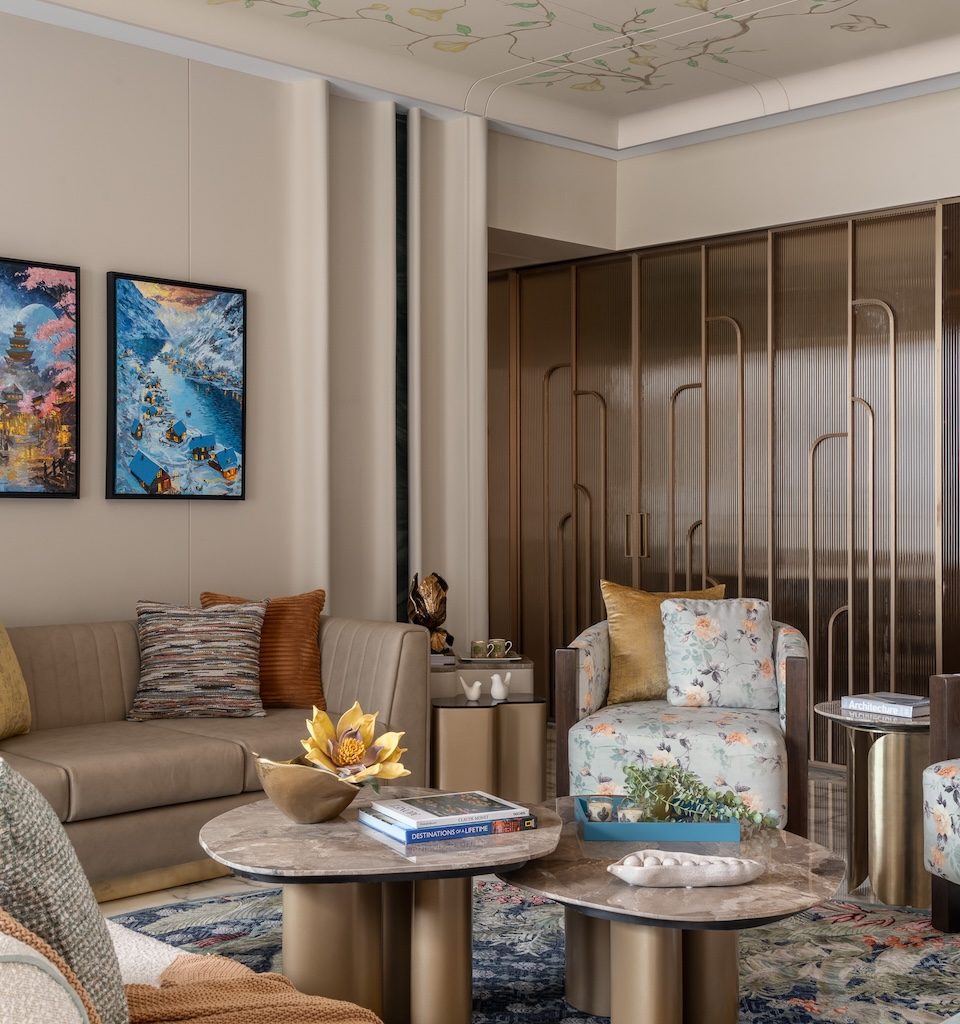 The home unfolds as a continuous sequence of interconnected spaces. The living area forms the heart of the apartment, designed as a generous, modern space layered with subtle textures and refined finishes. A hand-painted biophilic artwork on the ceiling introduces an unexpected moment of pause, reflecting cherished travel memories and adding a personal layer to the room. A fluted glass partition simultaneously conceals storage, connects the living space to the kitchen, and opens into the dining area, reinforcing both functionality and fluidity.