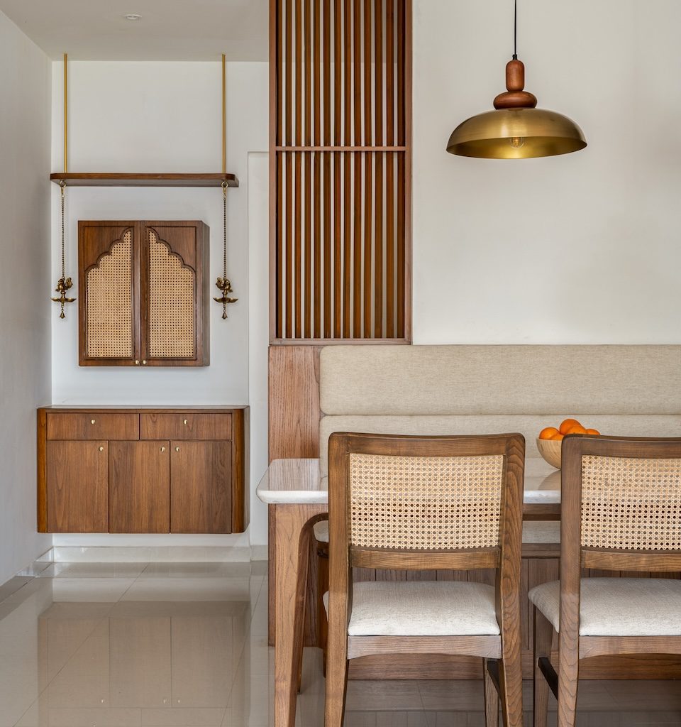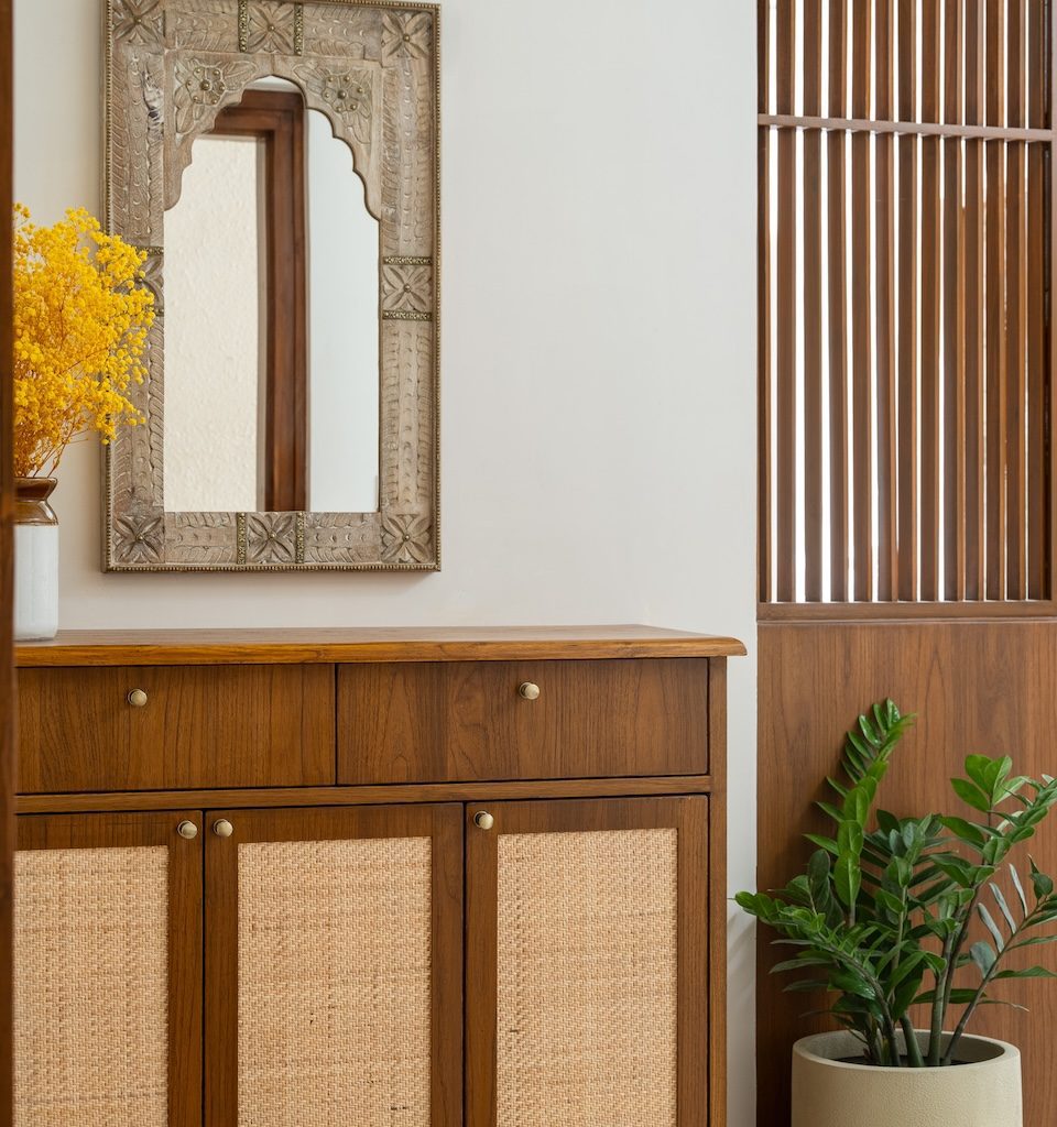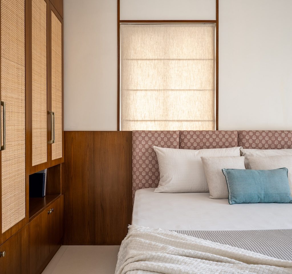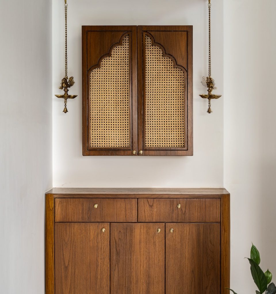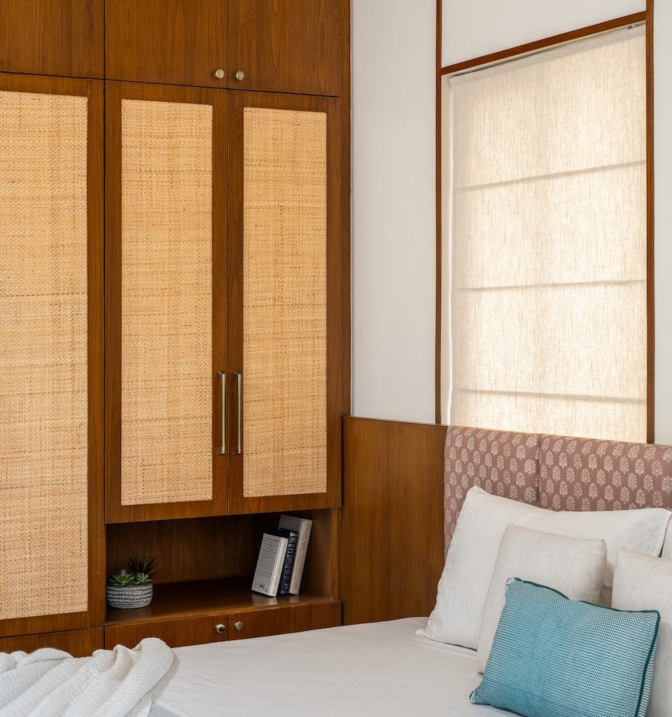 Materiality is central to the home’s identity. Natural and tactile materials such as rattan, cane, and veneer introduce warmth and texture, while earthy tones like terracotta and sage green add depth without overwhelming the interiors. Brass accents appear subtly in lighting and hardware, bringing refinement to the palette. Sheer drapes, neutral upholstery, and patterned tiles balance simplicity with character, ensuring the home feels layered yet restrained.
