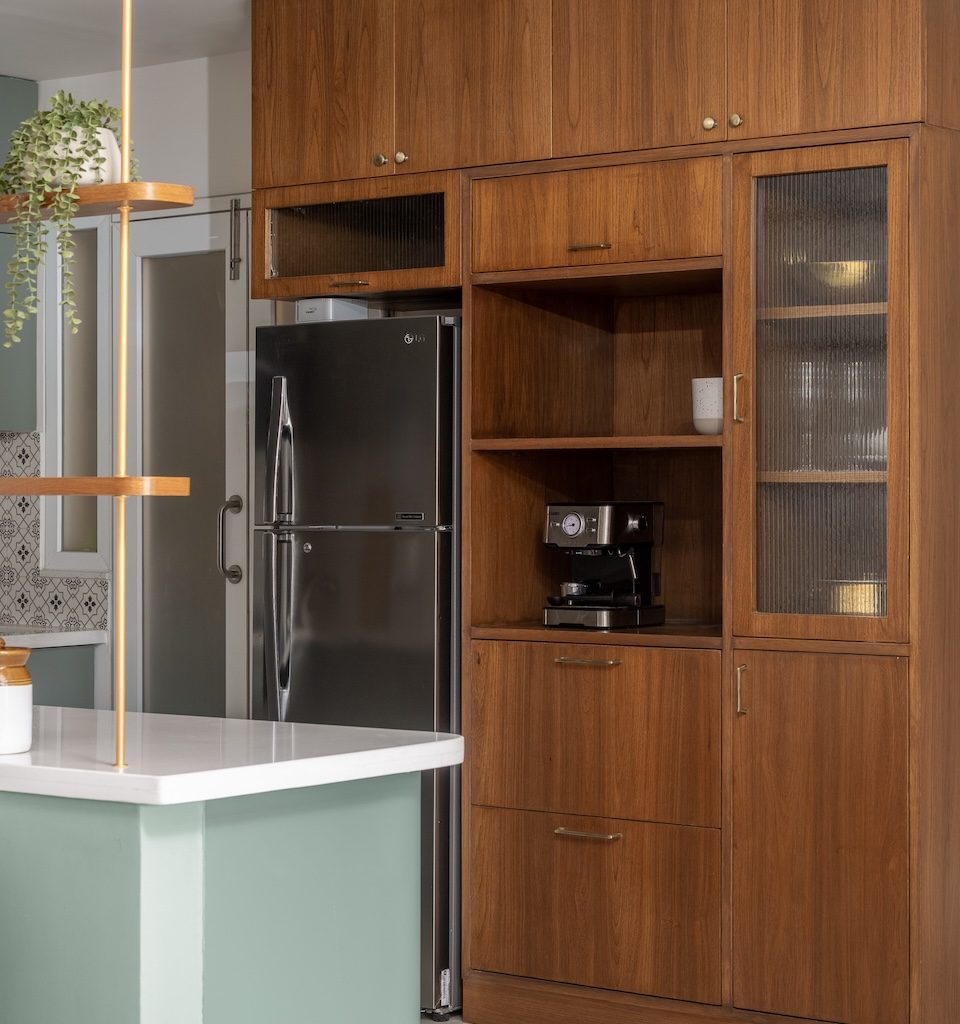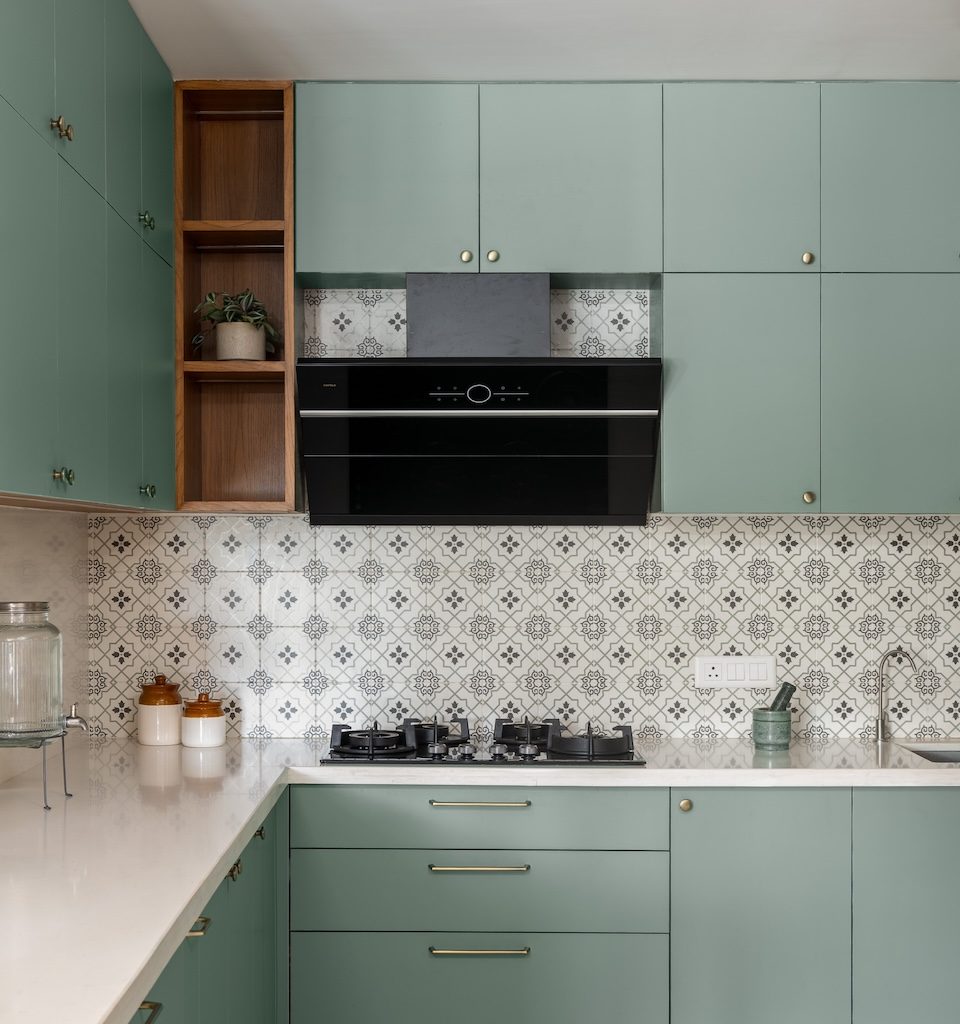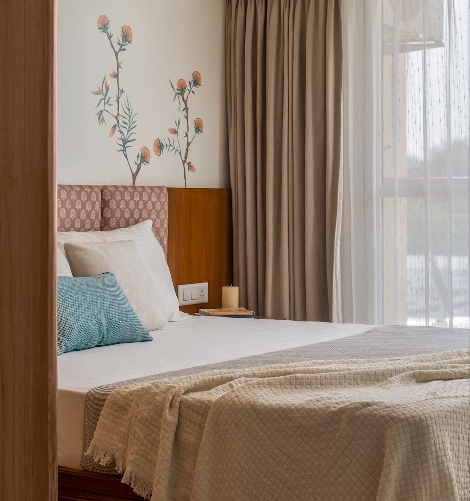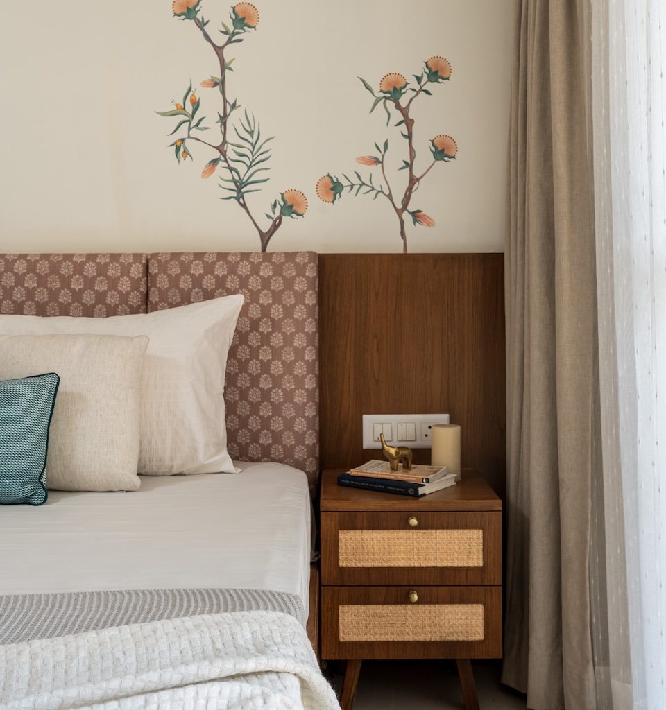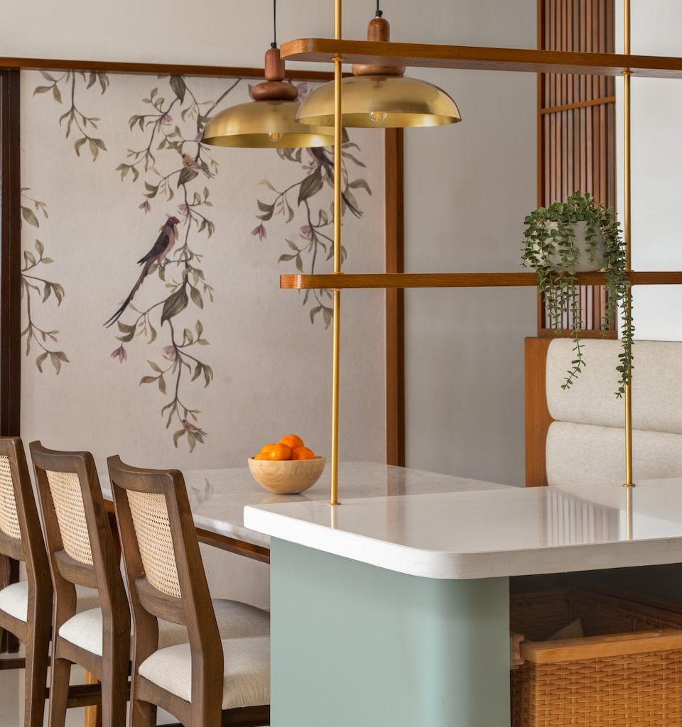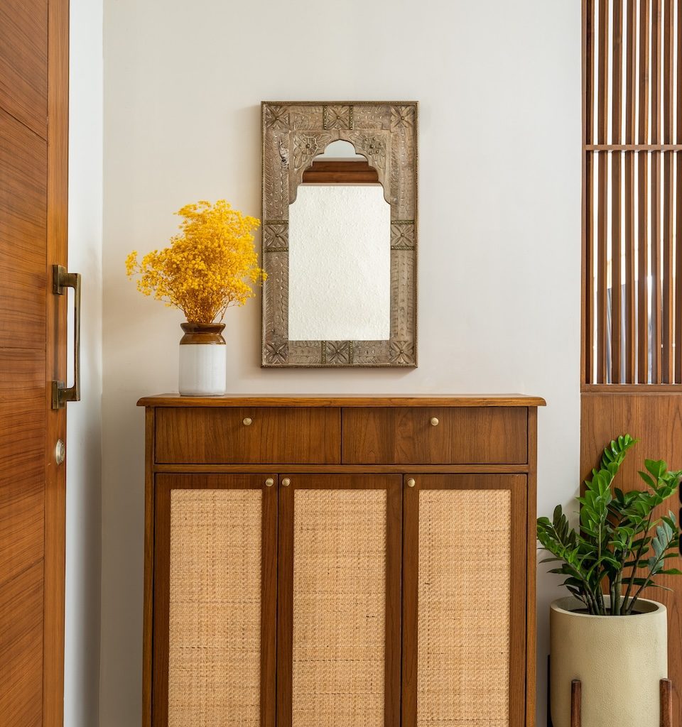 Materiality is central to the home’s identity. Natural and tactile materials such as rattan, cane, and veneer introduce warmth and texture, while earthy tones like terracotta and sage green add depth without overwhelming the interiors. Brass accents appear subtly in lighting and hardware, bringing refinement to the palette. Sheer drapes, neutral upholstery, and patterned tiles balance simplicity with character, ensuring the home feels layered yet restrained.