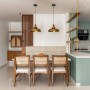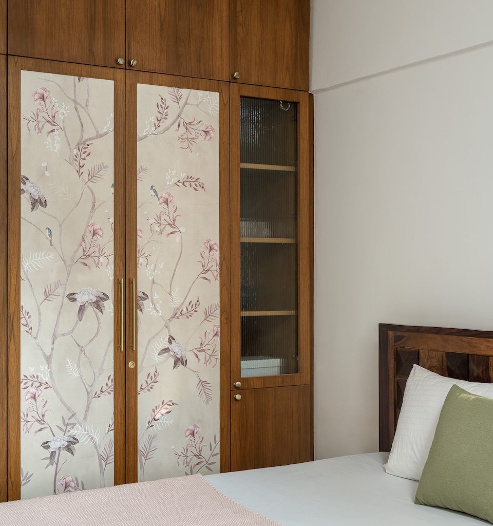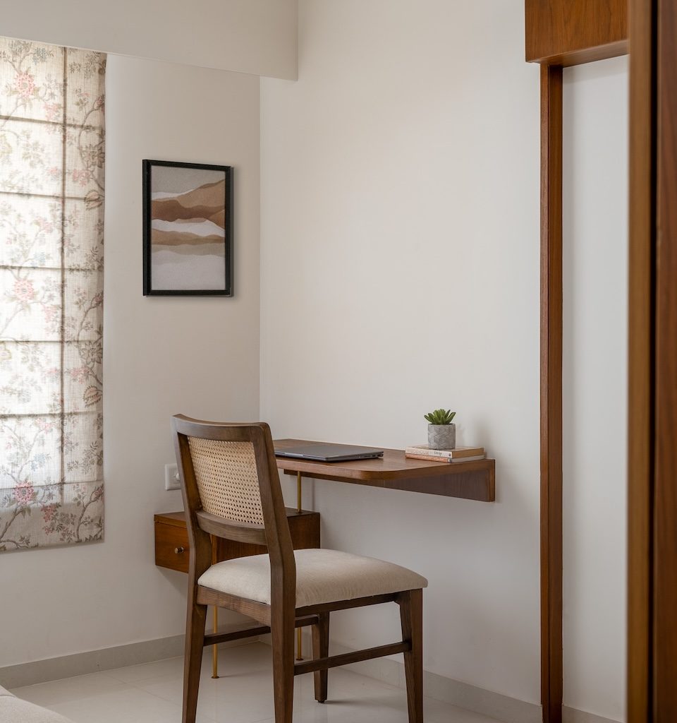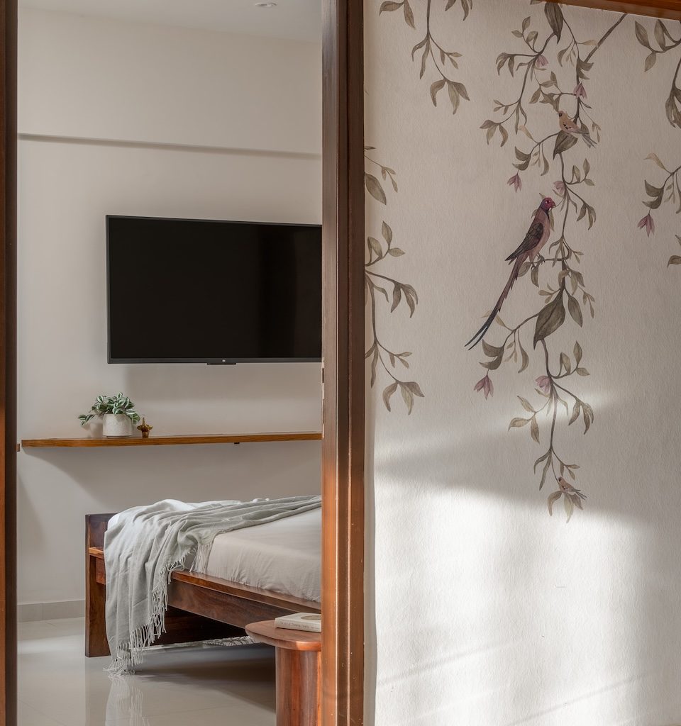 The home unfolds through a carefully choreographed sequence. The entrance sets the tone with tropical wallpaper and soft ambient lighting, creating a warm sense of arrival. A compact puja unit crafted in rattan and natural veneer anchors the foyer, introducing a moment of quiet spirituality. From here, the space opens into the living and dining area, conceived as a shared zone that encourages interaction. A terracotta-coloured feature wall visually and spatially unifies these areas, lending warmth and cohesion. The bedrooms are positioned as quieter, more private retreats, with one room designed to double as a lounge and study, allowing flexibility within the home.