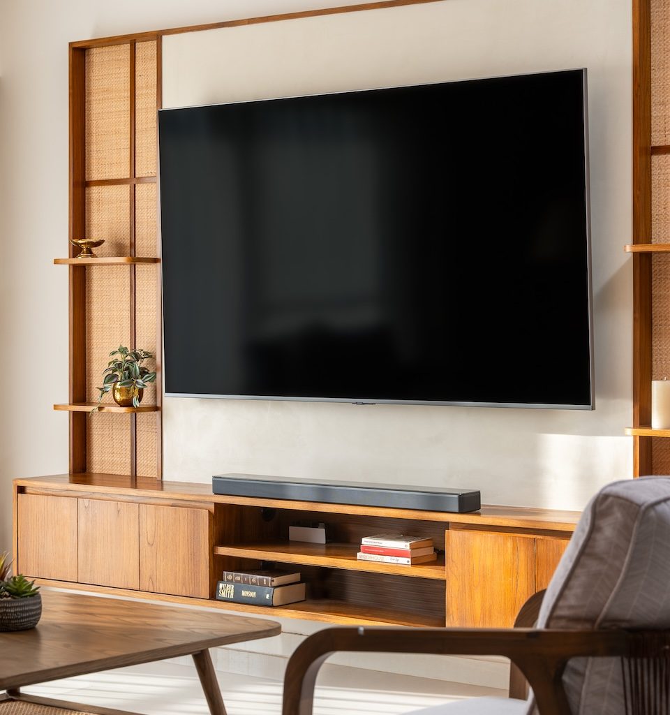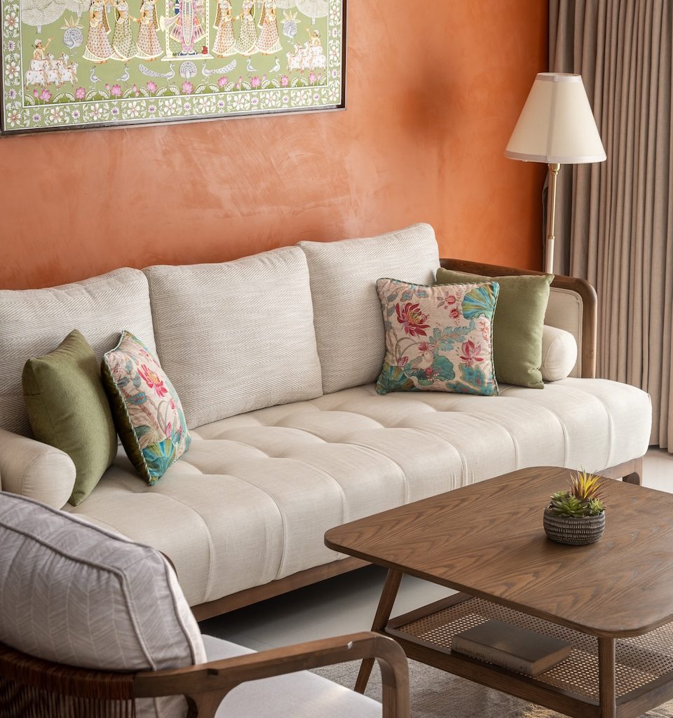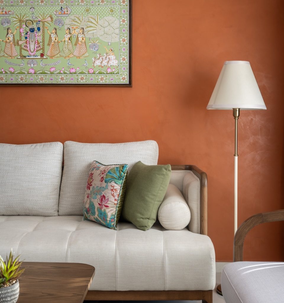 The terracotta feature wall stands out as a defining element, anchoring the living and dining areas while fostering a sense of togetherness. The living room is bathed in natural light, with neutral-toned furniture and sheer drapes maintaining an airy atmosphere. A traditional Pichwai painting above the sofa introduces cultural depth, while the TV unit—finished in natural wood with rattan panelling—adds understated charm. Together, these elements create a space that feels both personal and enduring.