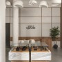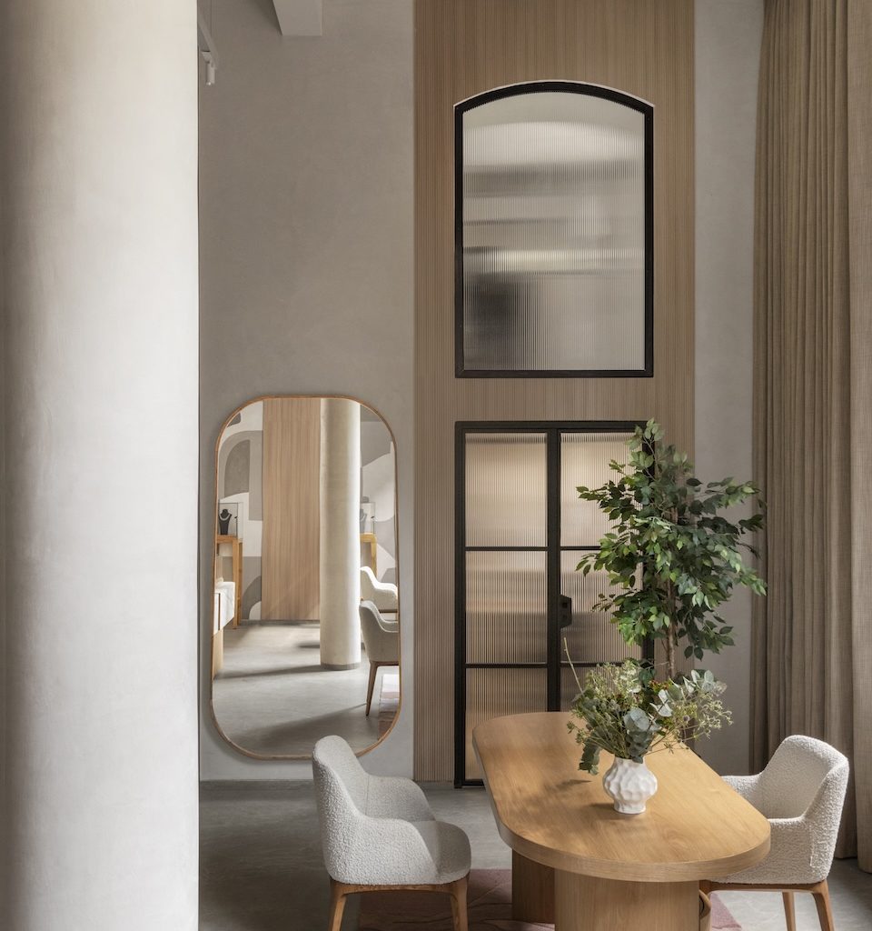 The reception area sets the tone for what follows. Here, a curvilinear white sofa by Bareeki, a wooden table by Josmo Studio, and a hand-tufted rug by Loops by LJ, inspired by the rhythmic patterns of tree rings, come together in an earthy, composed arrangement. Stone flooring, lime-plastered walls, and warm wooden detailing establish a sense of balance, while finishes by Nexion, Neocoats, and MCM Cladding lend subtle refinement.