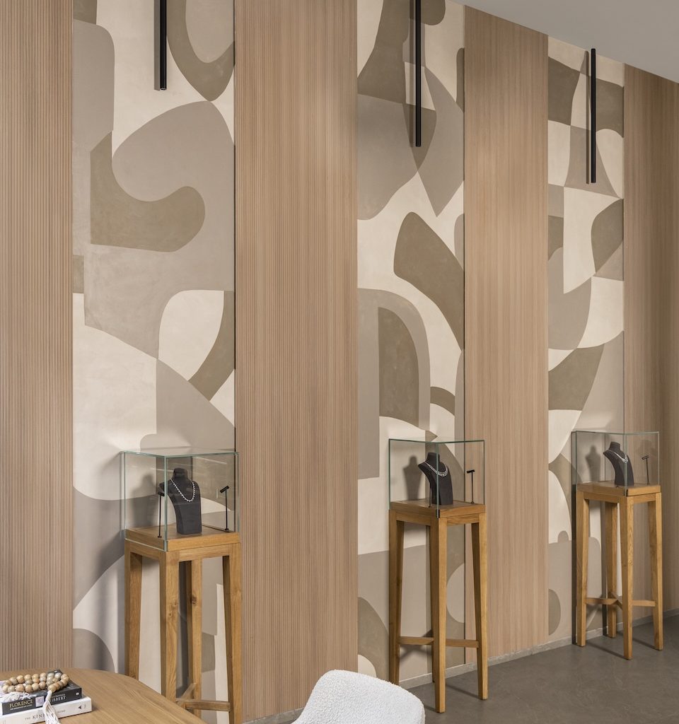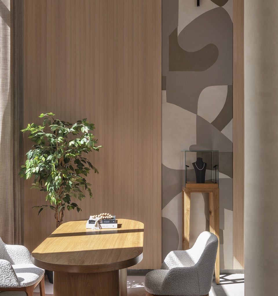 Natural oak fluting by Magvee introduces warmth and rhythm, while subtly accentuating the double-height volume of the interiors. To complete the spatial composition, Aashni introduced a hand-painted mural by artist Rudranee Chiman after the store’s completion. Rendered in organic, flowing forms and soft tones of beige, taupe, and brown, the mural emerged as a defining backdrop. “It was the missing element,” she says. “The mural brings depth and movement, adding an artistic layer without overpowering the calmness of the space.”