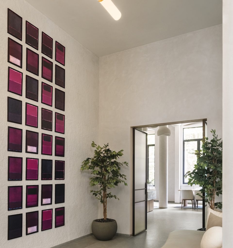 Lush greenery introduces an element of calm, while the brand’s signature red appears with restraint through a gradient art wall in shades of pink, red, and burgundy, featuring abstract compositions inspired by Mark Rothko. “Red conveys strength,” explains Aashni. “We wanted it to act as a focal point and storytelling element, introducing vibrancy without disrupting the serene mood of the interiors.”
