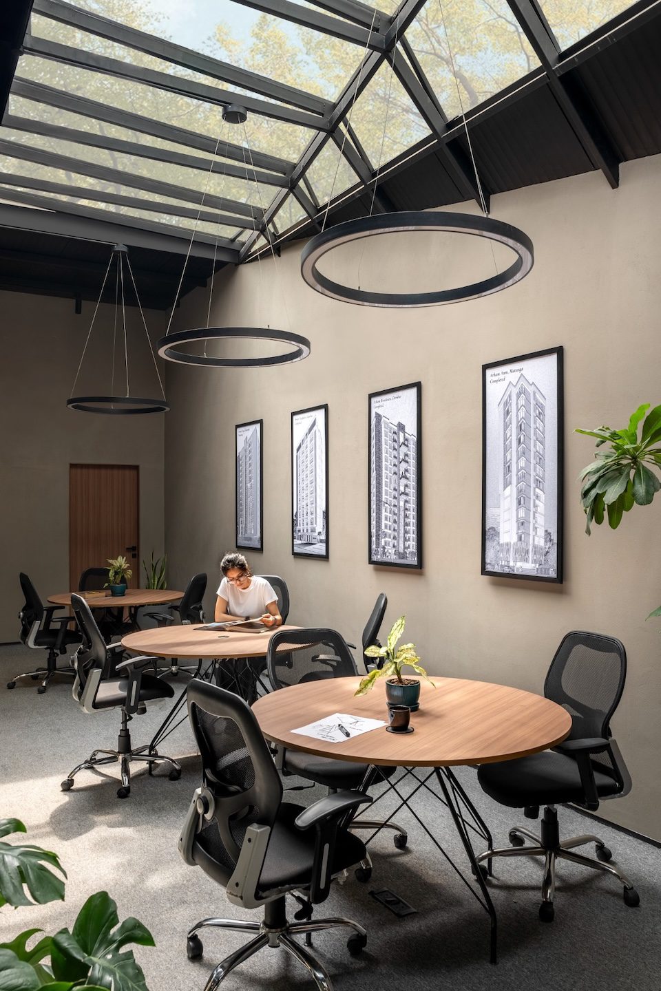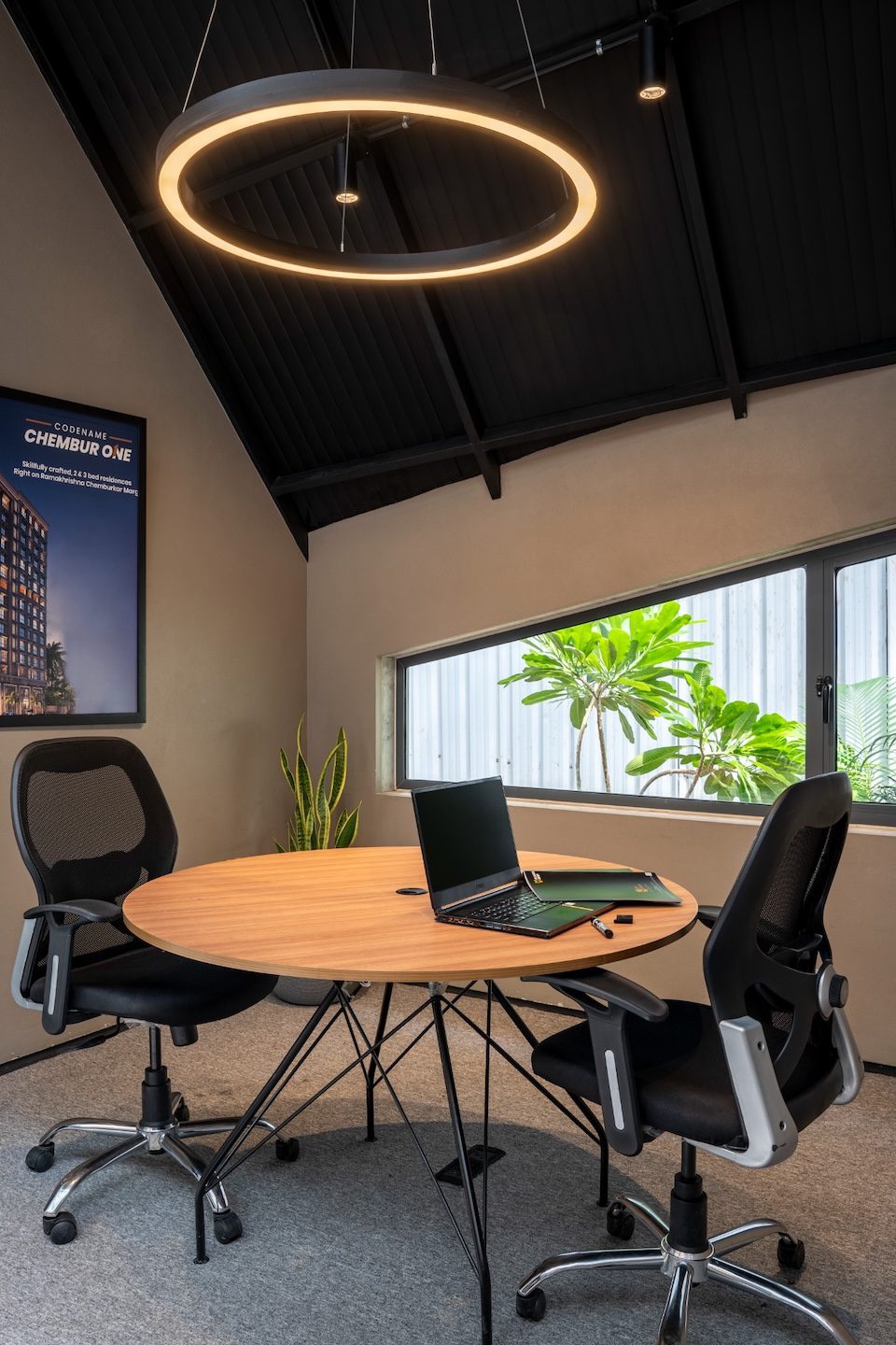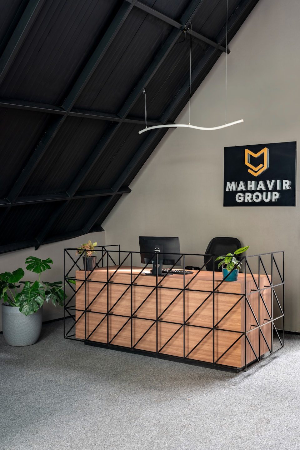 The reception desk, crafted in laminate and plywood with a metal framework, subtly references Mahavir Group’s real estate identity while retaining a restrained, contemporary aesthetic. A custom circular meeting table with modular legs reinforces flexibility, enabling assembly and disassembly as needed. Suspended lights positioned above the tables create focused illumination and intimate zones, visually aligning with the linear skylight above.