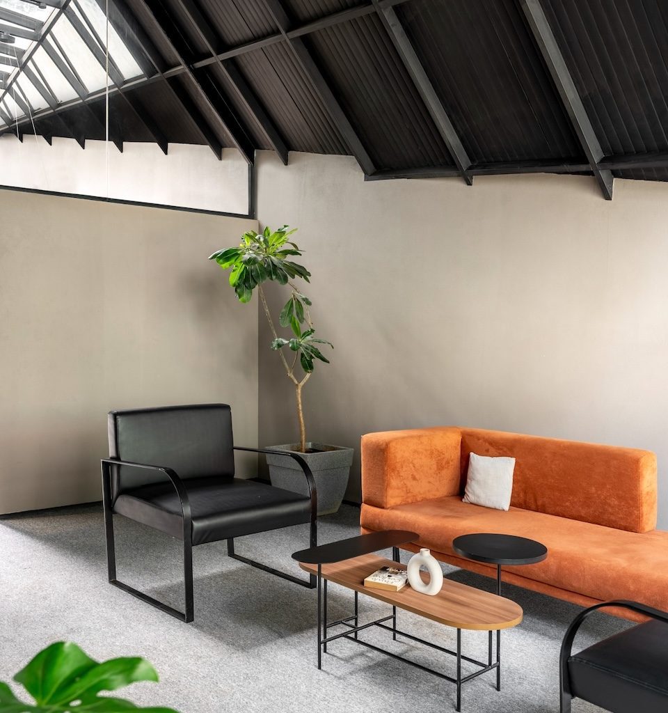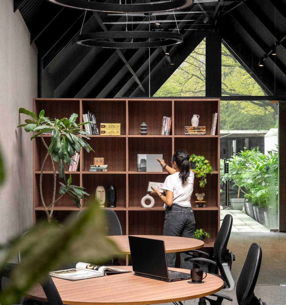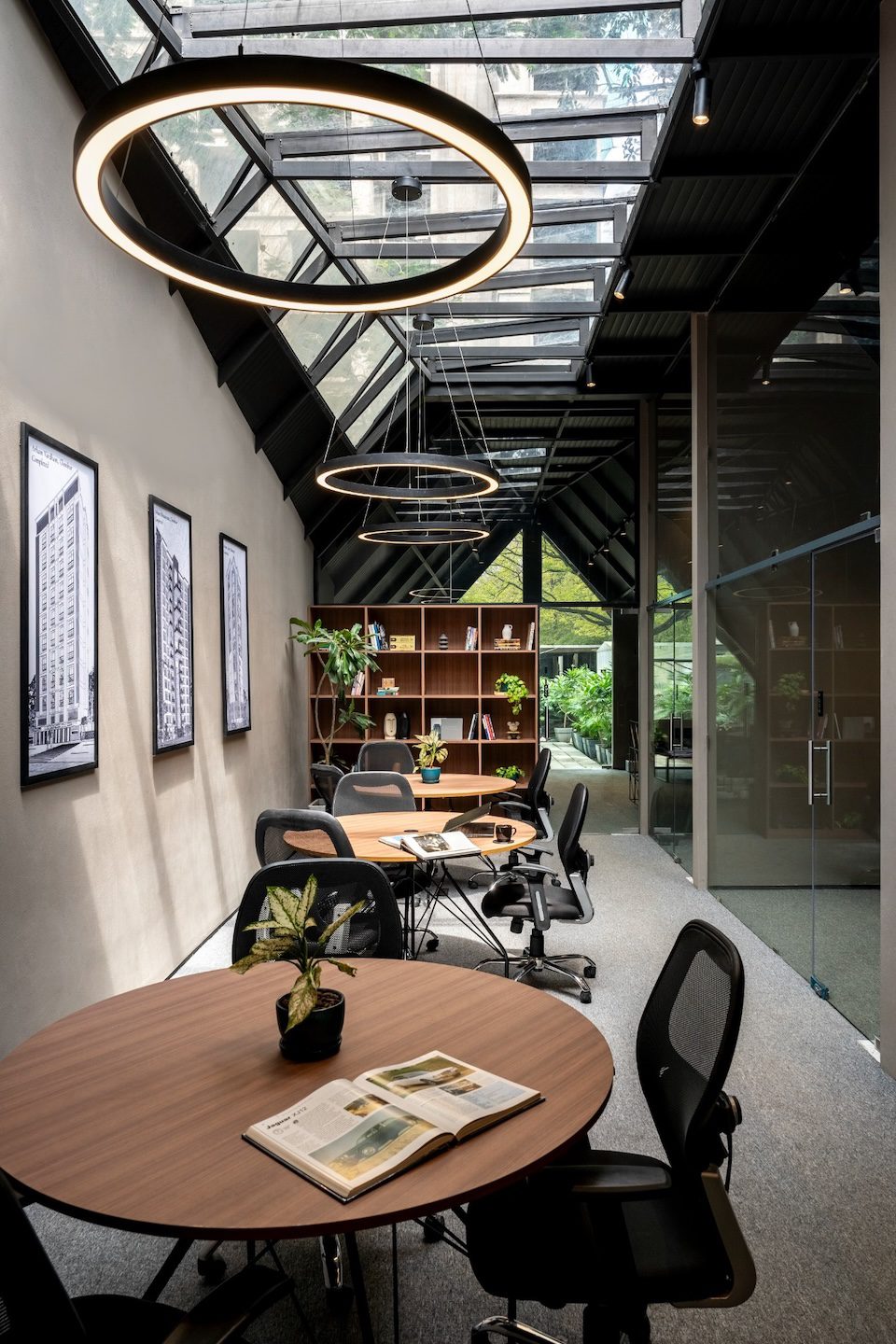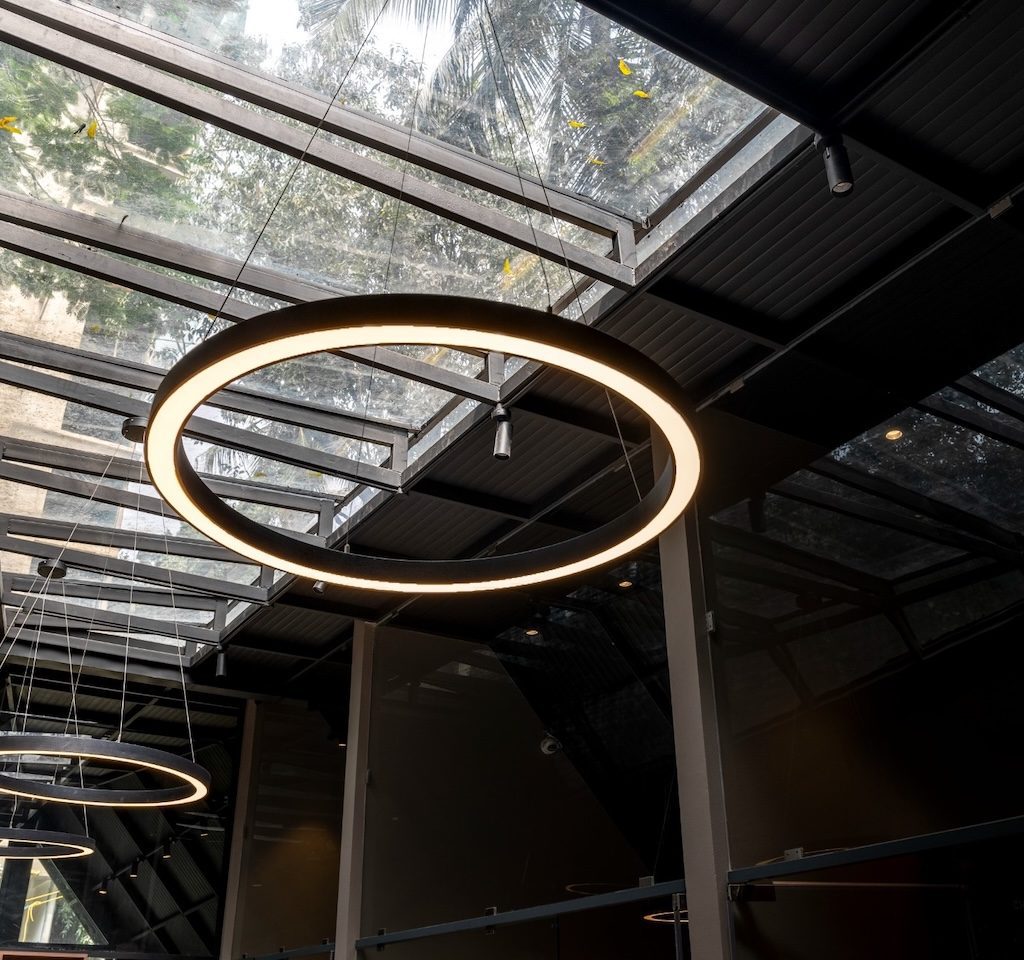 The reception desk, crafted in laminate and plywood with a metal framework, subtly references Mahavir Group’s real estate identity while retaining a restrained, contemporary aesthetic. A custom circular meeting table with modular legs reinforces flexibility, enabling assembly and disassembly as needed. Suspended lights positioned above the tables create focused illumination and intimate zones, visually aligning with the linear skylight above.