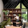 The ceiling exposes the steel roof framework, with visible bolts and joinery left intentionally apparent to underscore the demountable logic of the construction. Windows depart from conventional rectangular openings, instead taking on angular, faceted forms that echo the folded roof geometry. These inclined apertures are especially significant in the private meeting areas, where controlled daylight and ventilation are required without compromising privacy. Their orientation allows deeper light penetration, minimises glare from adjacent buildings, and facilitates airflow within enclosed zones.