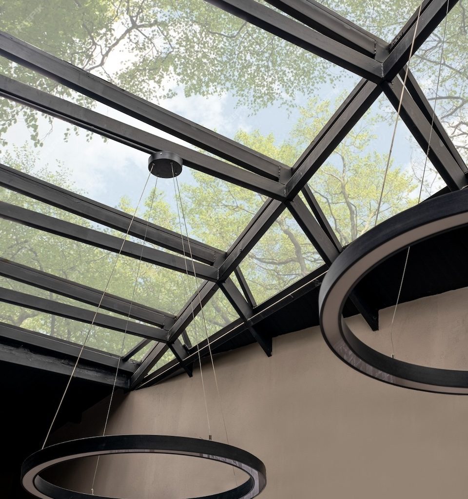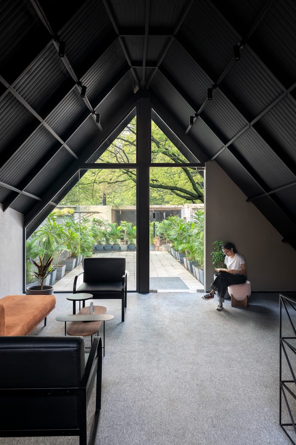 Its defining gesture is the folded roof geometry, which lends the pavilion a distinct visual identity within its constrained surroundings. More than a formal expression, the roof operates as an environmental instrument. It draws in daylight, filters illumination, and allows light to become the primary spatial generator within a site limited by adjacent buildings. In doing so, it reduces reliance on artificial lighting while giving the interiors depth, variation, and character.