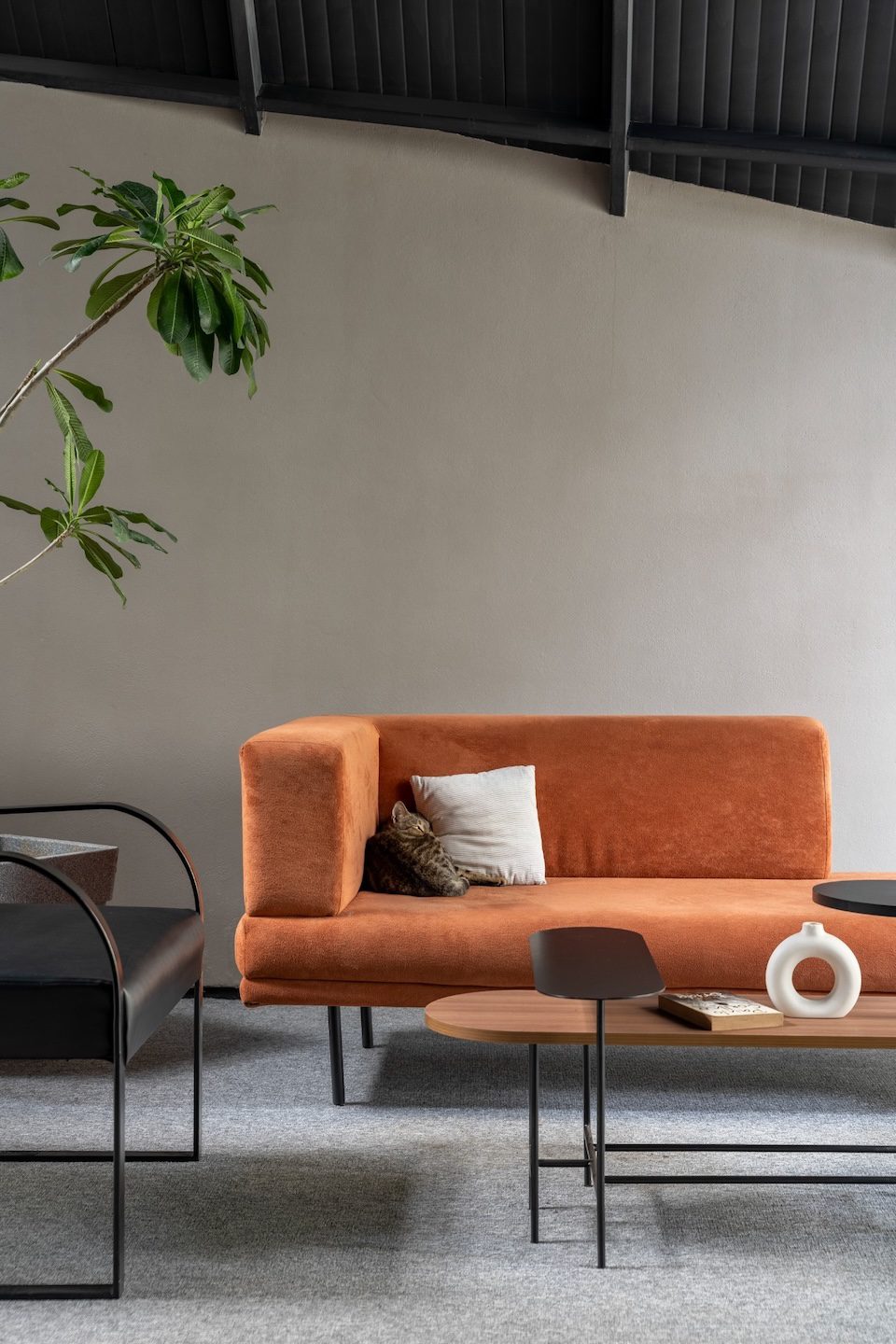 Underfoot, carpeted flooring improves acoustics within the lightweight shell, reducing reverberation and fostering a quieter, more comfortable environment for client interactions. Walls are finished in textured paint that achieves a raw, concrete-like expression without the weight or permanence of cast material—an approach that aligns with the pavilion’s temporary yet deliberate character.