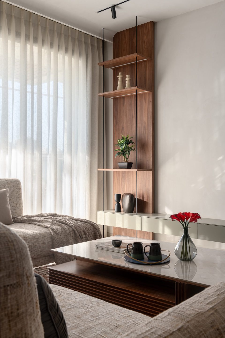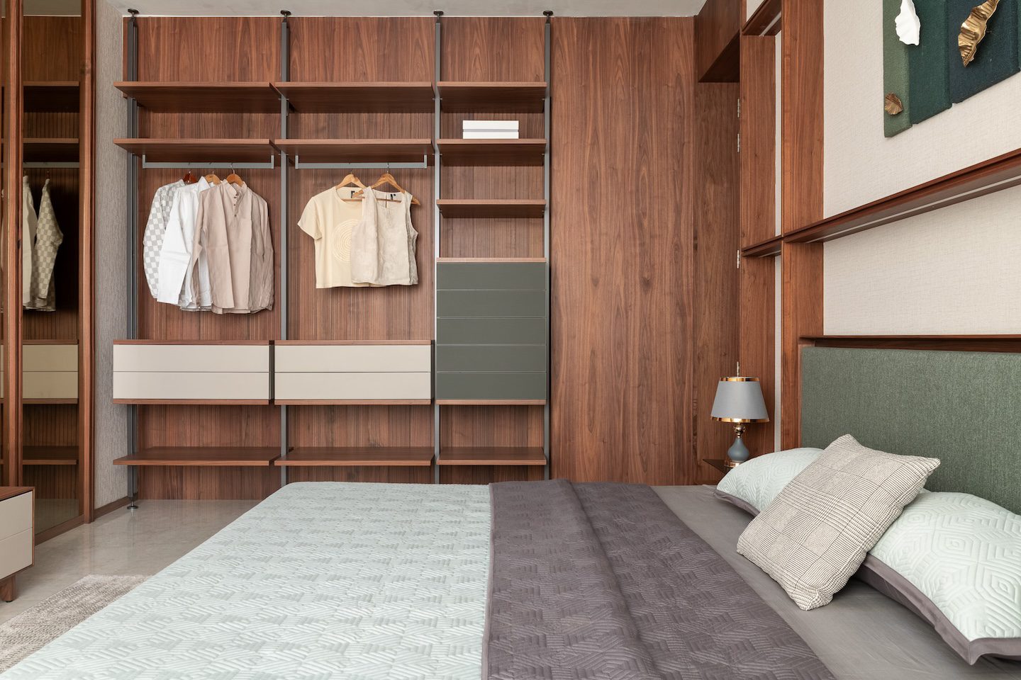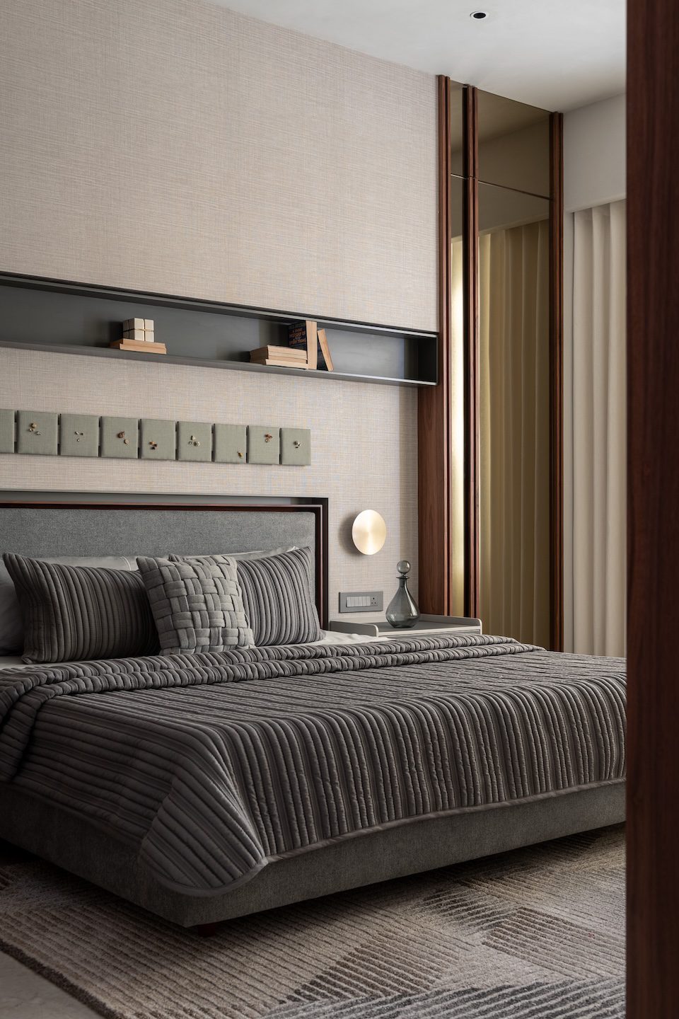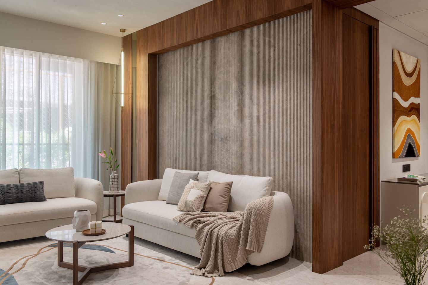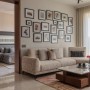 In the living area, neutral upholstered seating pairs with textured wall backdrops and hand-painted frames. Suspended veneer shelves at the TV unit display artefacts, while textured rugs and soft furnishings enhance warmth. The bedroom adopts soft finishes, upholstered headboards, and warm wood accents to create a serene retreat. The wardrobe features custom modular storage with veneer finishes and integrated lighting that emphasises both functionality and organisation.
