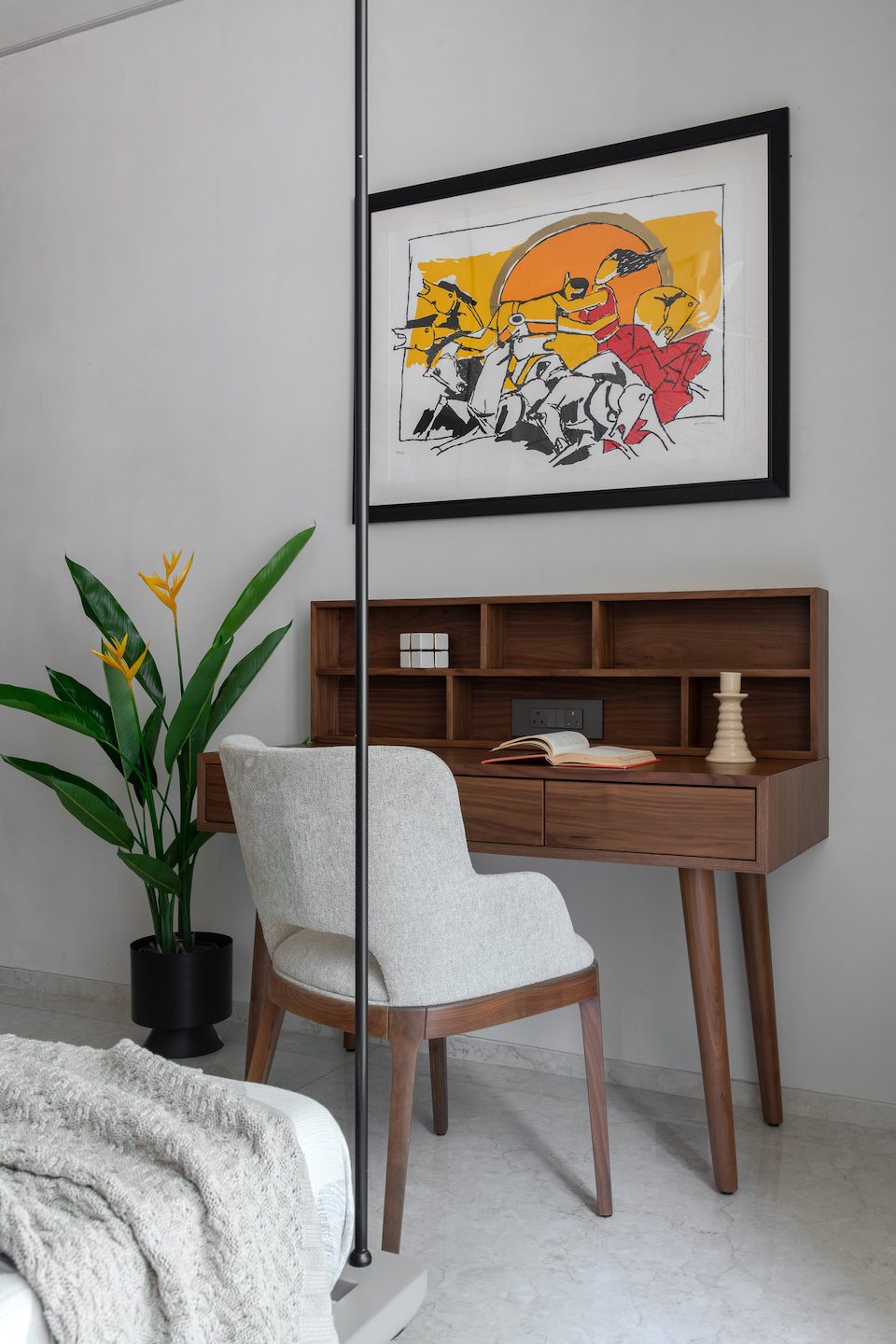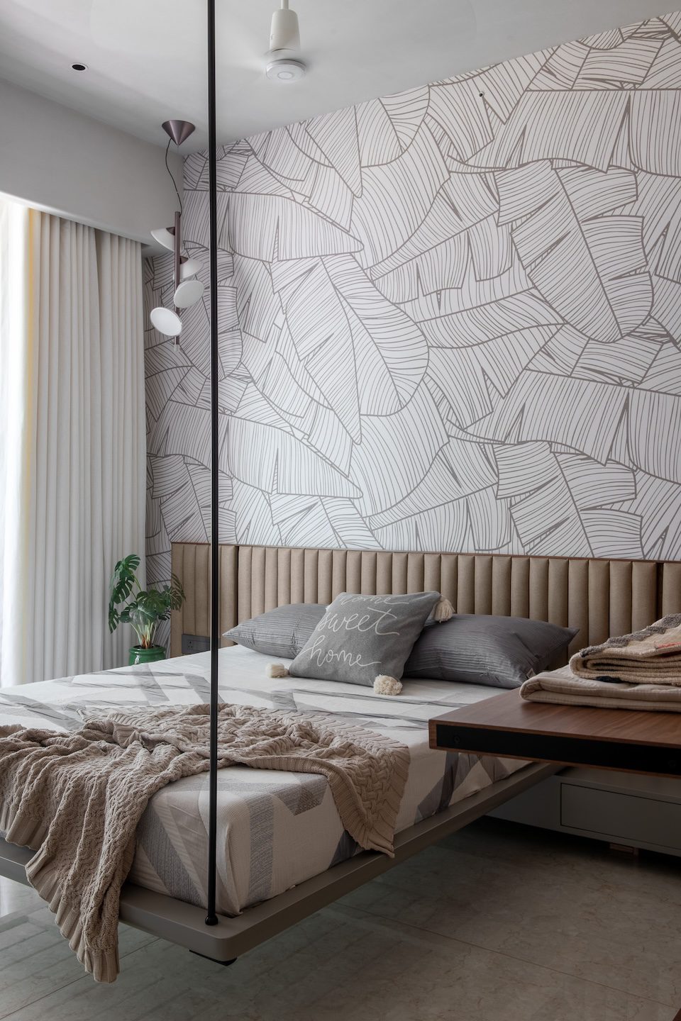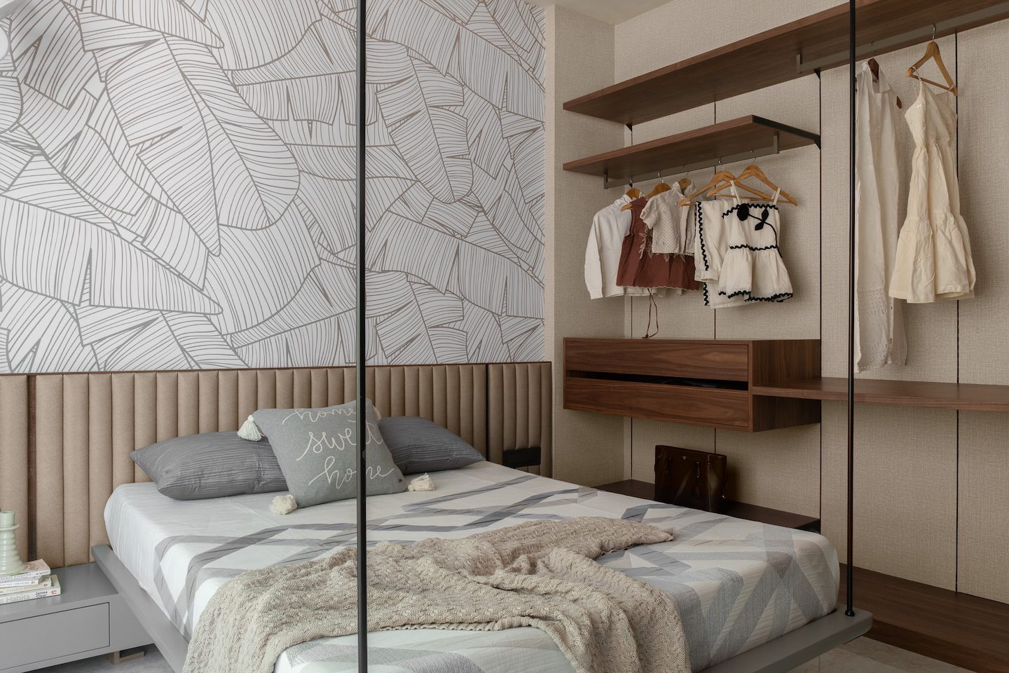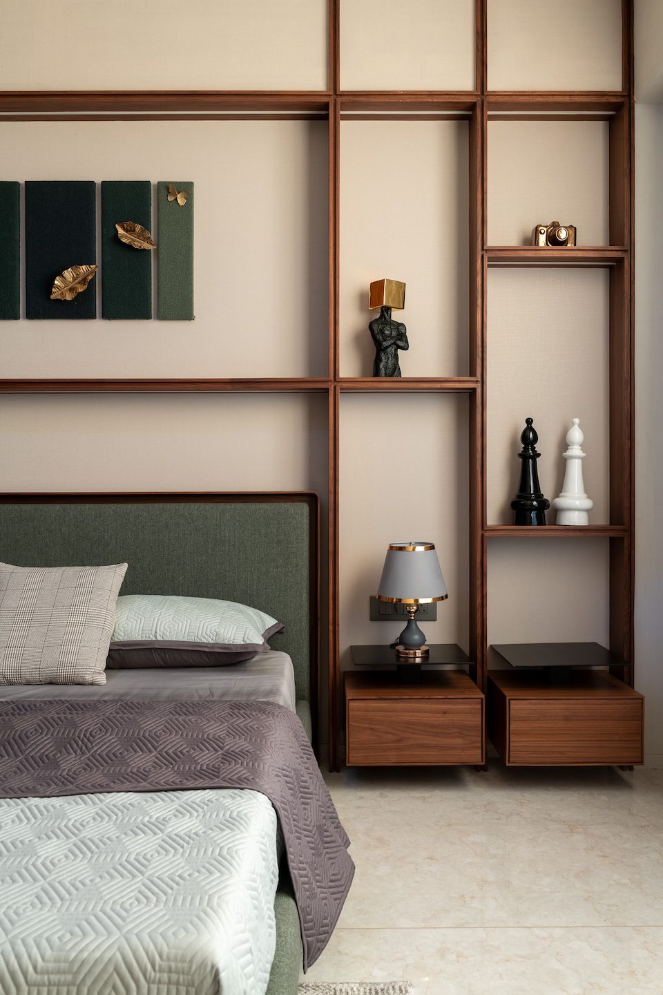 In the living area, neutral upholstered seating pairs with textured wall backdrops and hand-painted frames. Suspended veneer shelves at the TV unit display artefacts, while textured rugs and soft furnishings enhance warmth. The bedroom adopts soft finishes, upholstered headboards, and warm wood accents to create a serene retreat. The wardrobe features custom modular storage with veneer finishes and integrated lighting that emphasises both functionality and organisation.