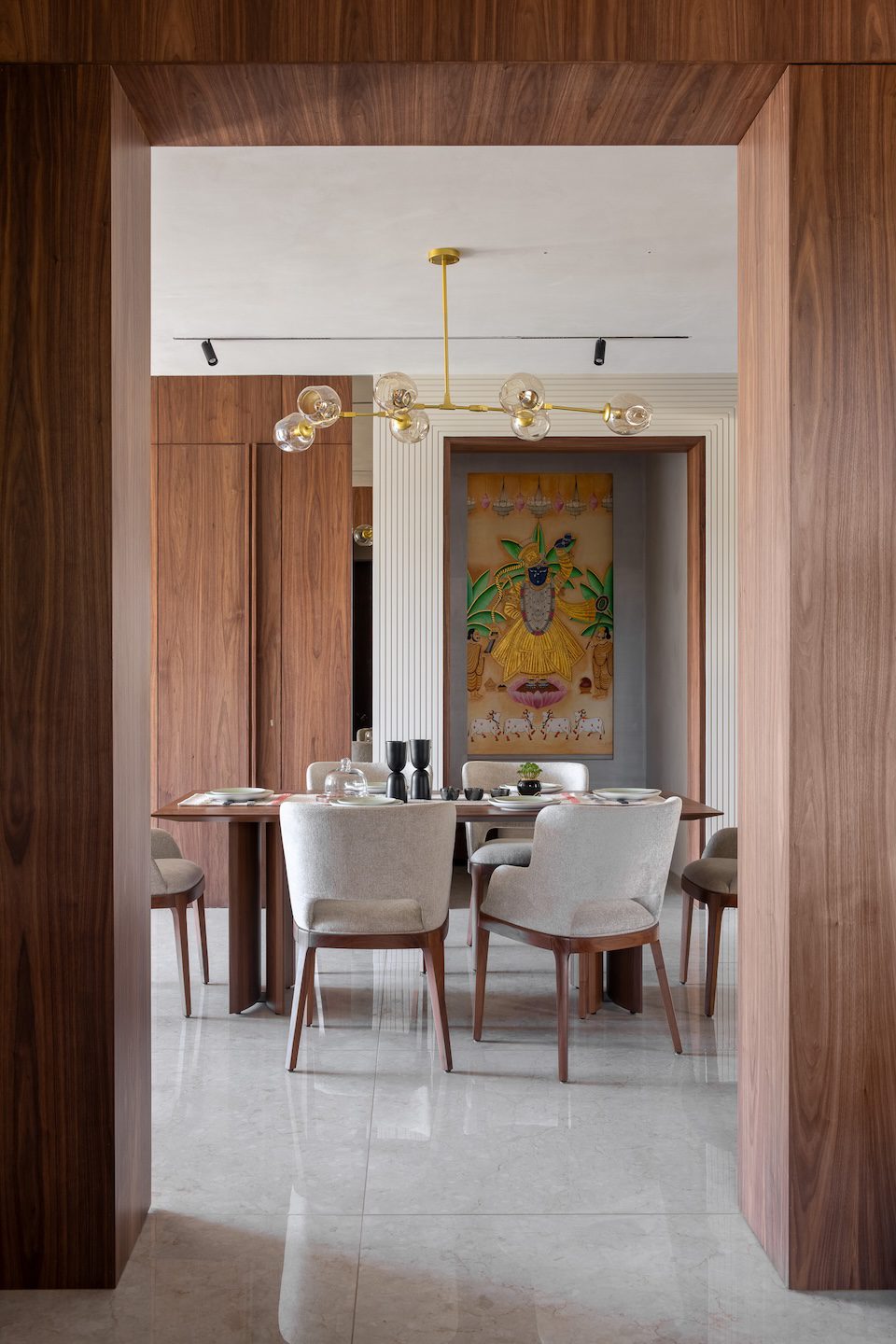 In the drawing room, a neutral-toned sofa sits against a backdrop of fluted Italian marble, layered with a patterned carpet to introduce visual depth. Light-toned sheer curtains filter natural daylight, while natural veneer surfaces bind the space cohesively. The dining area is anchored by upholstered chairs and a contemporary chandelier, with a Shreenathji Pichwai artwork at the temple zone adding a serene cultural layer.
